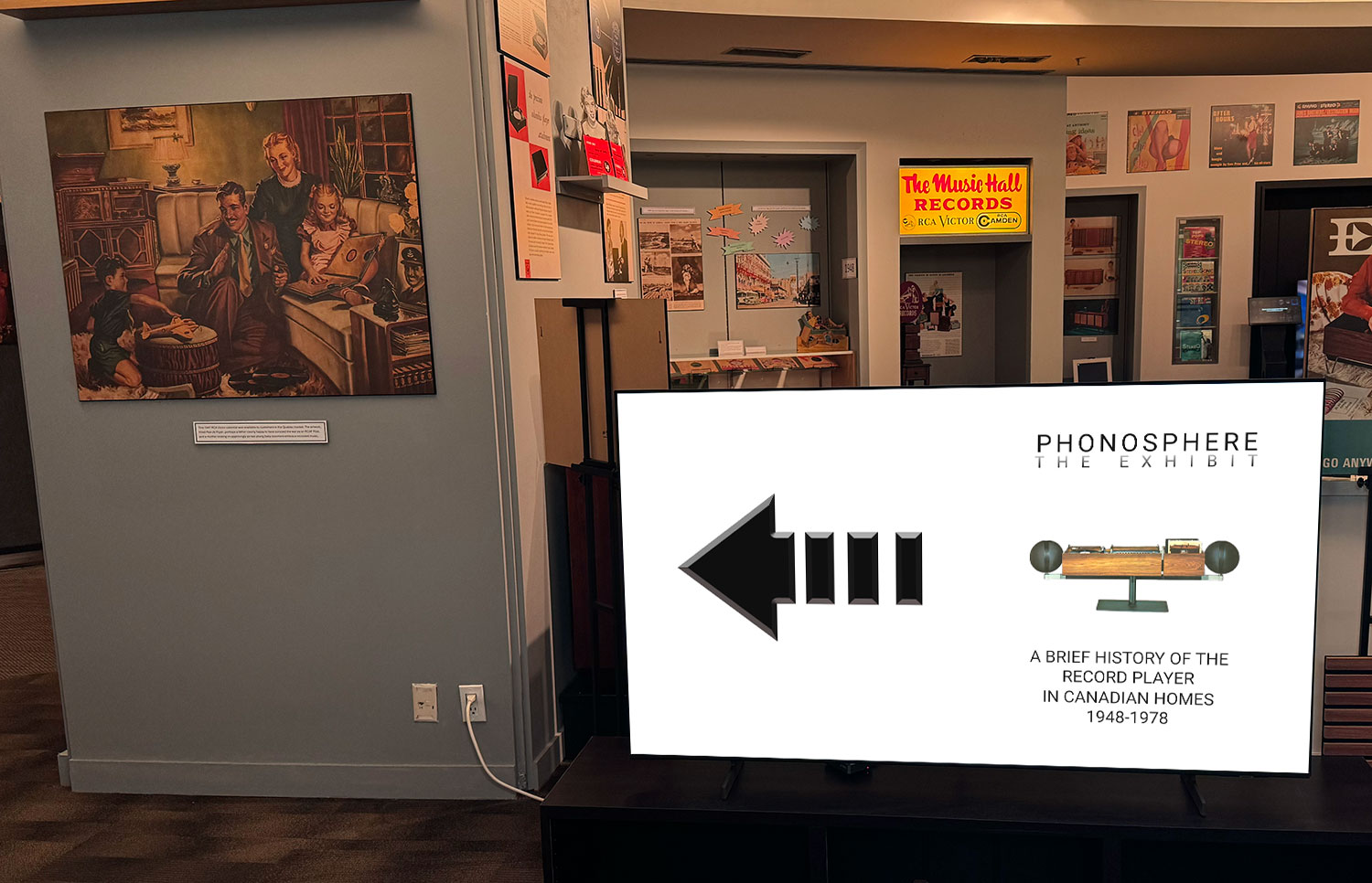 PhonoSphere Exhibition Our first exhibit, PhonoSphere, presents a brief history of the record player in Canadian homes from 1948-1978. Our welcome desk is fashioned after a late 1940s era record store to set the mood for VinylCentric’s first exhibit: PhonoSphere
