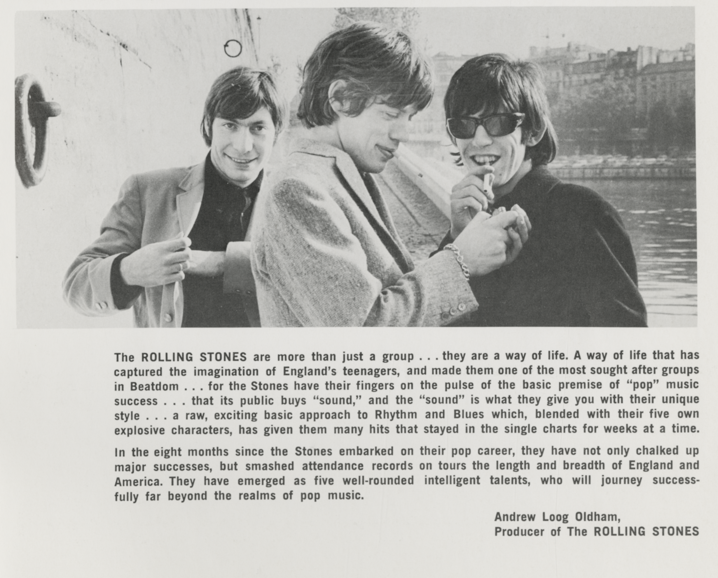 The Rolling StonesThe Rolling Stones The Rolling Stones English rock band This article is about the band. For the magazine, see Rolling Stone. For other uses, see Rolling Stone (disambiguation). The Rolling Stones are an English rock band formed in London in 1962. Active for over six decades, they are one of the most popular, influential, and enduring bands of the rock era. In the early 1960s, the band pioneered the gritty, rhythmically driven sound that came to define hard rock. Their first stable line-up consisted of vocalist Mick Jagger, guitarist Keith Richards, multi-instrumentalist Brian Jones, bassist Bill Wyman, and drummer Charlie Watts, after pianist Ian Stewart was side-lined by their manager Andrew Loog Oldham. During their early years, Jones was the… (Source: Wikipedia)
