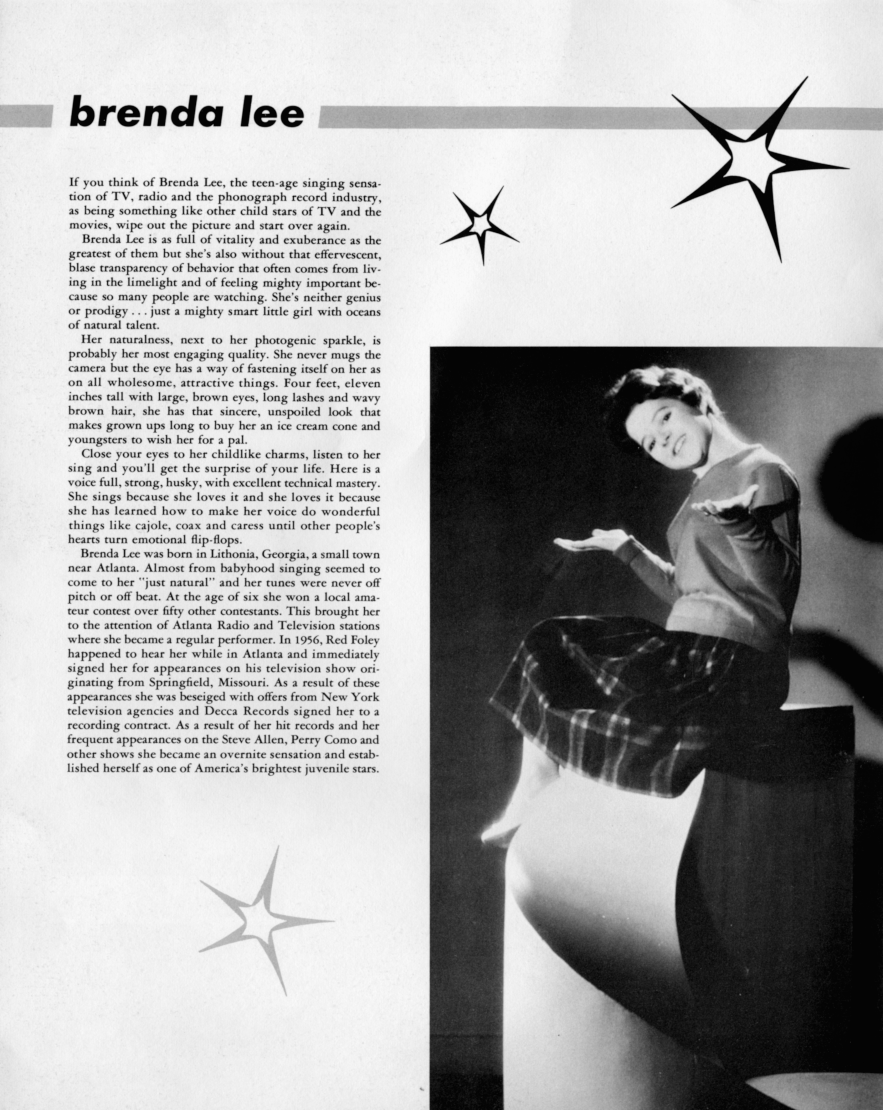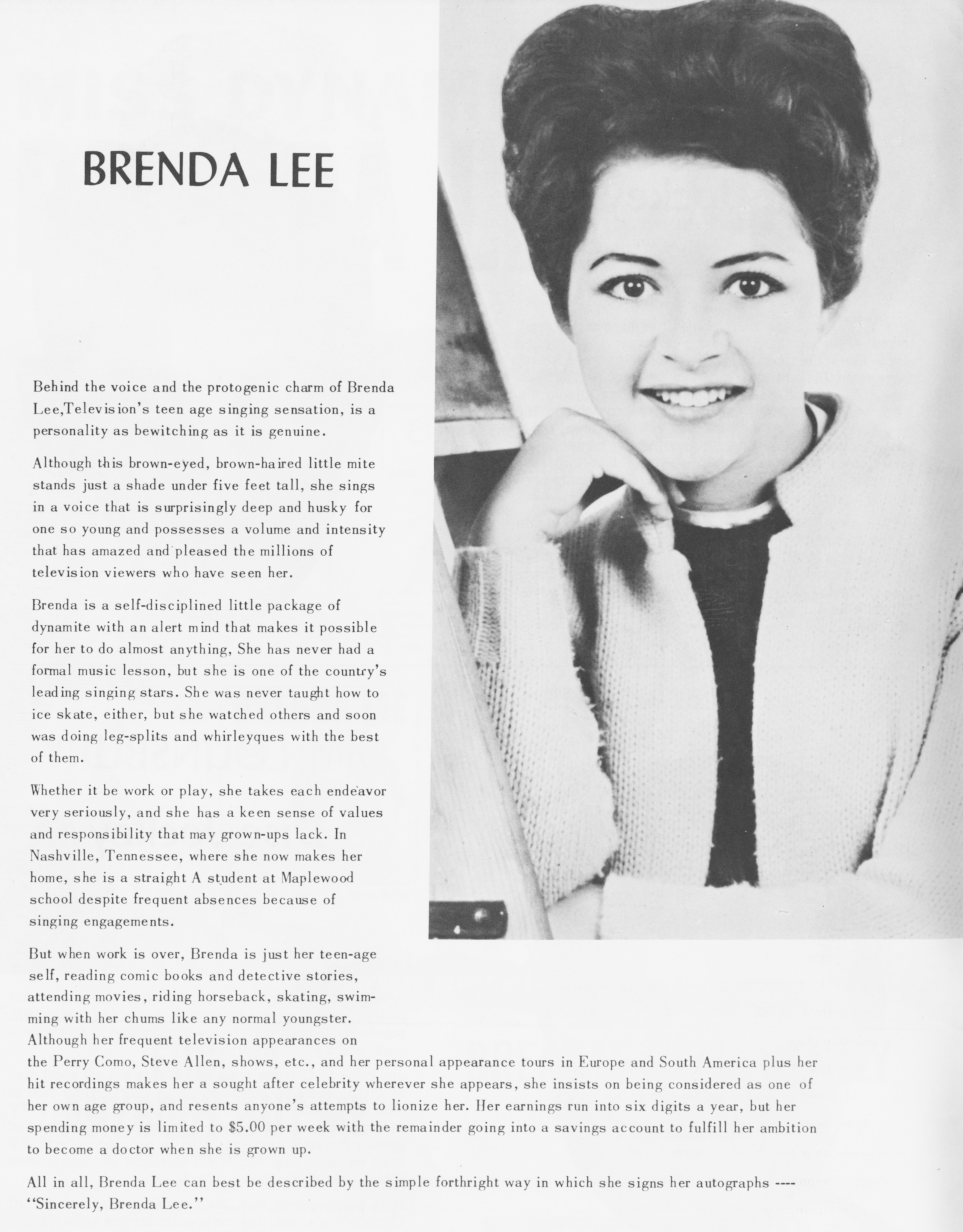 Brenda LeeBrenda Lee Brenda Lee American singer (born 1944) For the member of the South Carolina House of Representatives, see Brenda Lee (politician). For the fictional character, see Brenda Lee (Doctors). Brenda Mae Tarpley (born December 11, 1944),[1] known professionally as Brenda Lee, is an American singer. Primarily performing rockabilly, pop, country, and Christmas music, she achieved her first Billboard hit at age 12 in 1957, and was given the nickname "Little Miss Dynamite". Some of Lee's most successful songs include "Sweet Nothin's", "I'm Sorry", "I Want to Be Wanted", "Speak to Me Pretty", "All Alone Am I", and "Losing You". Her festive song "Rockin' Around the Christmas Tree", recorded in 1958, topped the U.S. Billboard Hot 100 in 2023, making… (Source: Wikipedia)