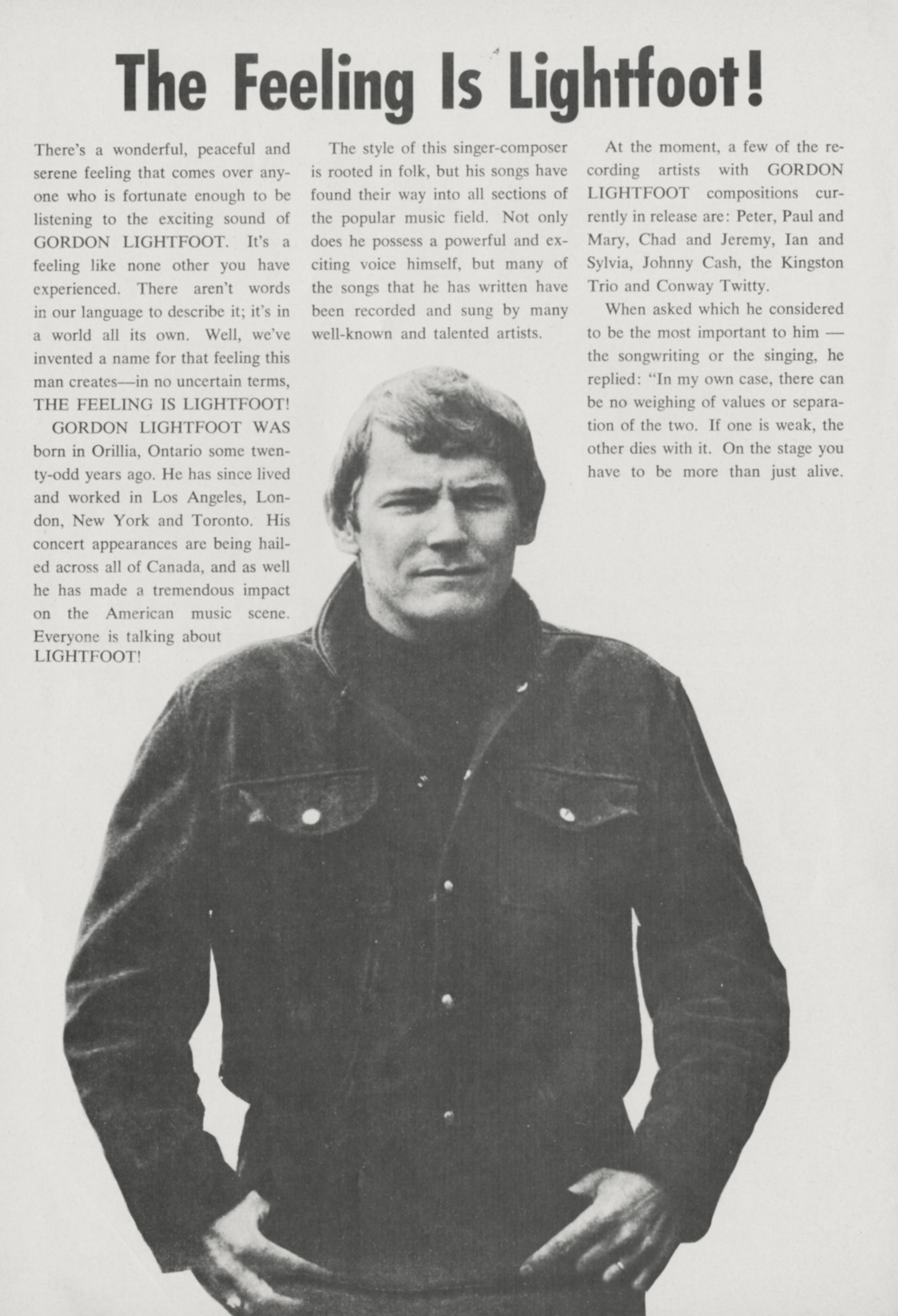 Gordon LightfootGordon Lightfoot Gordon Lightfoot Canadian singer-songwriter (1938–2023) Gordon Meredith Lightfoot Jr. CC OOnt (November 17, 1938 – May 1, 2023) was a Canadian singer-songwriter who achieved worldwide success and helped define the singer-songwriter era of the 1970s.[1] Widely considered one of Canada's greatest songwriters,[2] he had numerous gold and platinum albums,[3] and his songs have been covered by many of the world's most renowned musical artists.[4] Lightfoot's biographer Nicholas Jennings wrote, "His name is synonymous with timeless songs about trains and shipwrecks, rivers and highways, lovers and loneliness."[5] Quick facts CC OOnt, Background information ... Gordon Lightfoot CC OOnt Lightfoot performing in Interlochen, Michigan, in 2009 Background information Born Gordon Meredith Lightfoot Jr. (1938-11-17)November 17, 1938 Orillia, Ontario, Canada Died… (Source: Wikipedia)