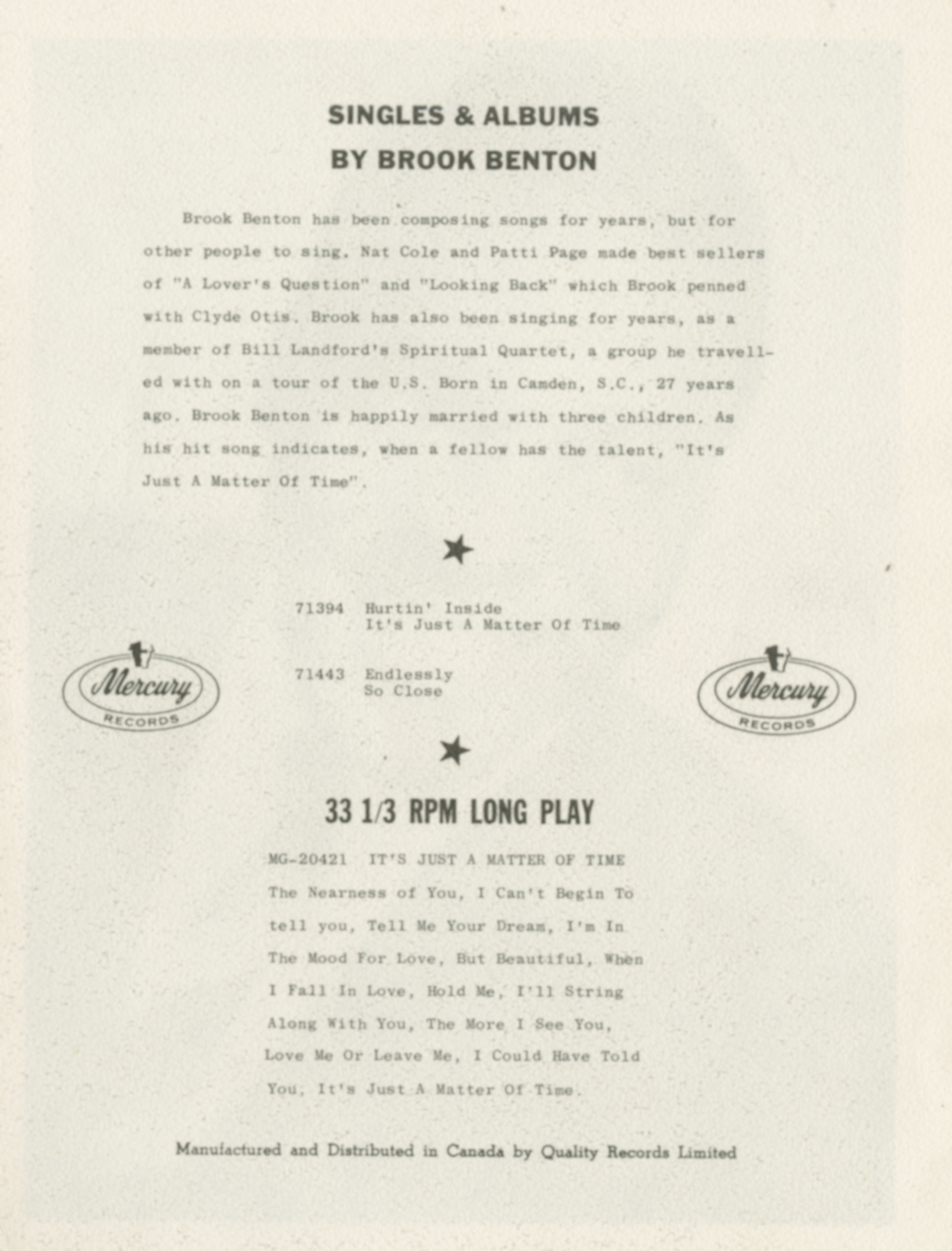 ![]() Photo of Brook Benton from a trade ad. Image by Mercury Records, via Wikimedia Commons. Licensed Public domain |