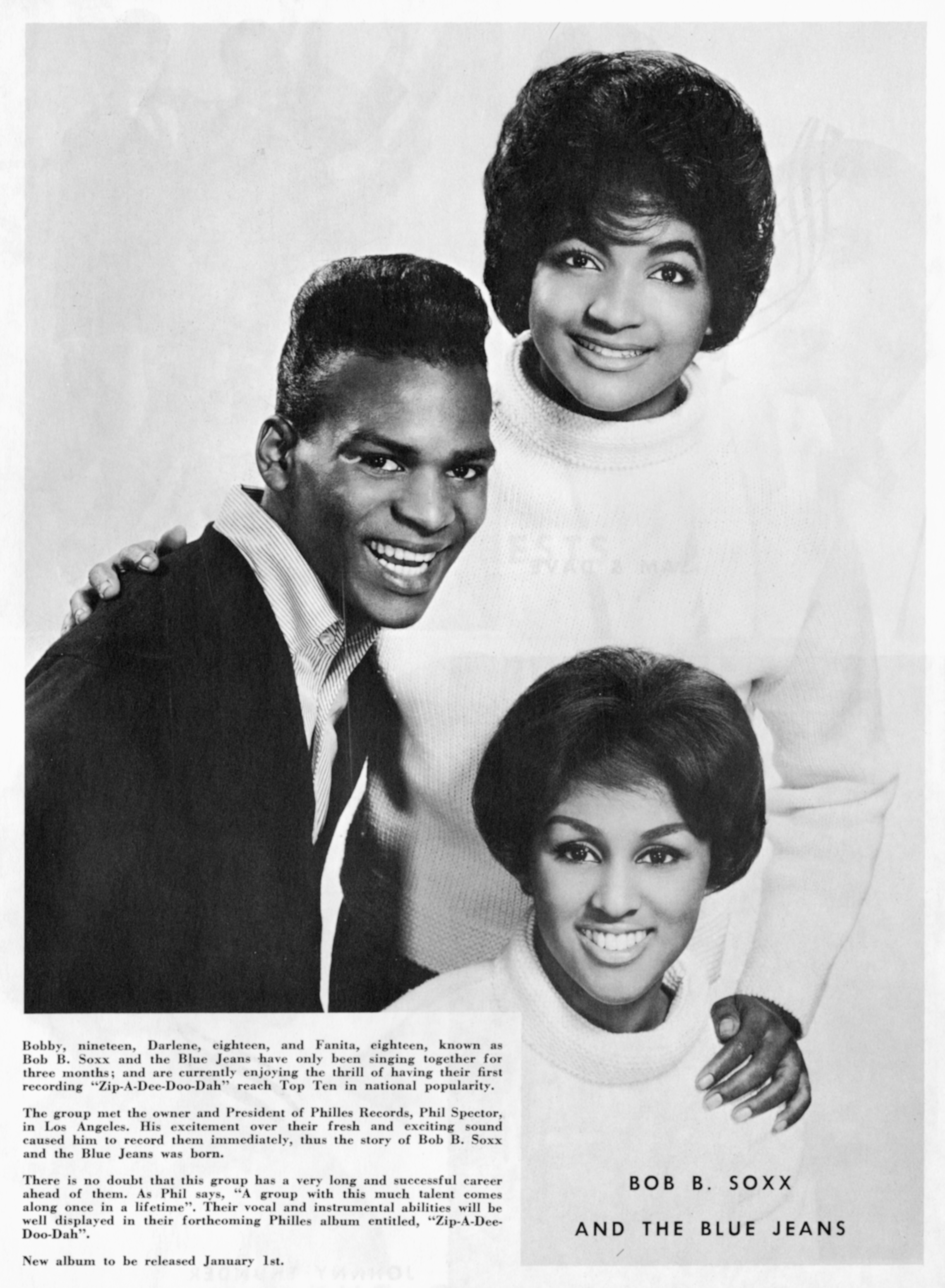 Bob-B-Soxx And The Blue JeansBob B. Soxx & the Blue Jeans Bob B. Soxx & the Blue Jeans American vocal group Bob B. Soxx & the Blue Jeans was an early 1960s vocal group produced by Phil Spector, and was initially conceived as a vehicle for the lead vocals of Bobby Sheen, who took the stage name Bob B. Soxx.[1] The Blue Jeans were backing vocalists Darlene Love and Fanita James, both of whom were also members of the girl group the Blossoms.[2] The group in 1962 Career Despite Sheen's status as group leader, by the time the trio entered the recording studio, Spector was often using Love as the group's primary vocalist. Sheen sang lead on the group's first hit, 1962's "Zip-a-Dee-Doo-Dah" (originally… (Source: Wikipedia)