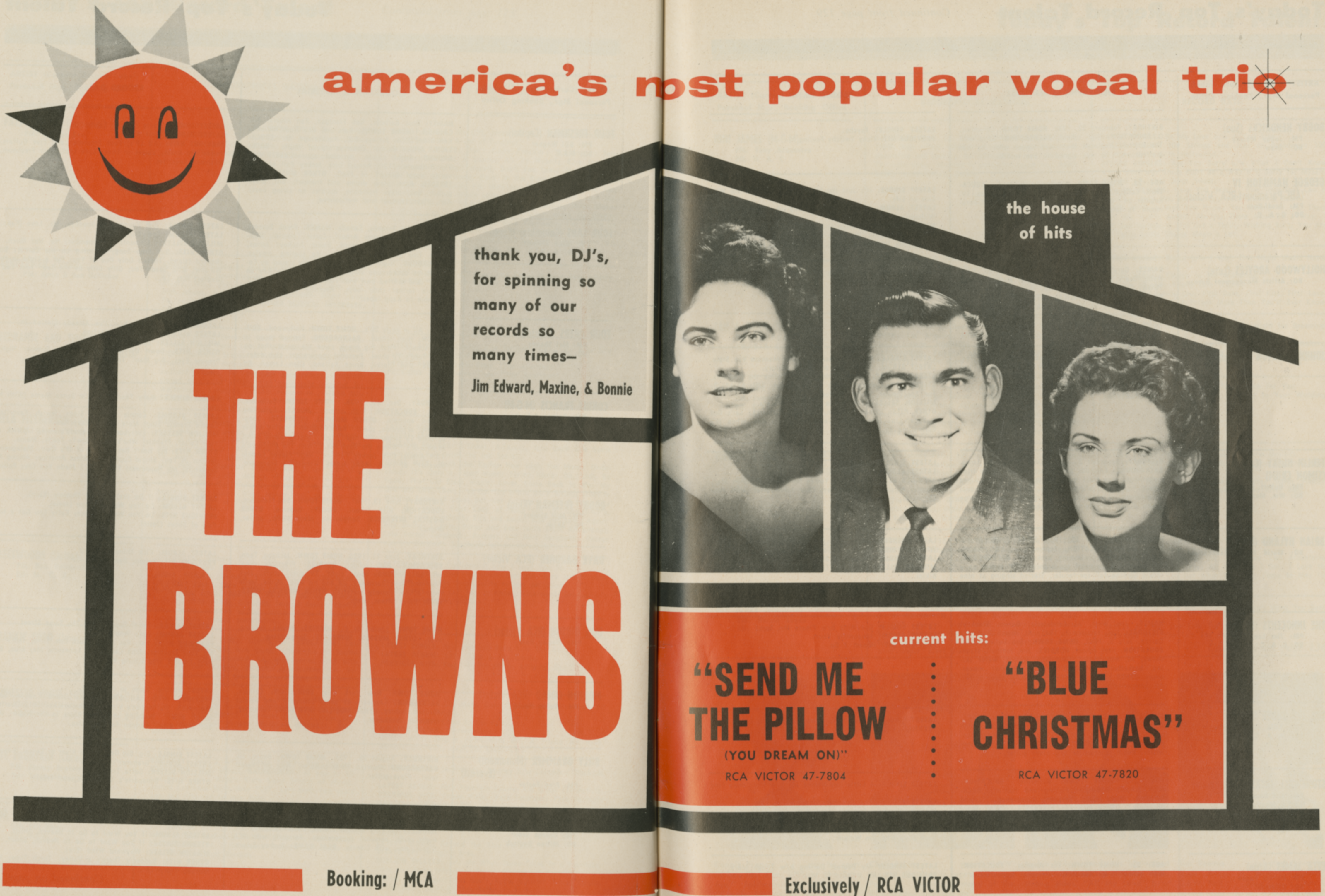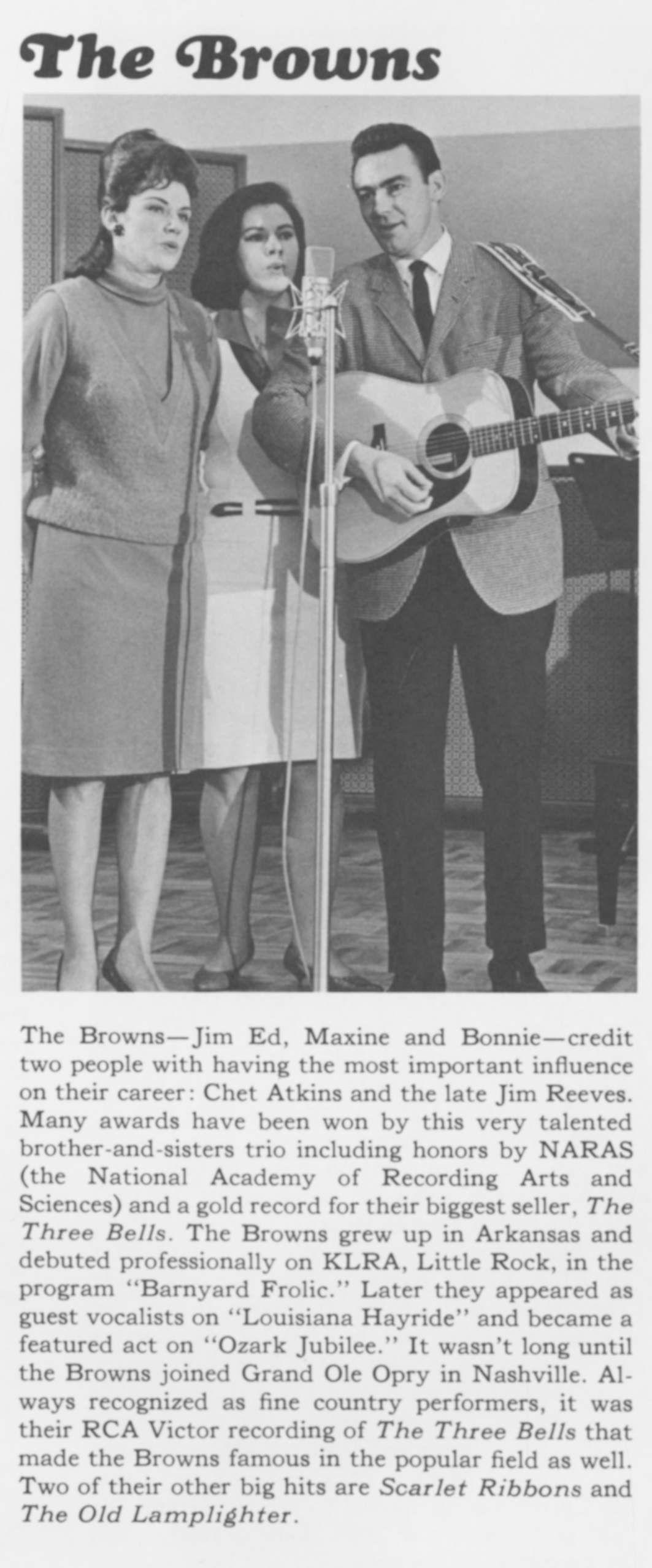 The BrownsThe Browns The Browns American country-folk vocal trio For the NFL franchise, see Cleveland Browns. For other uses, see Browns. The Browns were an American country and folk music vocal trio best known for their 1959 Grammy-nominated hit, "The Three Bells". The group, composed of Jim Ed Brown and his sisters Maxine and Bonnie, had a close, smooth harmony characteristic of the Nashville sound, though their music also combined elements of folk and pop. They disbanded in 1967 and were elected to the Country Music Hall of Fame in March 2015. This article includes a list of general references, but it lacks sufficient corresponding inline citations. (July 2016) Quick facts Background information, Origin ... The Browns Bonnie and Jim Ed… (Source: Wikipedia)