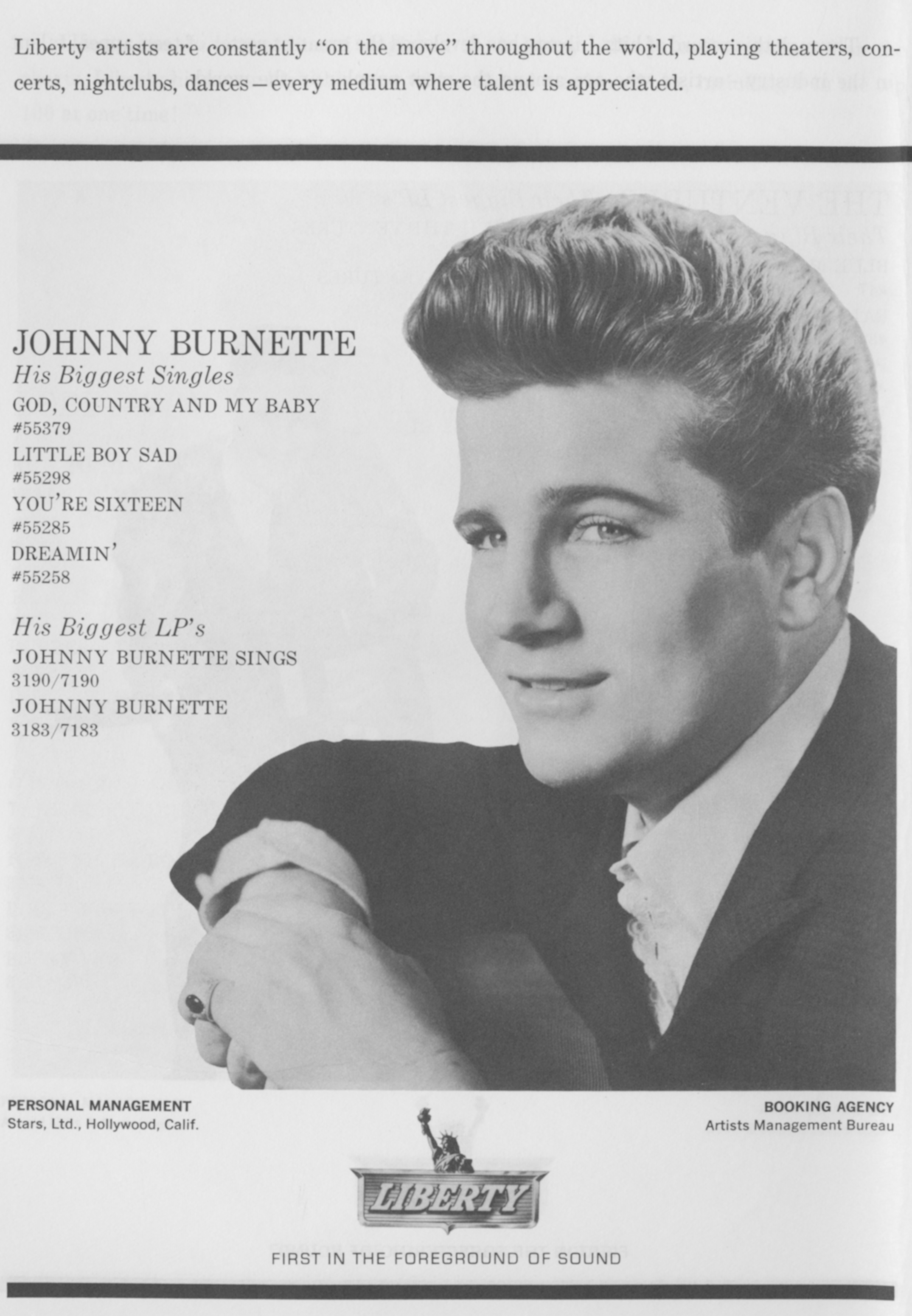 Johnny BurnetteJohnny Burnette Johnny Burnette American musician (1934–1964) "Johnny Burnett" redirects here. For the baseball infielder, see Johnny Burnett (baseball). John Joseph Burnette (March 25, 1934 – August 14, 1964) was an American singer and songwriter of rockabilly and pop music.[1] In 1952, Johnny, his brother Dorsey Burnette, and their mutual friend Paul Burlison, formed the band that became known as the Rock and Roll Trio.[2] His career was cut short on August 14, 1964, when he drowned following a boat accident, aged 30. Quick facts Background information, Born ... Johnny Burnette Burnette in 1964 Background information Born John Joseph Burnette (1934-03-25)March 25, 1934 Memphis, Tennessee, U.S. Died August 14, 1964(1964-08-14) (aged 30) Clear Lake, California, U.S. Genres Rockabilly, rock and… (Source: Wikipedia)