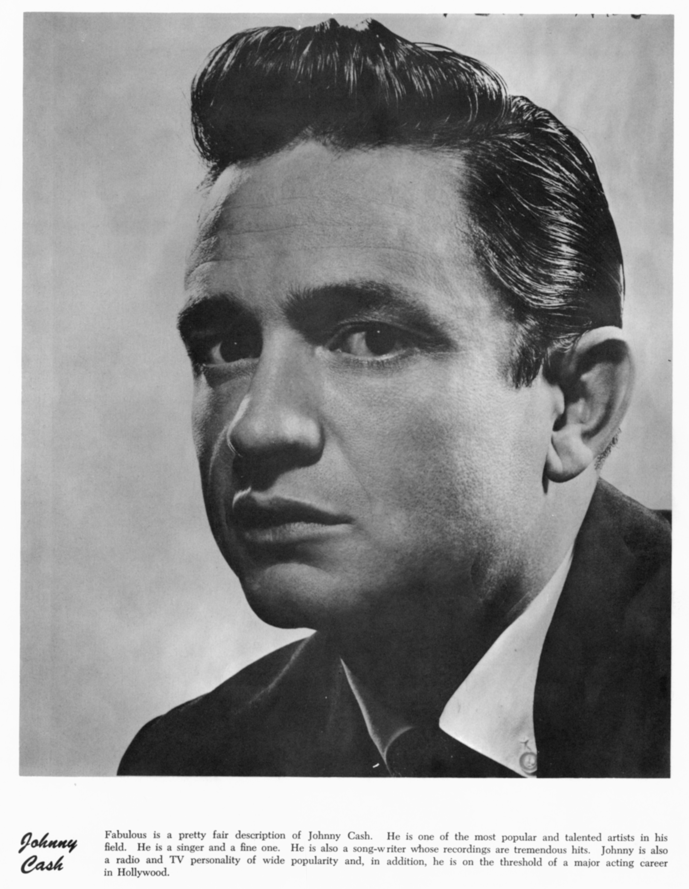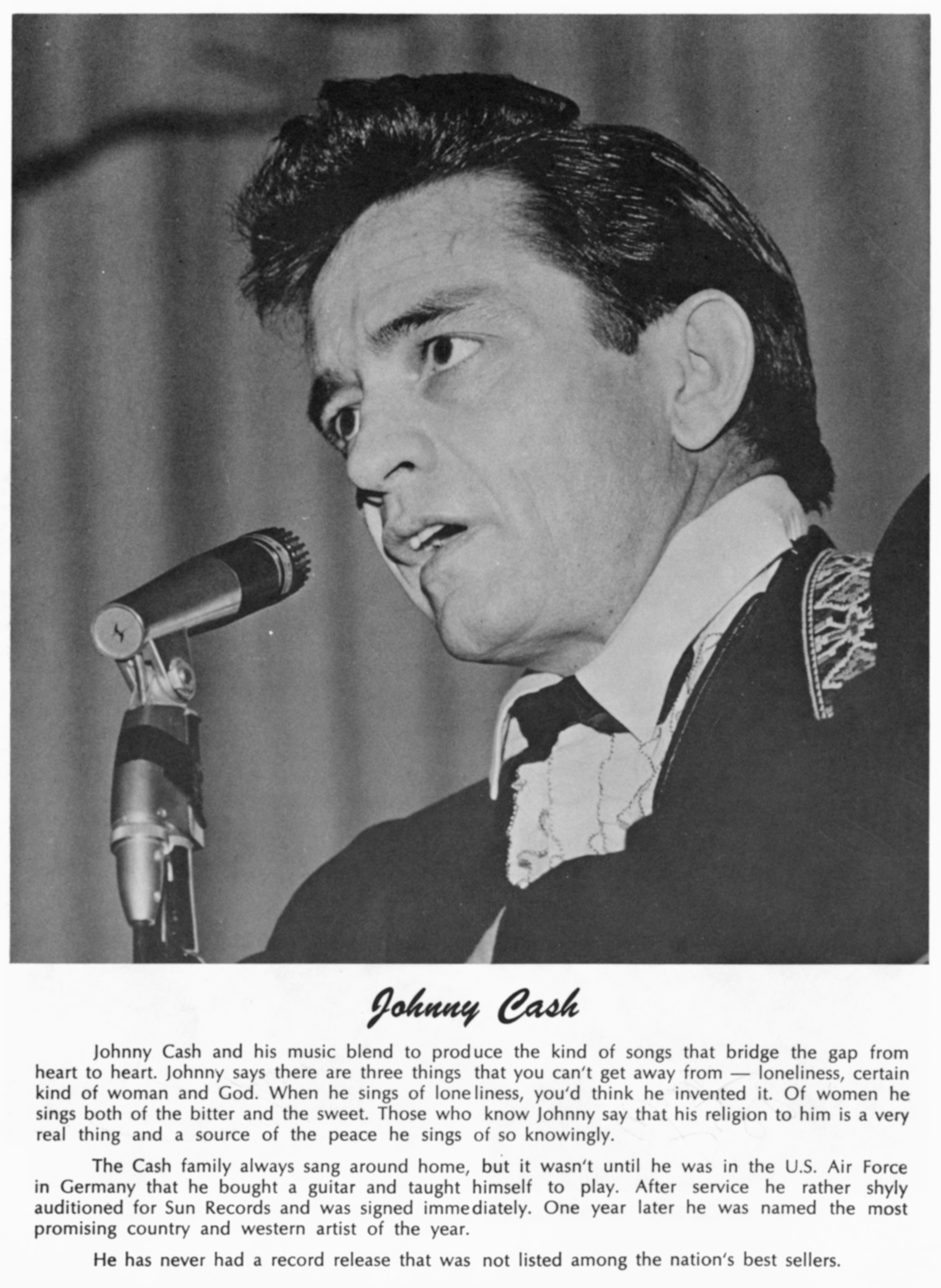 Johnny CashJohnny Cash Johnny Cash American country singer (1932–2003) This article is about the singer. For other uses, see Johnny Cash (disambiguation). "John R. Cash" redirects here. For the album, see John R. Cash (album). John R. Cash (born J. R. Cash; February 26, 1932 – September 12, 2003) was an American singer-songwriter. Most of his music contains themes of sorrow, moral tribulation, and redemption, especially songs from the later stages of his career.[3][4] He was known for his deep, calm, bass-baritone voice,[a][5] the distinctive sound of his backing band, the Tennessee Three, that was characterized by its train-like chugging guitar rhythms, a rebelliousness[6][7] coupled with an increasingly somber and humble demeanor,[3] and his free prison concerts.[8] Cash wore a trademark… (Source: Wikipedia)