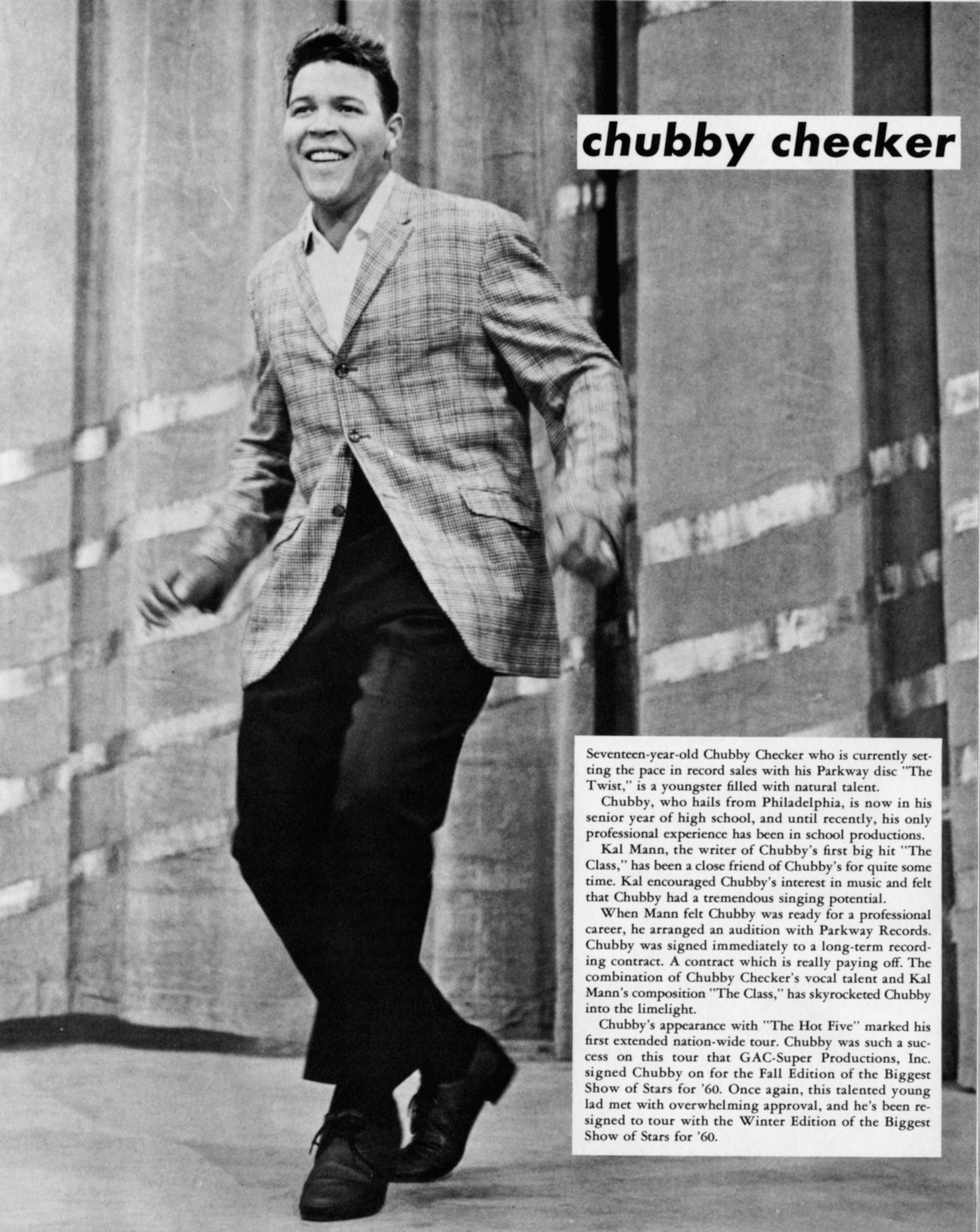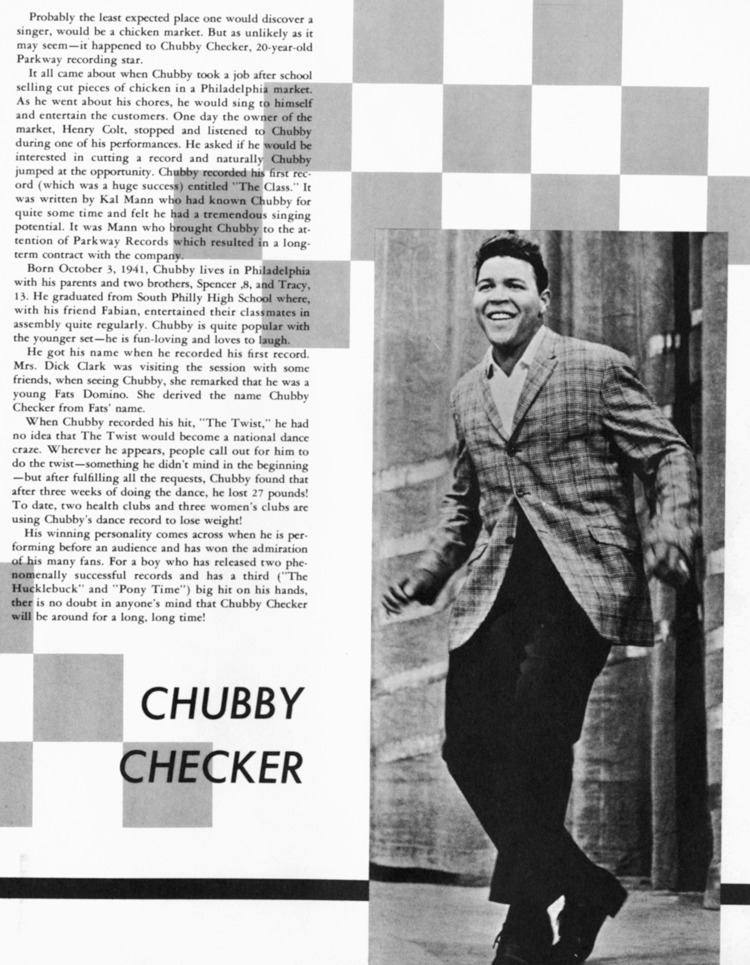 Chubby CheckerChubby Checker Chubby Checker American singer (born 1941) Chubby Checker (born Ernest Evans, October 3, 1941) is an American rock and roll singer and dancer. He is known for popularizing many dance styles, including the Twist, with his 1960 hit cover of Hank Ballard & The Midnighters' R&B song "The Twist", and the Pony, with his 1961 cover of the song "Pony Time". His biggest UK hit, "Let's Twist Again", was released one year later (in 1962). That year, he also popularized the song "Limbo Rock", a previous-year instrumental hit by the Champs to which he added lyrics and its trademark Limbo dance. He also introduced other dance styles, such as the Fly. In September 2008, "The Twist" topped Billboard's… (Source: Wikipedia)
