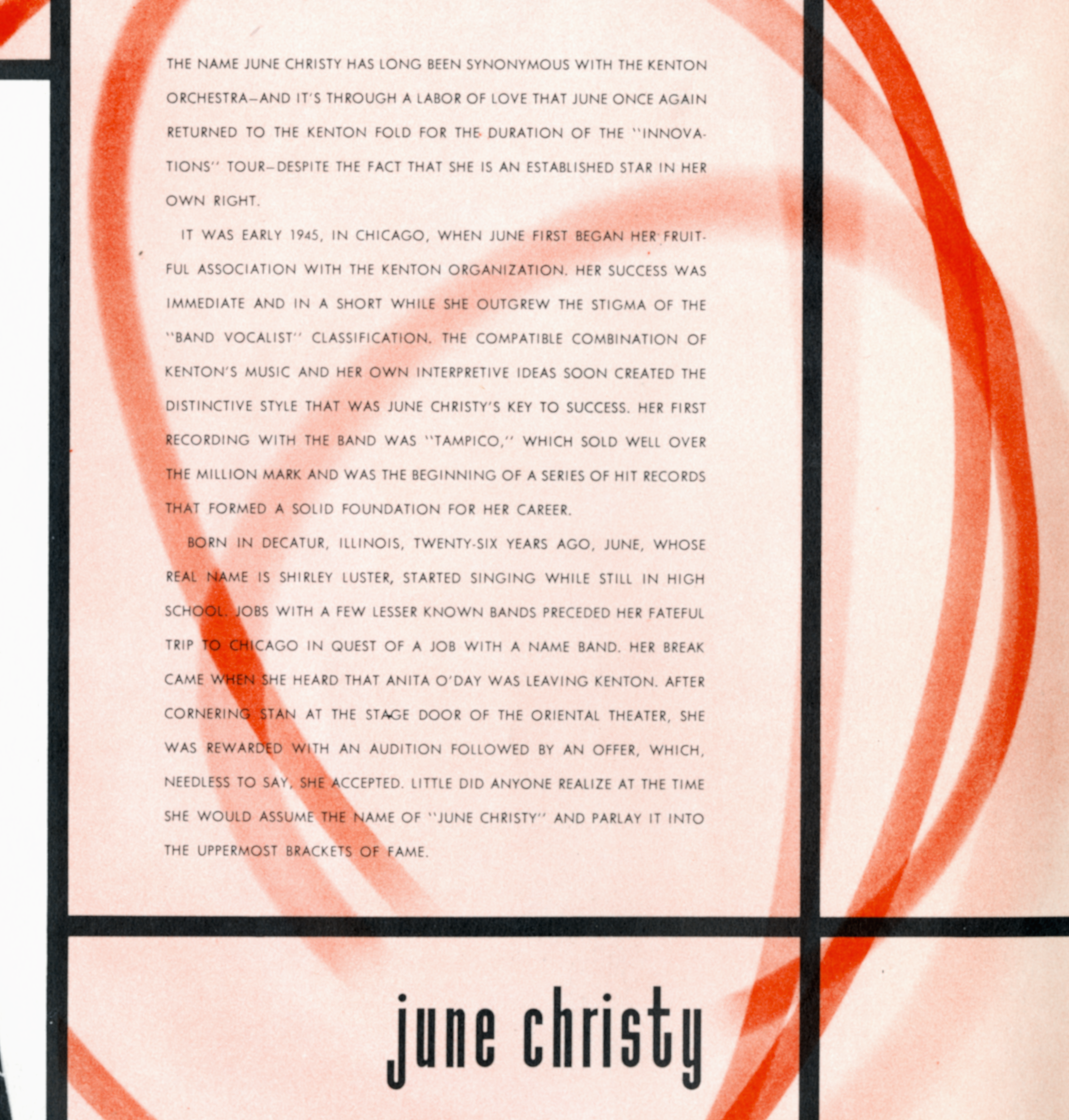 June ChristyJune Christy June Christy American singer (1925–1990) June Christy (born Shirley Luster; November 20, 1925 – June 21, 1990)[1] was an American singer, known for her work in the cool jazz genre and for her silky smooth vocals. Her success as a singer began with The Stan Kenton Orchestra. She pursued a solo career from 1954 and is best known for her debut album Something Cool. After her death, she was hailed as "one of the finest and most neglected singers of her time."[2] Quick facts Background information, Also known as ... June Christy Christy at the Club Troubador, New York, c. 1947 Background information Also known as Sharon Leslie Born Shirley Luster (1925-11-20)November 20, 1925 Springfield, Illinois, U.S. Died… (Source: Wikipedia)