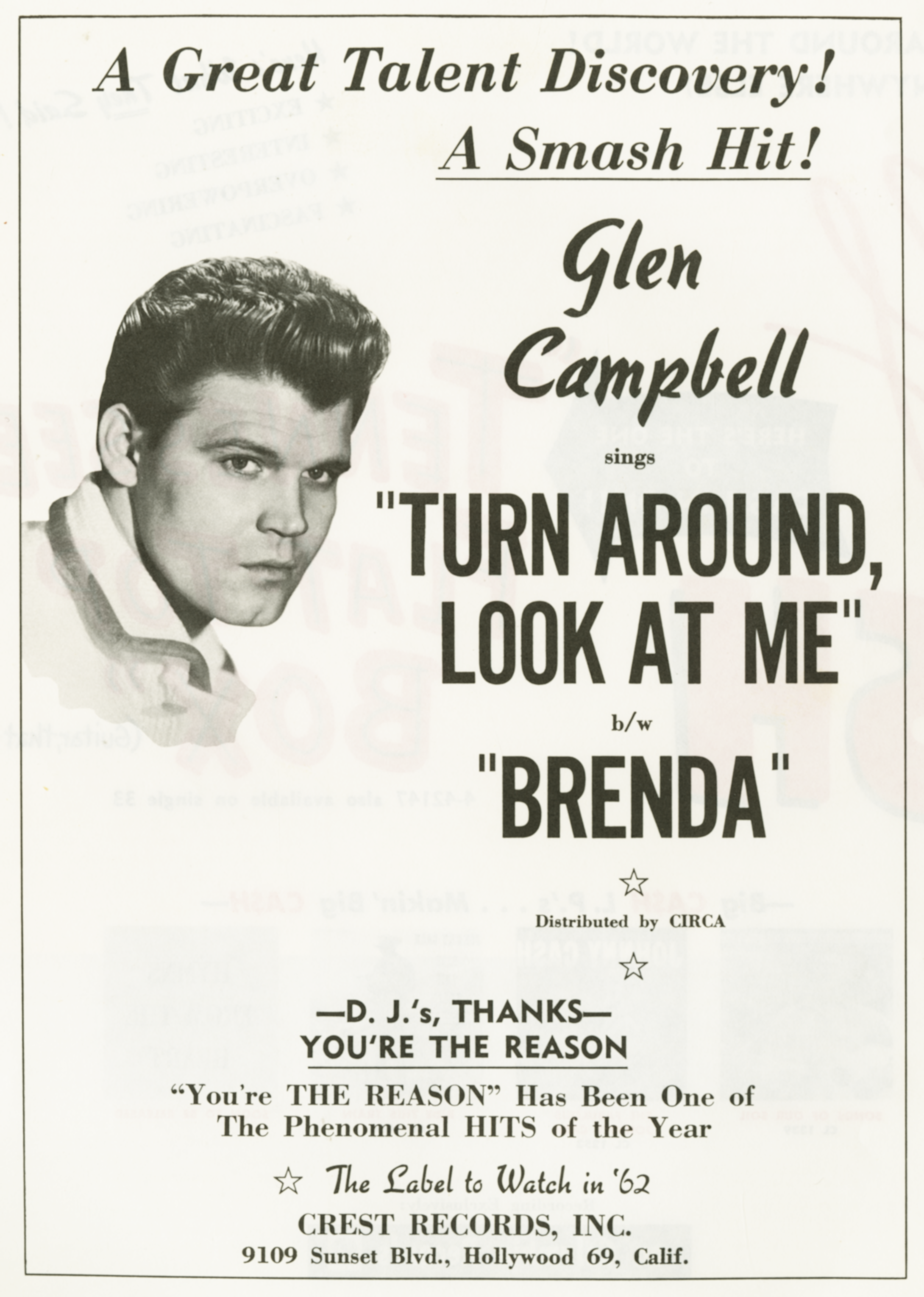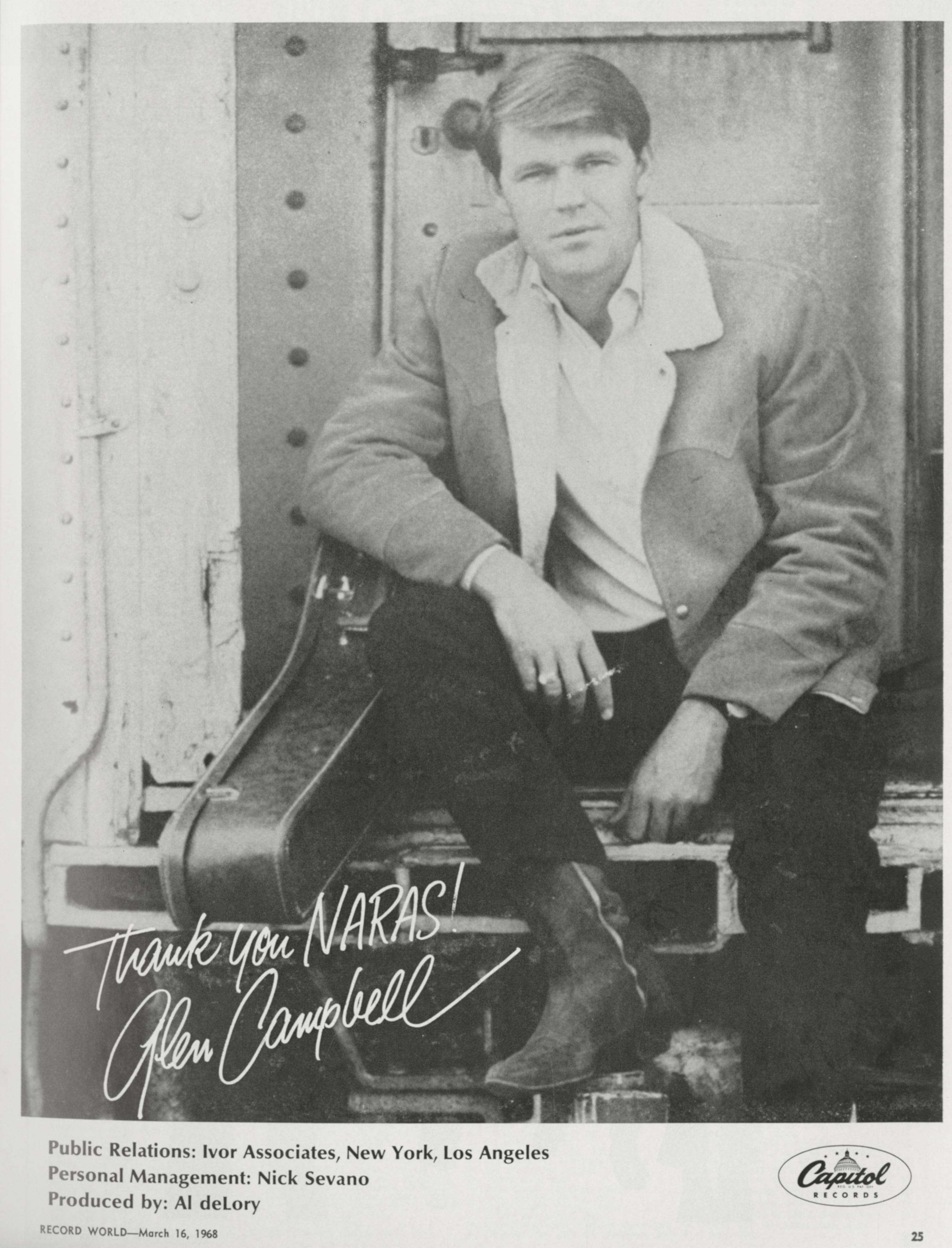 Photo of singer-musician Glen Campbell. Image by Capitol Records. This was his recording company at the time. There's a partial ink stamp on back at left showing a portion of the old Capitol logo and the file number 15341., via Wikimedia Commons. Licensed Public domain |