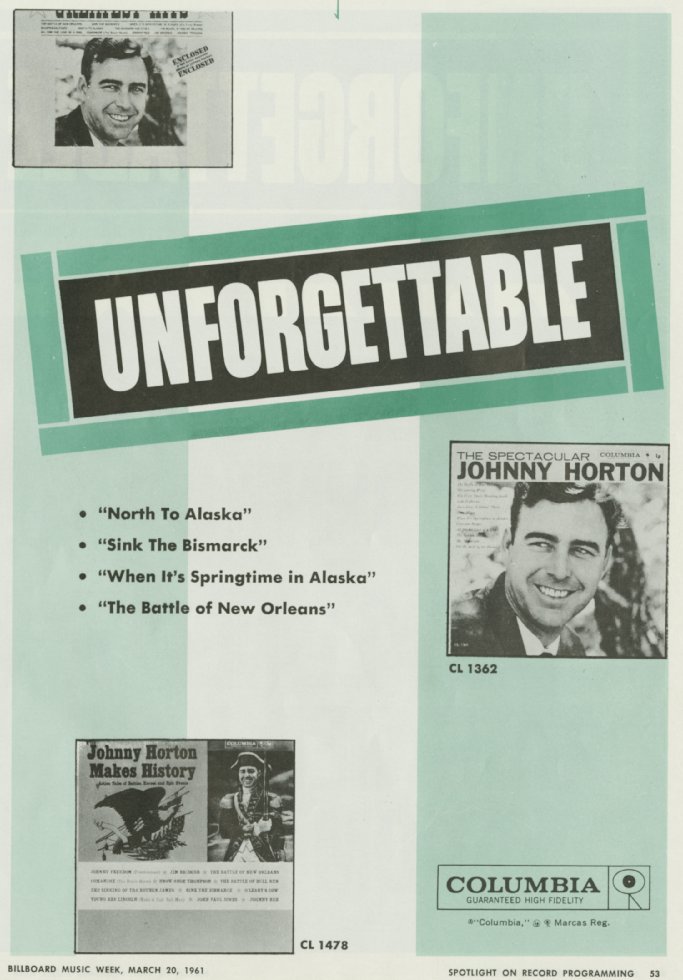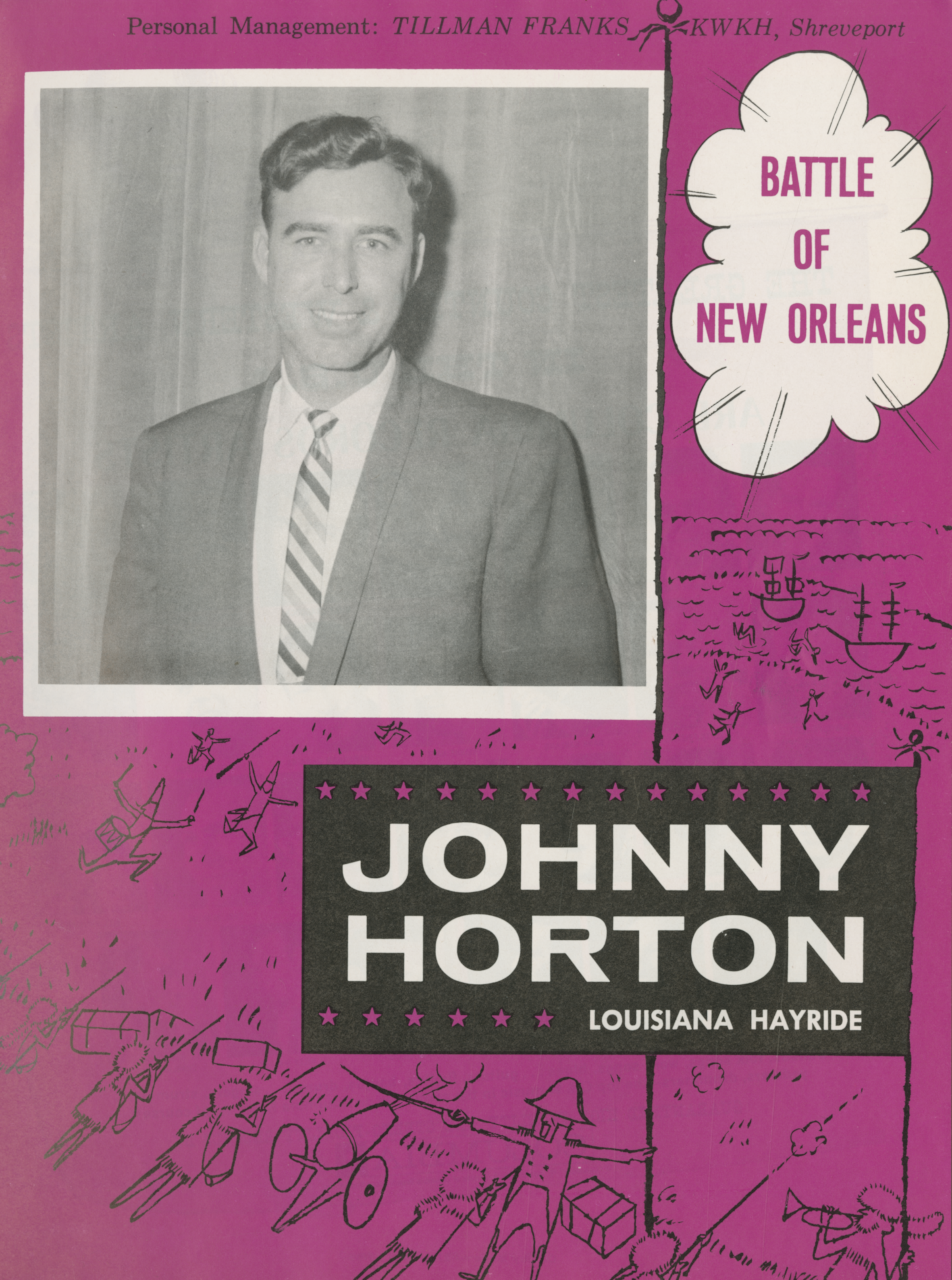 Johnny HortonJohnny Horton Johnny Horton American singer (1925–1960) For other uses, see Johnny Horton (disambiguation). John LaGale Horton (April 30, 1925 – November 5, 1960) was an American country, honky tonk, and rockabilly musician during the 1950s. He is best known for a series of history-inspired narrative country saga songs that became international hits. His 1959 single "The Battle of New Orleans" was awarded the 1960 Grammy Award for Best Country & Western Recording.[1] The song was awarded the Grammy Hall of Fame Award and in 2001 ranked number 333 of the Recording Industry Association of America's "Songs of the Century". His first number-one country song was in 1959, "When It's Springtime in Alaska (It's Forty Below)". This article needs additional… (Source: Wikipedia)