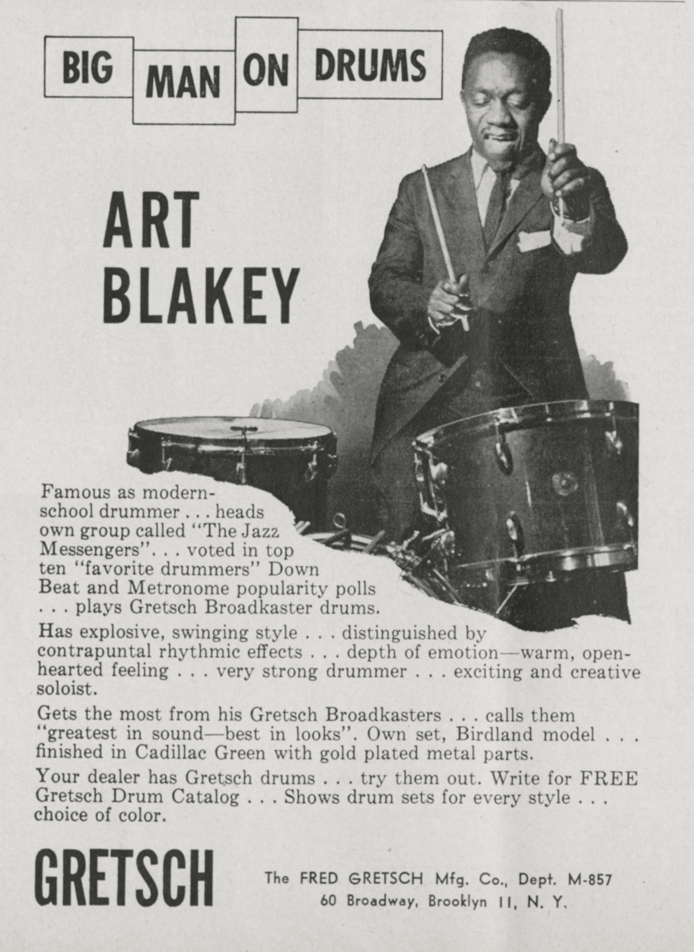 Blakey Art And The Jazz MessengersArt Blakey Art Blakey American jazz drummer and bandleader (1919–1990) Arthur Blakey (October 11, 1919 – October 16, 1990) was an American jazz drummer and bandleader. He was also known as Abdullah Ibn Buhaina after he converted to Islam for a short time in the late 1940s.[1] Quick facts Background information, Also known as ... Art Blakey Blakey, c. 1964 Background information Also known as Abdullah Ibn Buhaina Born Arthur Blakey (1919-10-11)October 11, 1919 Pittsburgh, Pennsylvania, U.S. Died October 16, 1990(1990-10-16) (aged 71) Manhattan, New York City, U.S. Genres Jazz hard bop bebop straight-ahead jazz Occupations Musician bandleader Instruments Drums percussion Works Solo Jazz Messengers Years active 1942–1990 Labels Blue Note Formerly of Jazz Messengers Website artblakey.com Close Blakey made… (Source: Wikipedia)