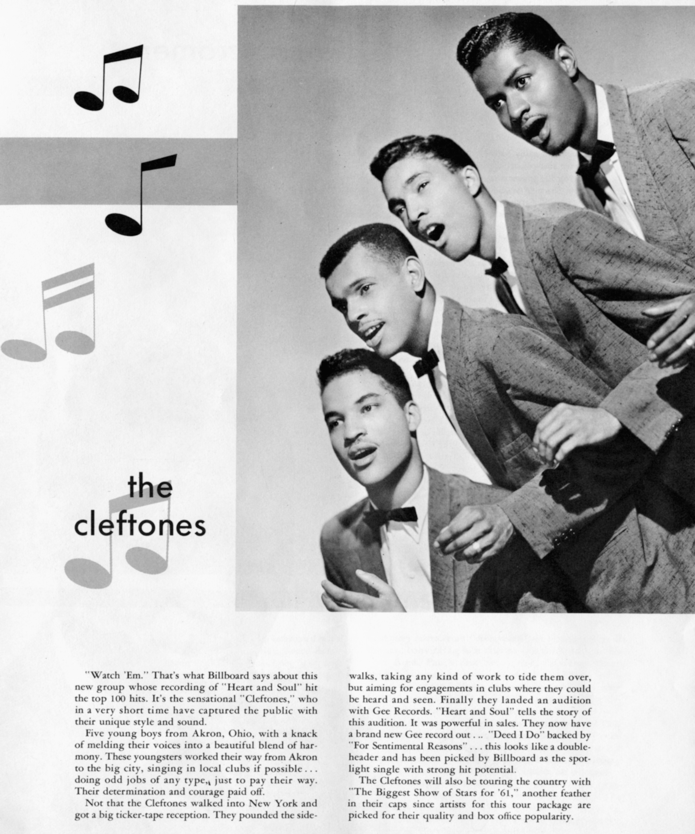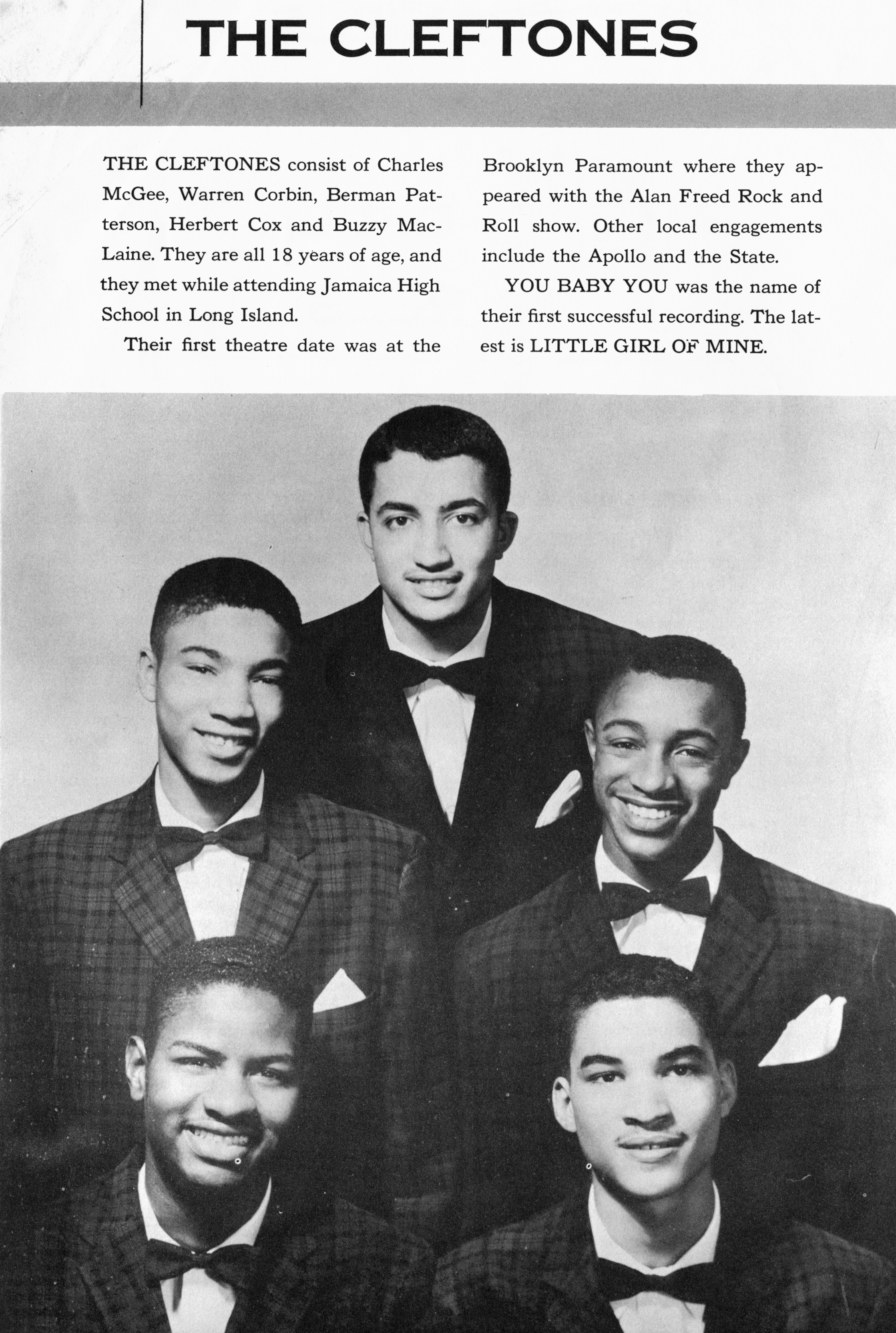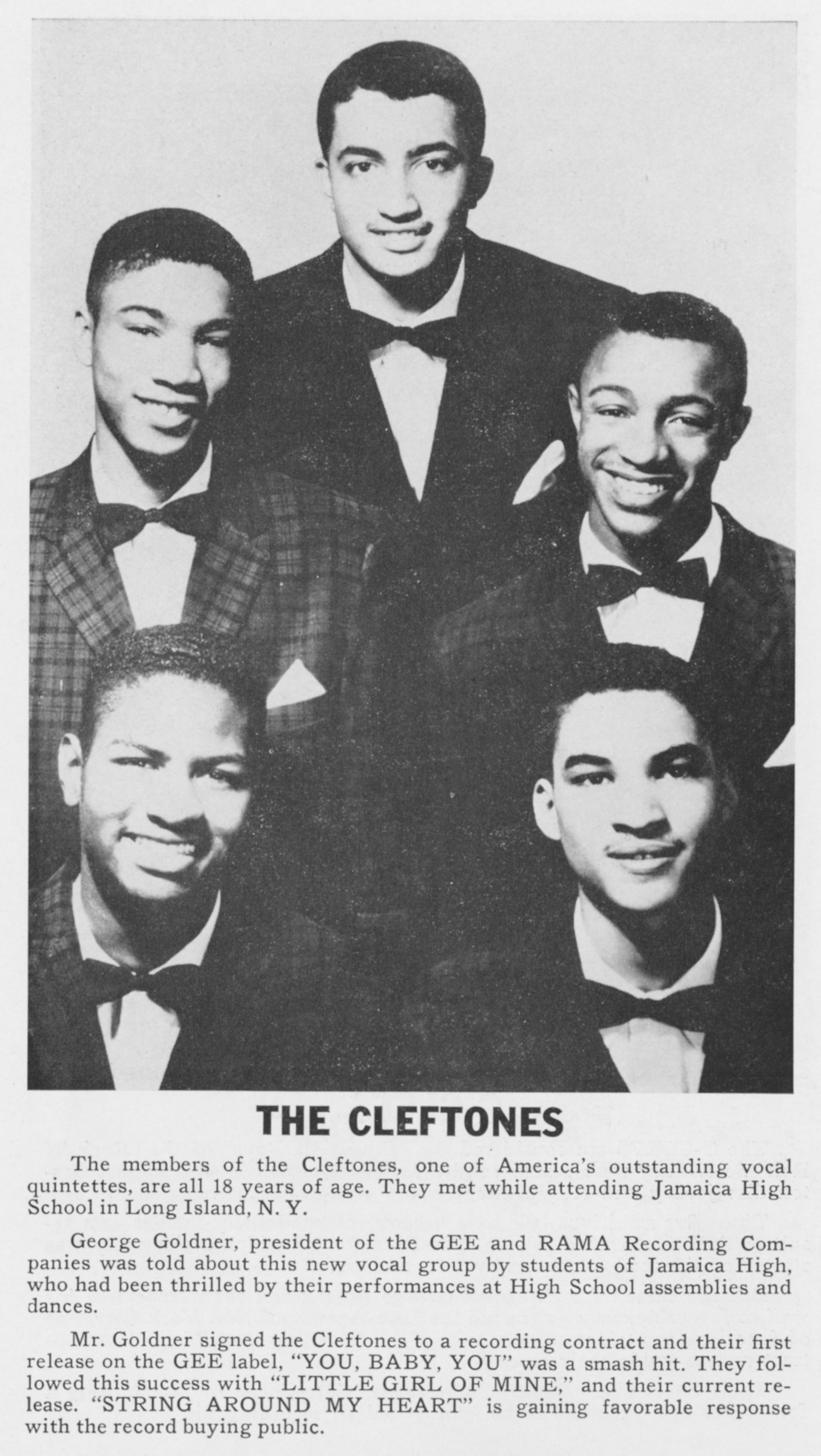 The CleftonesThe Cleftones The Cleftones American vocal group Not to be confused with The Kleptones. The Cleftones were an American vocal group formed in 1955, who were then called The Silvertones at Junior High School 40 in Jamaica, Queens, New York City.[1] The group in 1957 Formation In 1955, the members of the group were high school students attending Jamaica High School in Queens, New York.[1] The group initially formed around the idea of writing a political campaign jingle for Jamaica High School's Independent Party, an unpopular group of students "made up of people who were typically also-rans in all the school activities", which included future members of The Cleftones. With this aim, Herbie Cox (lead singer), along with classmates Charlie… (Source: Wikipedia)