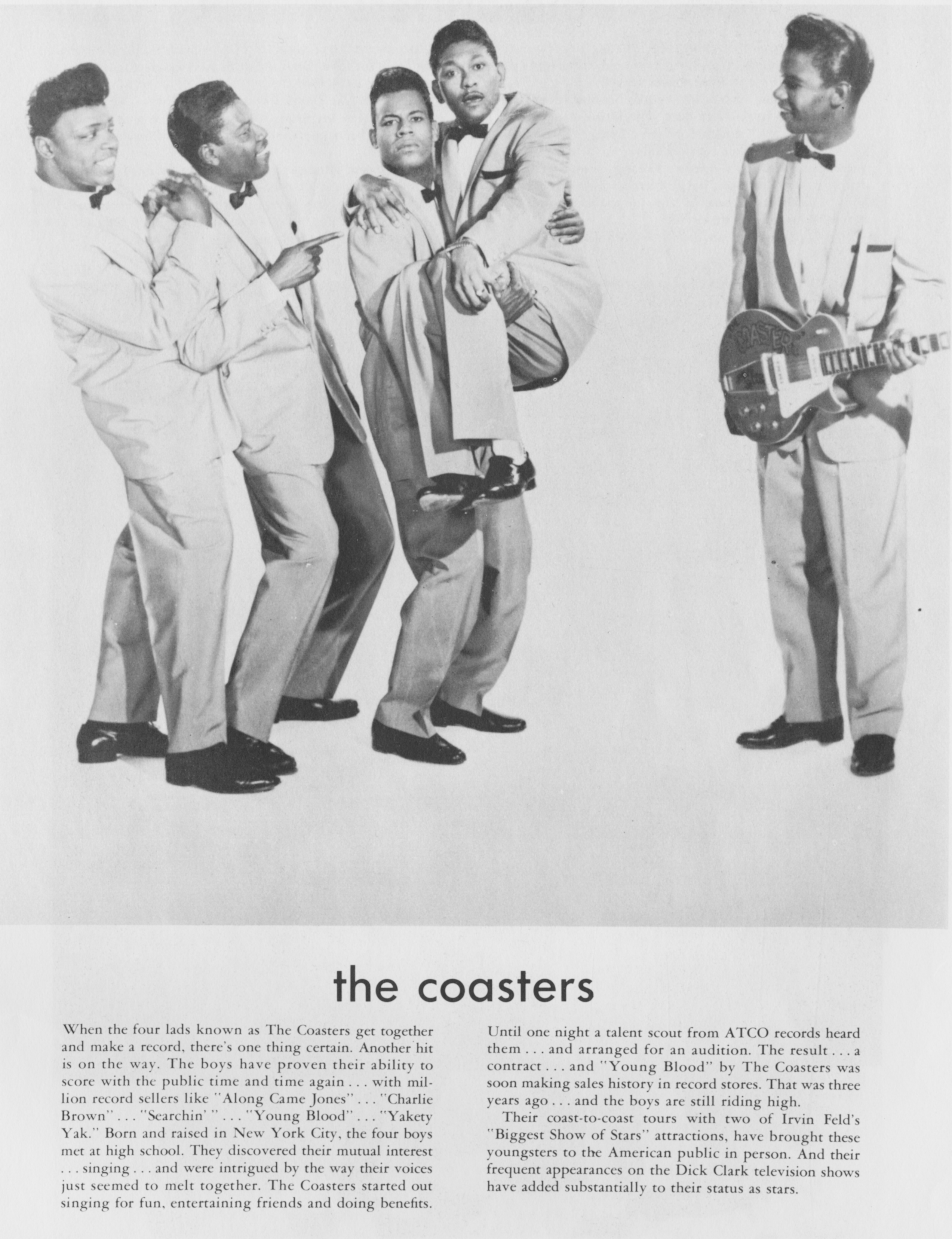 The CoastersThe Coasters The Coasters American vocal group For other uses, see Coasters (disambiguation). The Coasters are an American rhythm and blues/rock and roll vocal group who had a string of hits in the late 1950s. With hits including "Searchin'", "Young Blood", "Charlie Brown", "Poison Ivy", and "Yakety Yak", their most memorable songs were written by the songwriting and producing team of Leiber and Stoller.[2] Although the Coasters originated outside of mainstream doo-wop, their records were so frequently imitated that they became an important part of the doo-wop legacy through the 1960s. In 1987, they were the first group inducted into the Rock and Roll Hall of Fame.[3] Quick facts Background information, Origin ... The Coasters The Coasters, 1957 Background information… (Source: Wikipedia)