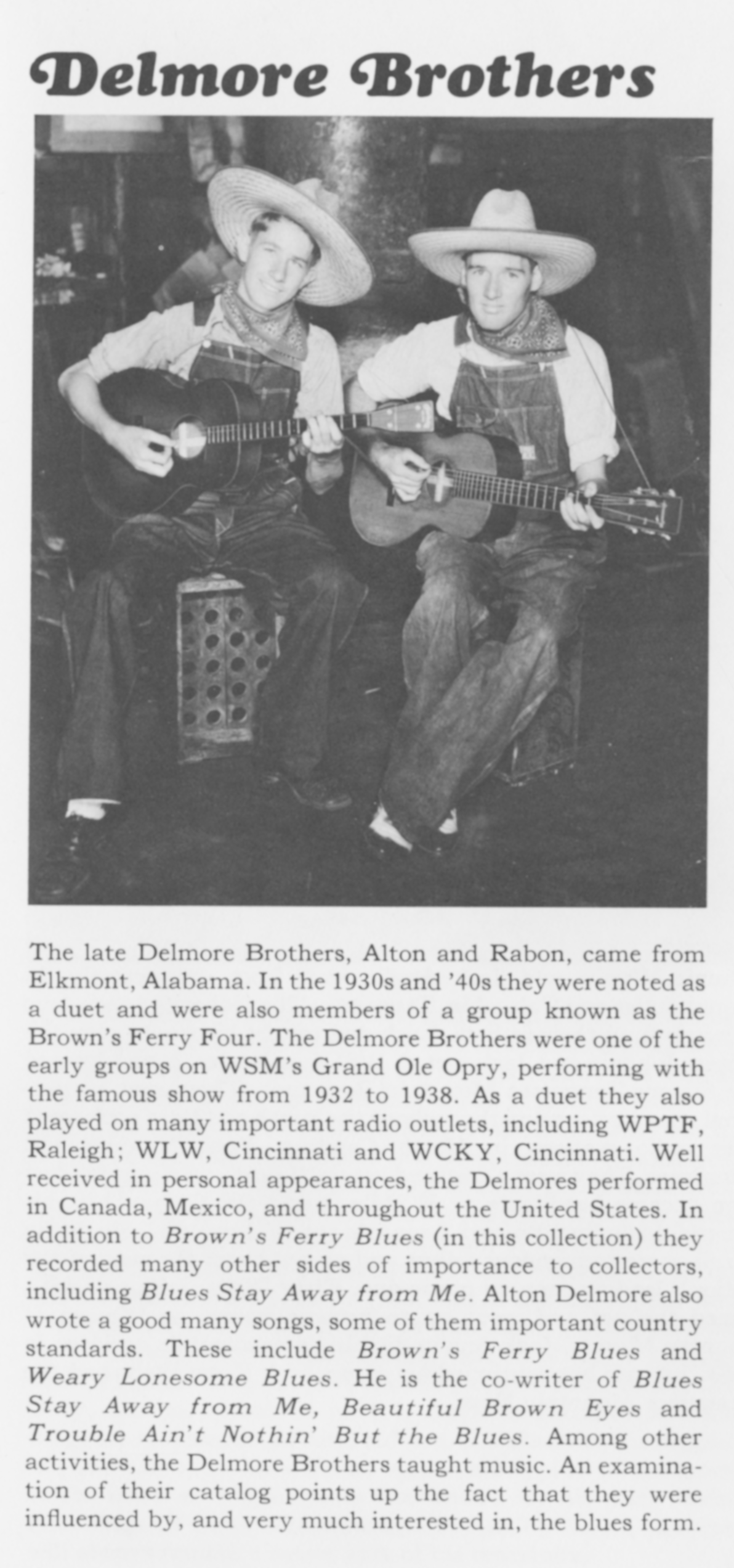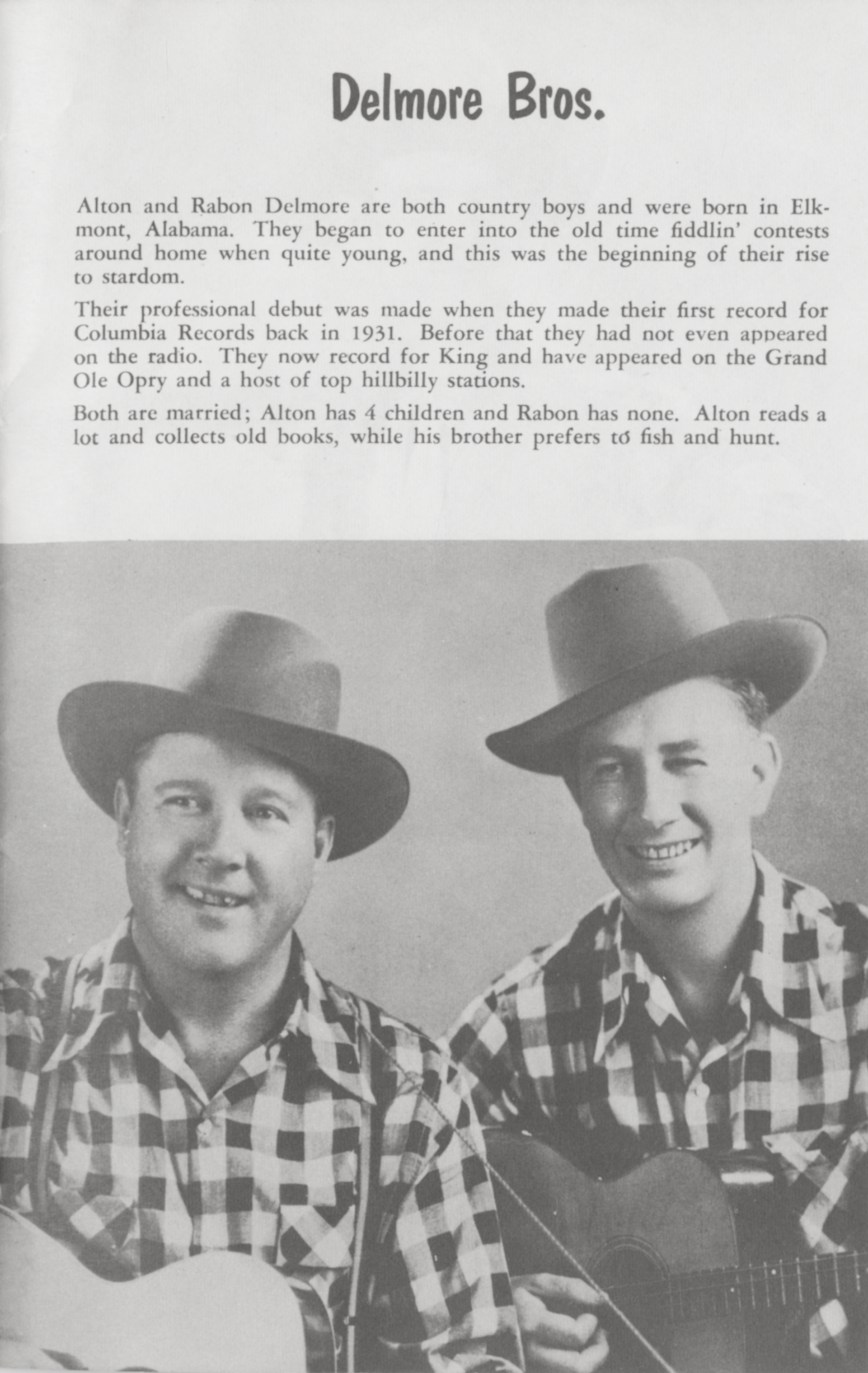 The Delmore BrothersThe Delmore Brothers The Delmore Brothers American country music duo Alton Delmore (December 25, 1908 – June 9, 1964)[1] and Rabon Delmore (December 3, 1916 – December 4, 1952),[1] billed as The Delmore Brothers, were country music pioneer singer-songwriters and musicians who were stars of the Grand Ole Opry in the 1930s.[2] The Delmore Brothers, together with other brother duos such as the Louvin Brothers, the Blue Sky Boys, the Monroe Brothers (Birch Monroe, Charlie Monroe and Bill Monroe), the McGee Brothers, and The Stanley Brothers, had a profound impact on the history of country music and American popular music. The duo performed extensively with old time fiddler Arthur Smith as the Arthur Smith Trio throughout the 1930s. Quick facts… (Source: Wikipedia)