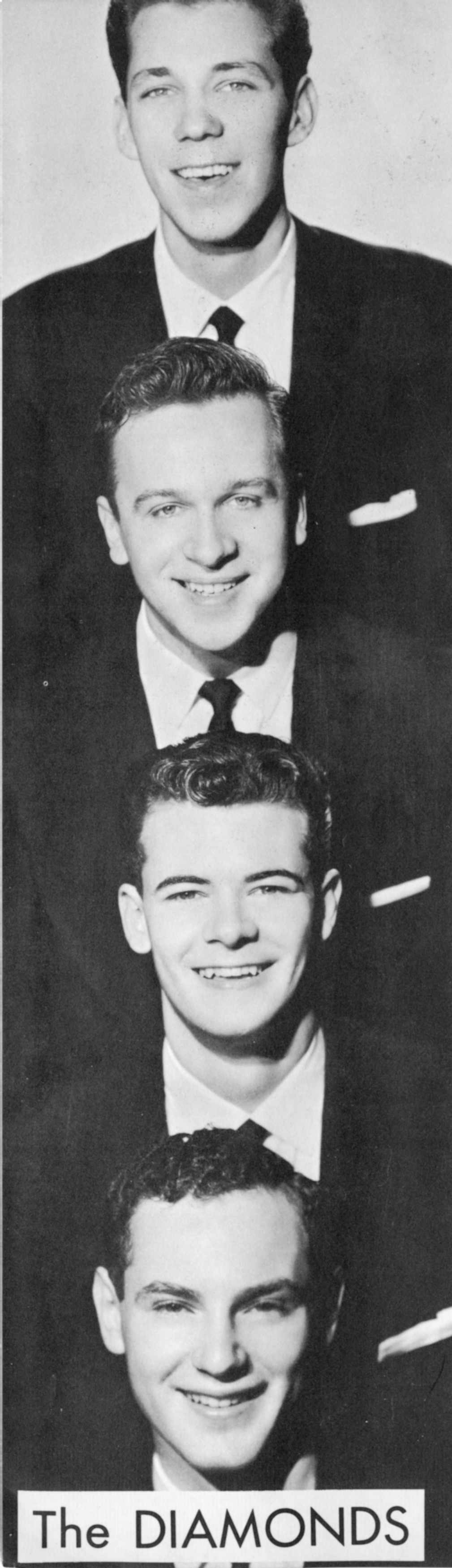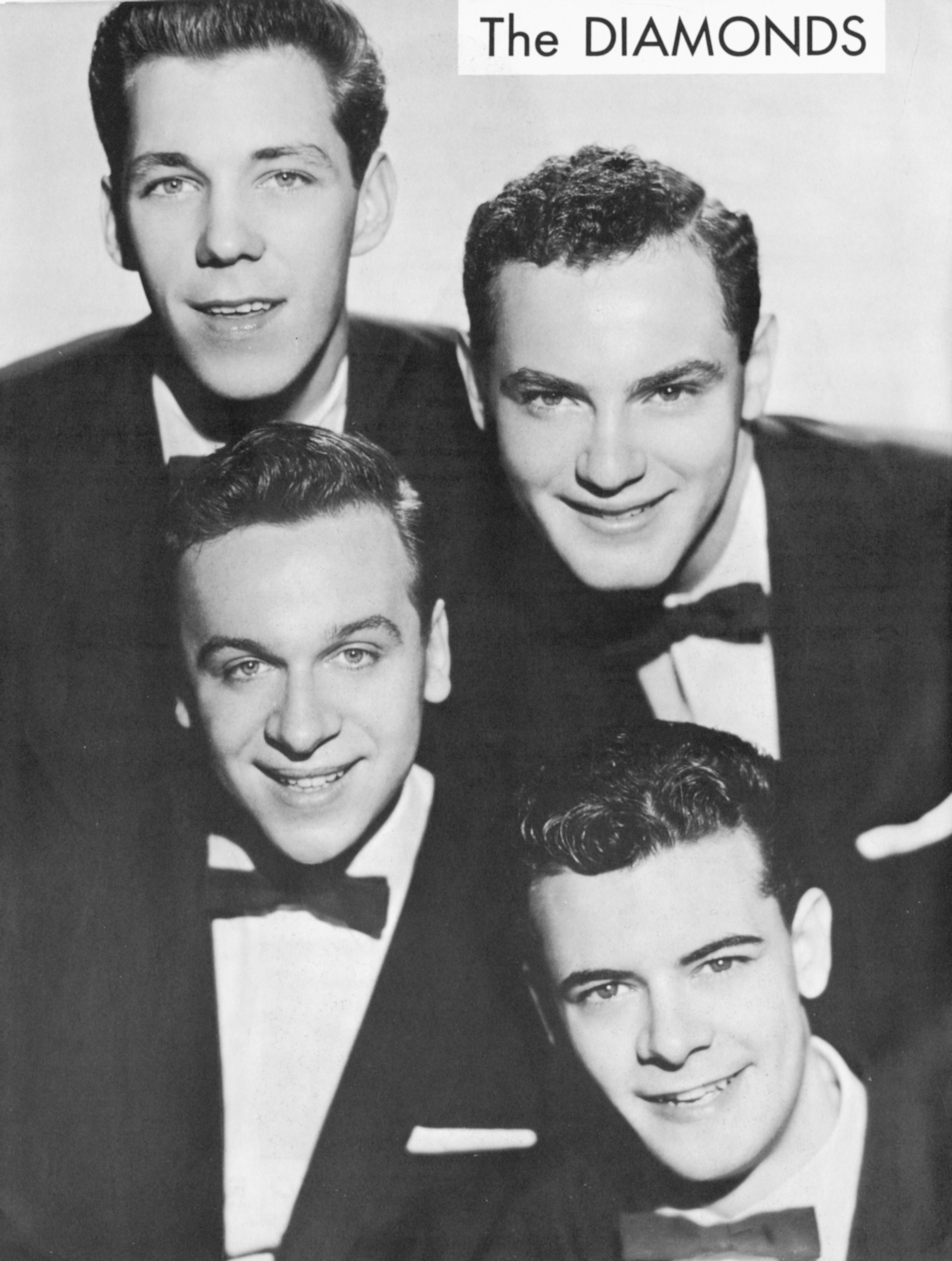 The DiamondsThe Diamonds The Diamonds Canadian pop group This article is about the Canadian quartet. For the Welsh singer-songwriter, see Marina and the Diamonds. For the Jamaican musical group, see Mighty Diamonds. The Diamonds are a Canadian vocal quartet that rose to prominence in the 1950s and early 1960s with 16 Billboard hit records. The original members were Dave Somerville (lead), Ted Kowalski (tenor), Phil Levitt (baritone), and Bill Reed (bass).[2] They were most noted for interpreting and introducing rhythm and blues vocal group music to the wider pop music audience. Quick facts Background information, Origin ... The Diamonds The group in 1957. Background information Origin Canada Genres Pop[1] Years active 1953–present Label Mercury Members Gary Owens Julian McCleary Daniel Peter… (Source: Wikipedia)