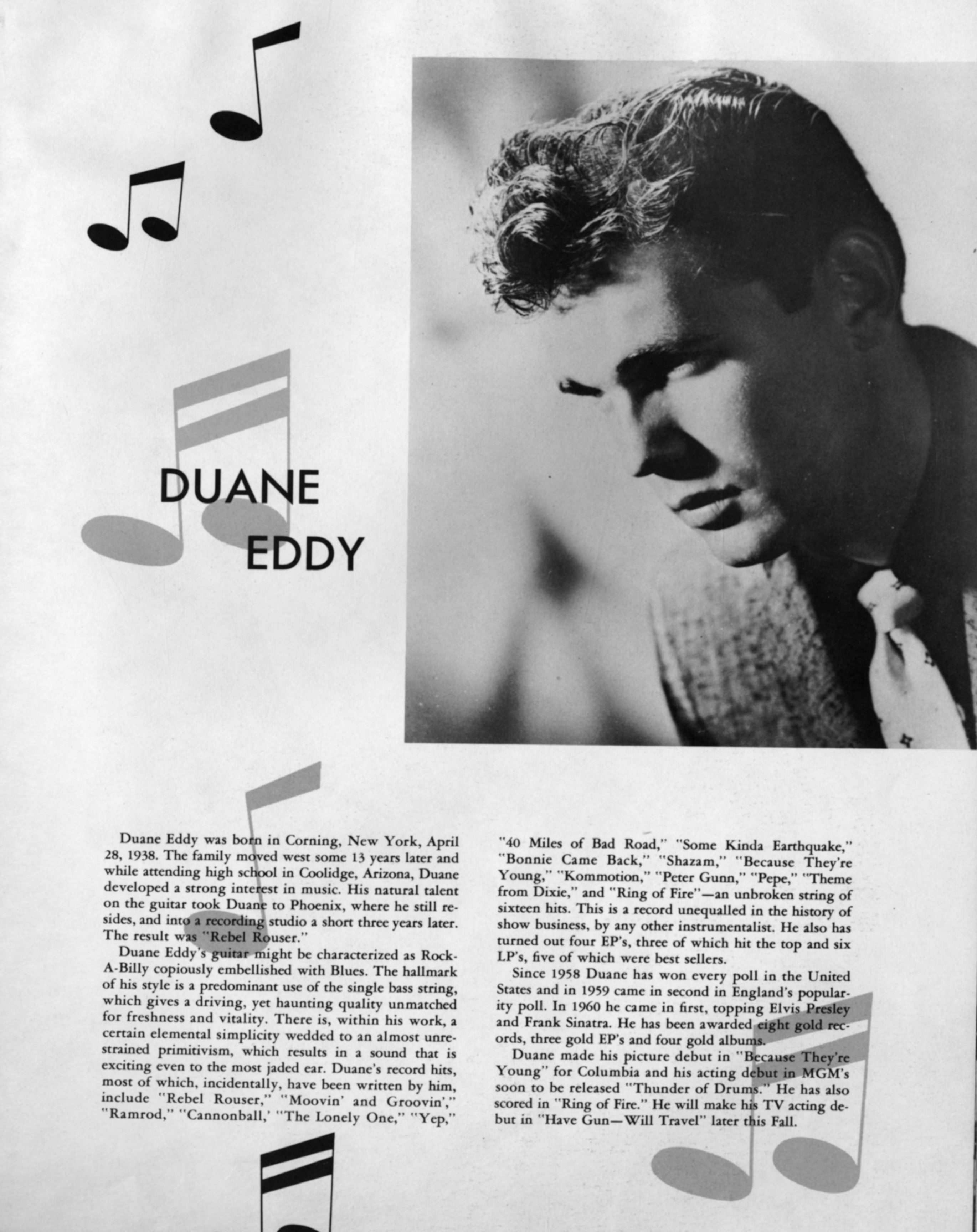 Duane EddyDuane Eddy Duane Eddy American guitarist (1938–2024) Duane Eddy (April 26, 1938 – April 30, 2024) was an American guitarist. In the late 1950s and early 1960s, he had a string of hit records produced by Lee Hazlewood which were noted for their characteristically "twangy" guitar sound, including "Rebel-'Rouser", "Peter Gunn", and "Because They're Young".[5] He had sold 12 million records by 1963. His guitar style influenced the Ventures, the Shadows, the Beatles (particularly lead guitarist George Harrison), Bruce Springsteen, Steve Earle, and Marty Stuart.[6][4] Quick facts Background information, Born ... Duane Eddy Eddy performing in 2018 Background information Born (1938-04-26)April 26, 1938 Corning, New York, U.S. Died April 30, 2024(2024-04-30) (aged 86) Franklin, Tennessee, U.S. Genres Instrumental rock[1] rockabilly[2]… (Source: Wikipedia)