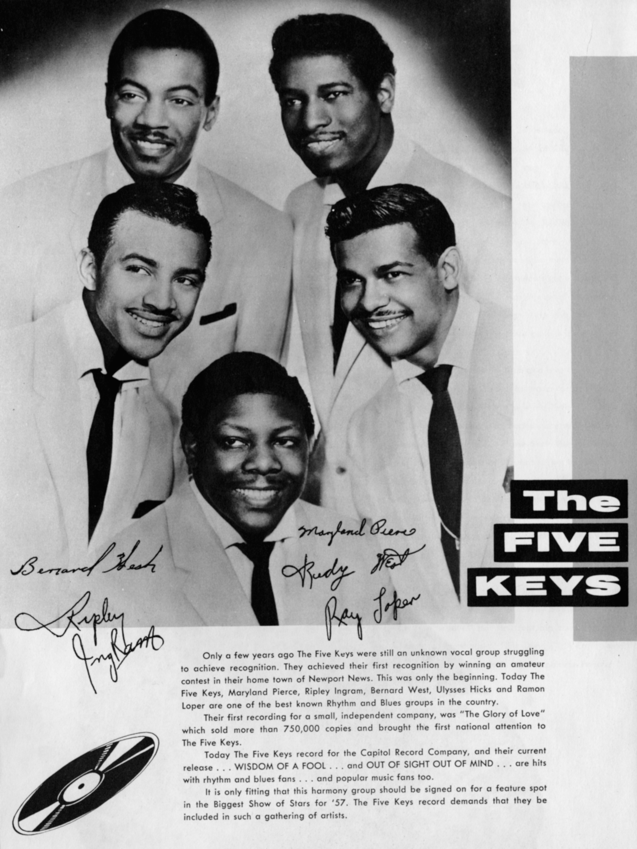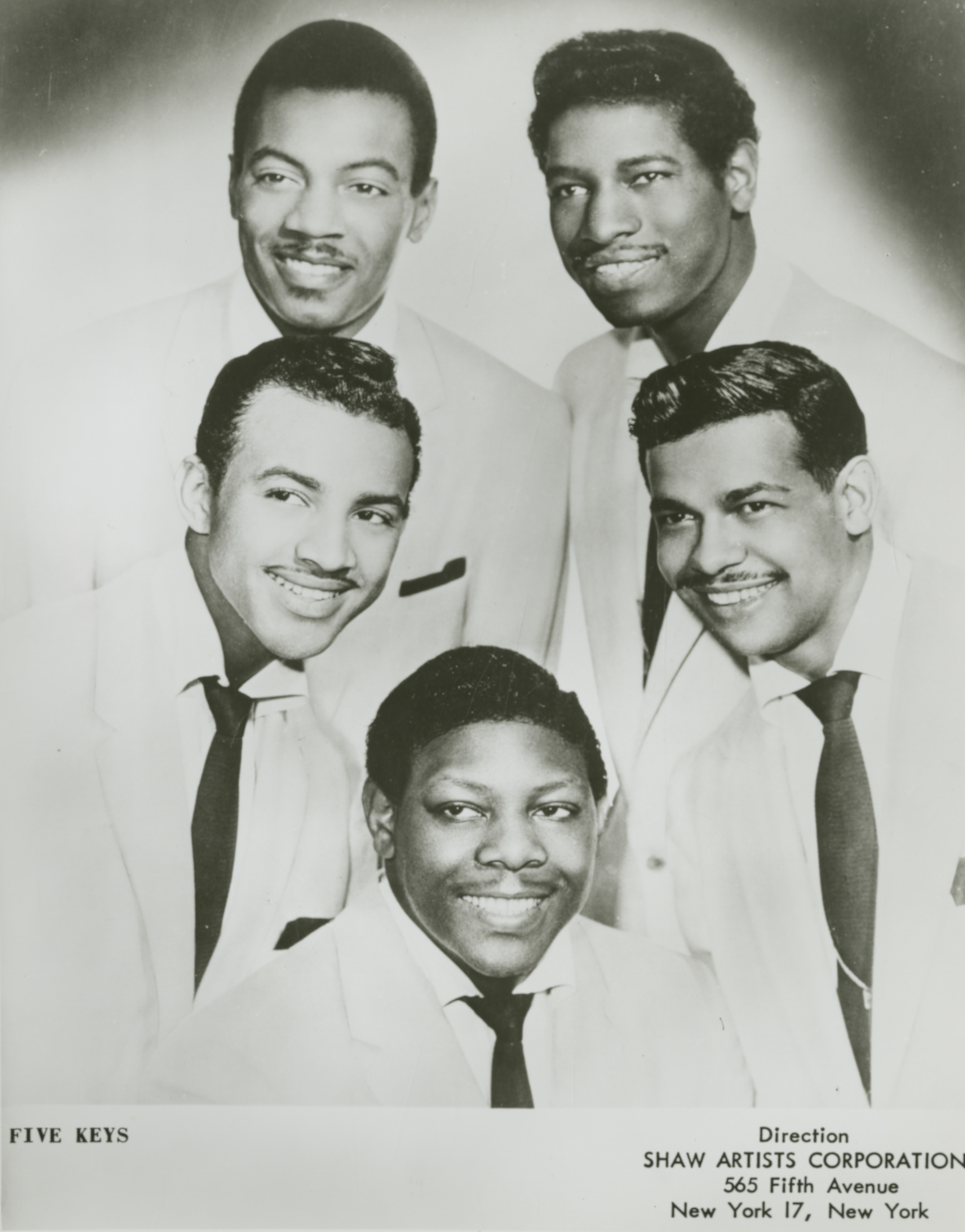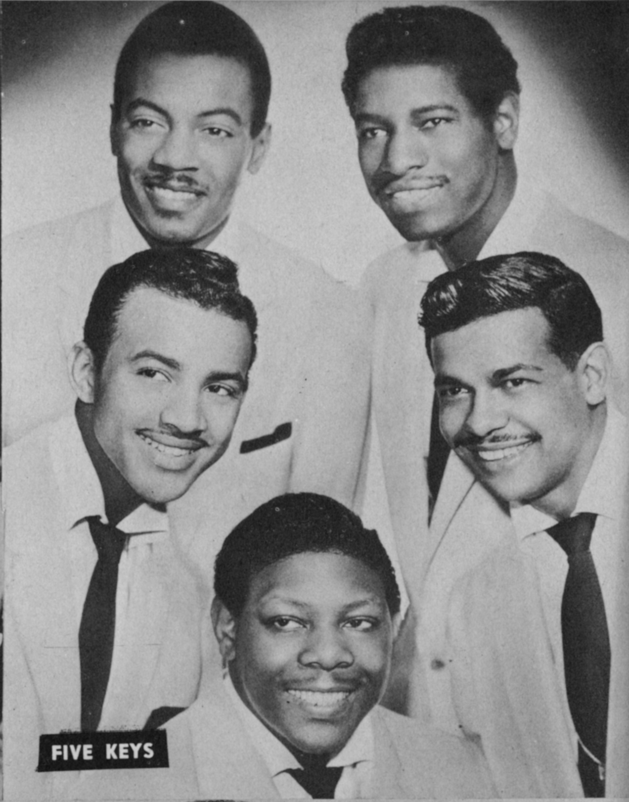 ![]() Photo of the vocal group The Five Keys. Image by Aladdin Records, via Wikimedia Commons. Licensed Public domain |