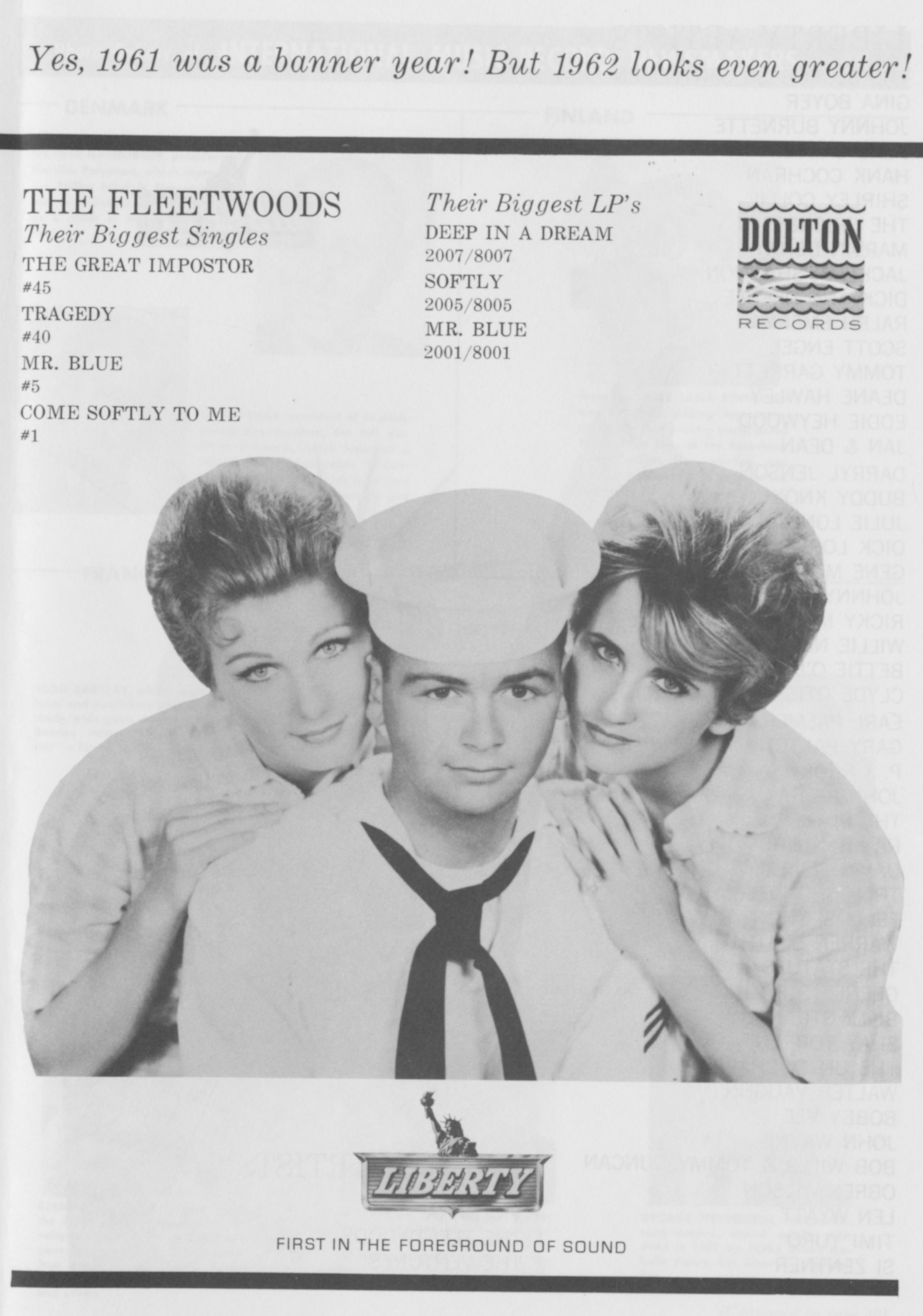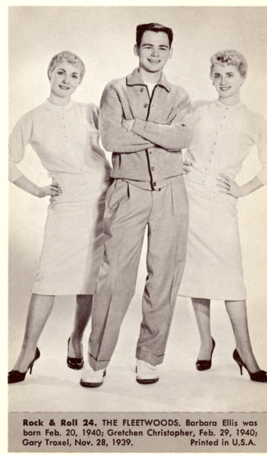 The FleetwoodsThe Fleetwoods The Fleetwoods American vocal group from Olympia, Washington Not to be confused with Fleetwood Mac. The Fleetwoods were an American vocal group from Olympia, Washington, whose members were Gary Troxel (born November 28, 1939), Gretchen Christopher (born February 29, 1940), and Barbara Ellis (born February 20, 1940).[1][2] In 1959, they twice topped the Billboard Hot 100 with their single hits "Come Softly to Me" and "Mr. Blue". This article needs additional citations for verification. (September 2012) Quick facts Origin, Genres ... The Fleetwoods Origin Olympia, Washington, U.S. Genres Pop doo-wop Years active 1958 (1958)–1983 Labels Dolton Liberty Past members Gary Troxel Gretchen Christopher Barbara Ellis Close Early history The band members met as high school students in Olympia,… (Source: Wikipedia)