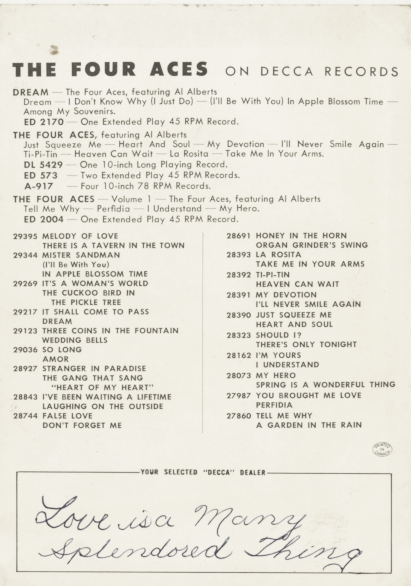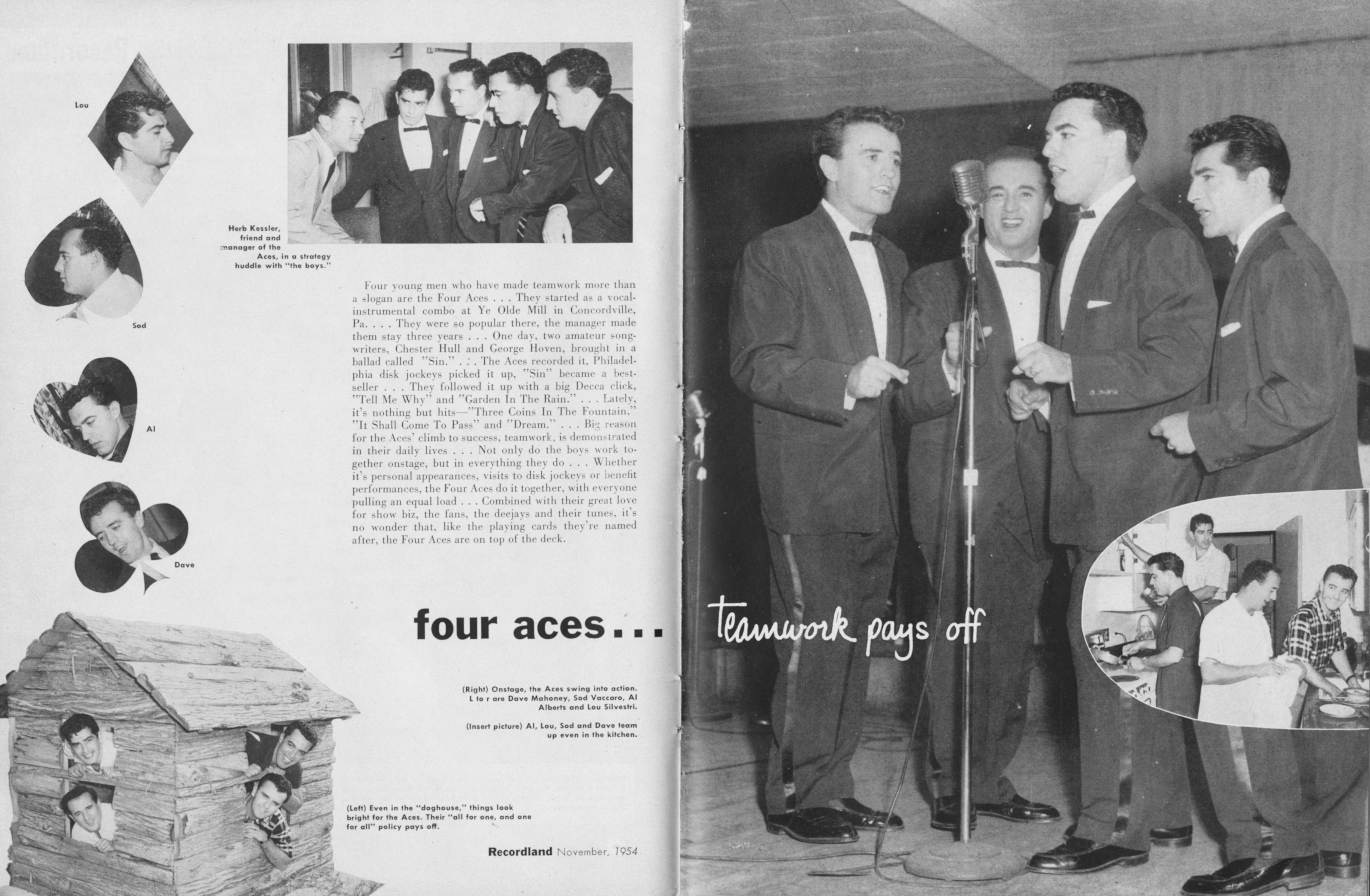 The Four AcesThe Four Aces The Four Aces American male traditional pop quartet For other uses, see The Four Aces (disambiguation). The Four Aces are an American male traditional pop quartet popular since the 1950s. Over the last half-century, the group amassed many gold records. Its million-selling songs include "Love is a Many-Splendored Thing",[1] "Three Coins in the Fountain",[2] "Stranger in Paradise",[2] "Tell Me Why",[3] and "(It's No) Sin".[3] Other big sellers included "Shangri-La", "Perfidia", "Sincerely", and "Written On The Wind". “Love Is A Many Splendored Thing” won the Academy Award for Best Song in 1955. The original members, responsible for every song made popular by the group, included Al Alberts, Dave Mahoney, Lou Silvestri, and Rosario "Sod" Vaccaro.[4] Quick facts Background… (Source: Wikipedia)