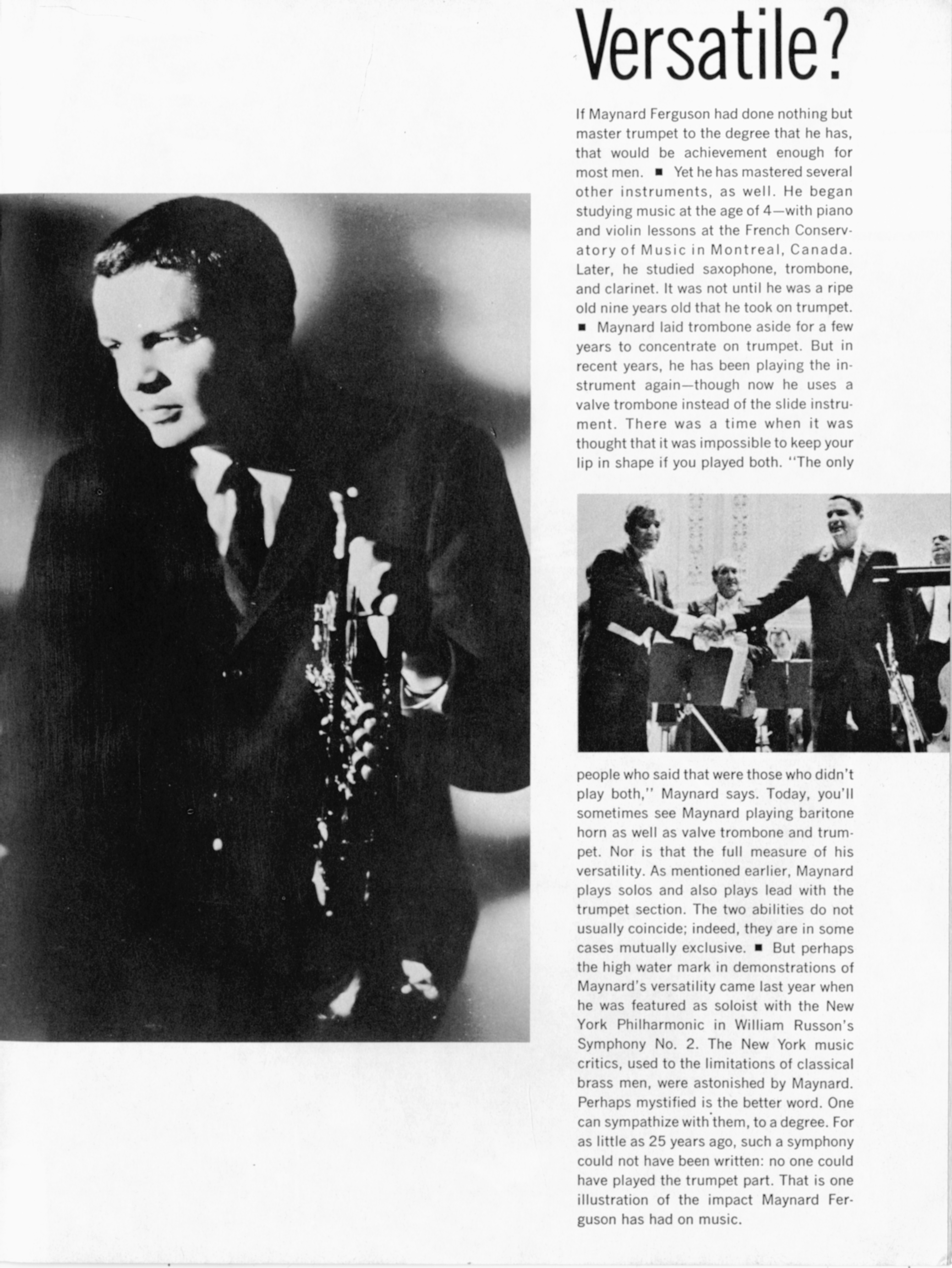 Maynard FergusonMaynard Ferguson Maynard Ferguson Canadian jazz trumpeter and bandleader (1928–2006) Walter Maynard Ferguson CM (May 4, 1928 – August 23, 2006)[1][2] was a Canadian jazz trumpeter and bandleader. He came to prominence in Stan Kenton's orchestra before forming his own big band in 1957. He was noted for his bands, which often served as stepping stones for up-and-coming talent,[3] his versatility on several instruments, and his ability to play in a high register.[3] Quick facts Background information, Born ... Maynard Ferguson Ferguson in Warsaw, 1991 Background information Born Walter Maynard Ferguson (1928-05-04)May 4, 1928 Verdun, Quebec, Canada Died August 23, 2006(2006-08-23) (aged 78) Ventura, California, U.S. Genres Jazz jazz rock jazz fusion pop Occupations Musician bandleader Instruments Trumpet flugelhorn Firebird… (Source: Wikipedia)