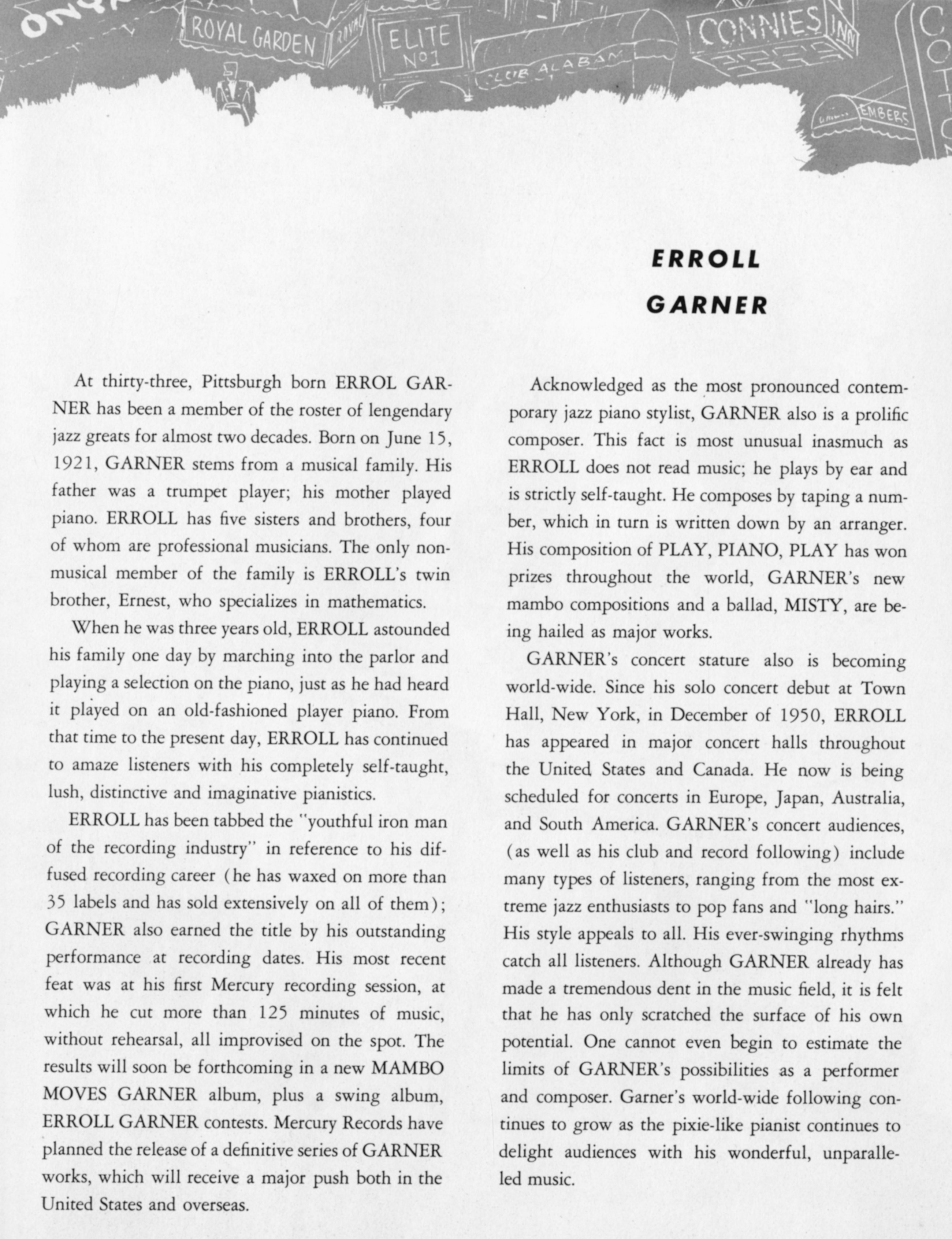 Erroll GarnerErroll Garner Erroll Garner American jazz pianist and composer (1921–1977) Erroll Louis Garner (June 15, 1921 – January 2, 1977)[1][2][3] was an American jazz pianist and composer known for his swing playing and ballads. His instrumental ballad "Misty", his best-known composition, has become a jazz standard. It was first recorded in 1956 with Mitch Miller and his orchestra, and played a prominent part in the 1971 motion picture Play Misty for Me.[4] Quick facts Background information, Born ... Erroll Garner Garner c. 1947 Background information Born Erroll Louis Garner (1921-06-15)June 15, 1921 Pittsburgh, Pennsylvania, U.S. Died January 2, 1977(1977-01-02) (aged 55) Los Angeles, California, U.S. Genres Jazz Occupations Musician composer Instrument Piano Years active 1944–1974 Labels Mercury Columbia Verve Blue… (Source: Wikipedia)