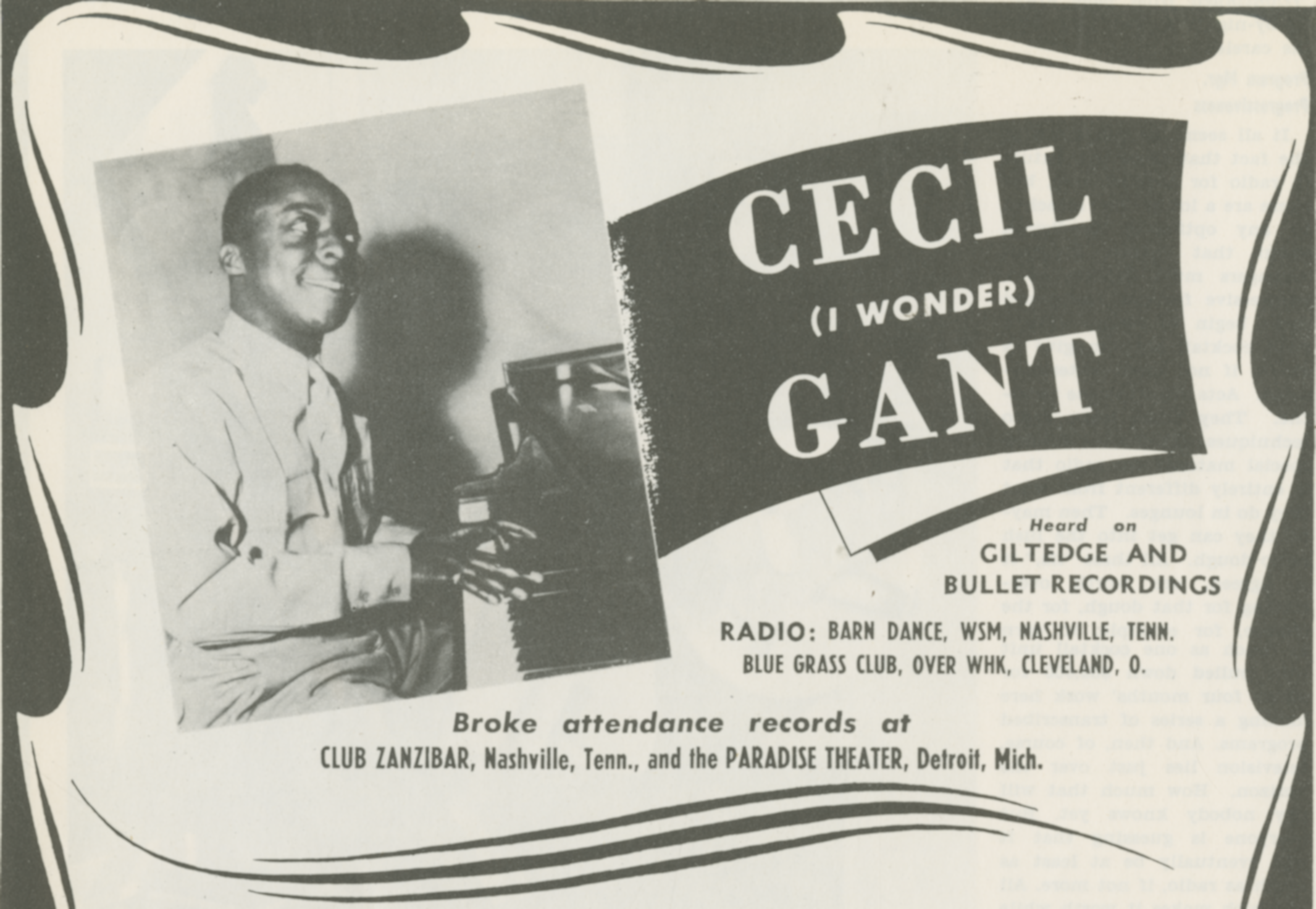 Cecil GantCecil Gant Cecil Gant American blues musician (1913–1951) Cecil Gant (April 4, 1913[nb 1] – February 4, 1951)[1] was an American blues singer, songwriter and pianist, whose recordings of both ballads and "fiery piano rockers"[2] were successful in the mid- and late 1940s, and influenced the early development of rock and roll. His biggest hits were the 1944 ballad, "I Wonder," and “We’re Gonna Rock” (1950). Quick facts Background information, Also known as ... Cecil Gant Background information Also known as Pvt. Cecil Gant "The G.I. Sing-sation" Gunter Lee Carr Born (1913-04-04)April 4, 1913 Columbia, Tennessee, United States Died February 4, 1951(1951-02-04) (aged 37) Nashville, Tennessee, U.S. Genres R&B, blues, boogie-woogie Occupations Singer, pianist, songwriter Years active 1930s–1951 Labels Bronze,… (Source: Wikipedia)