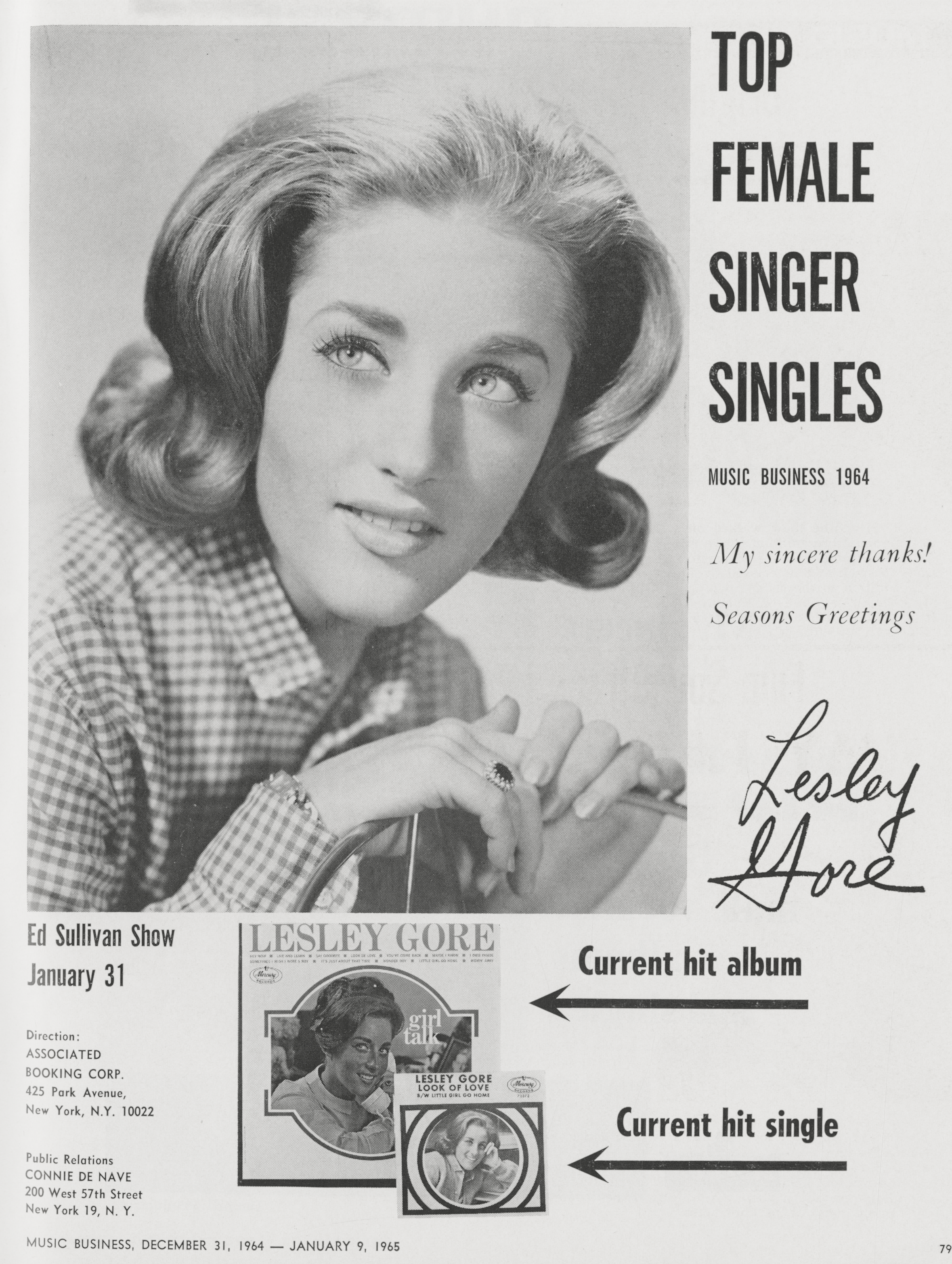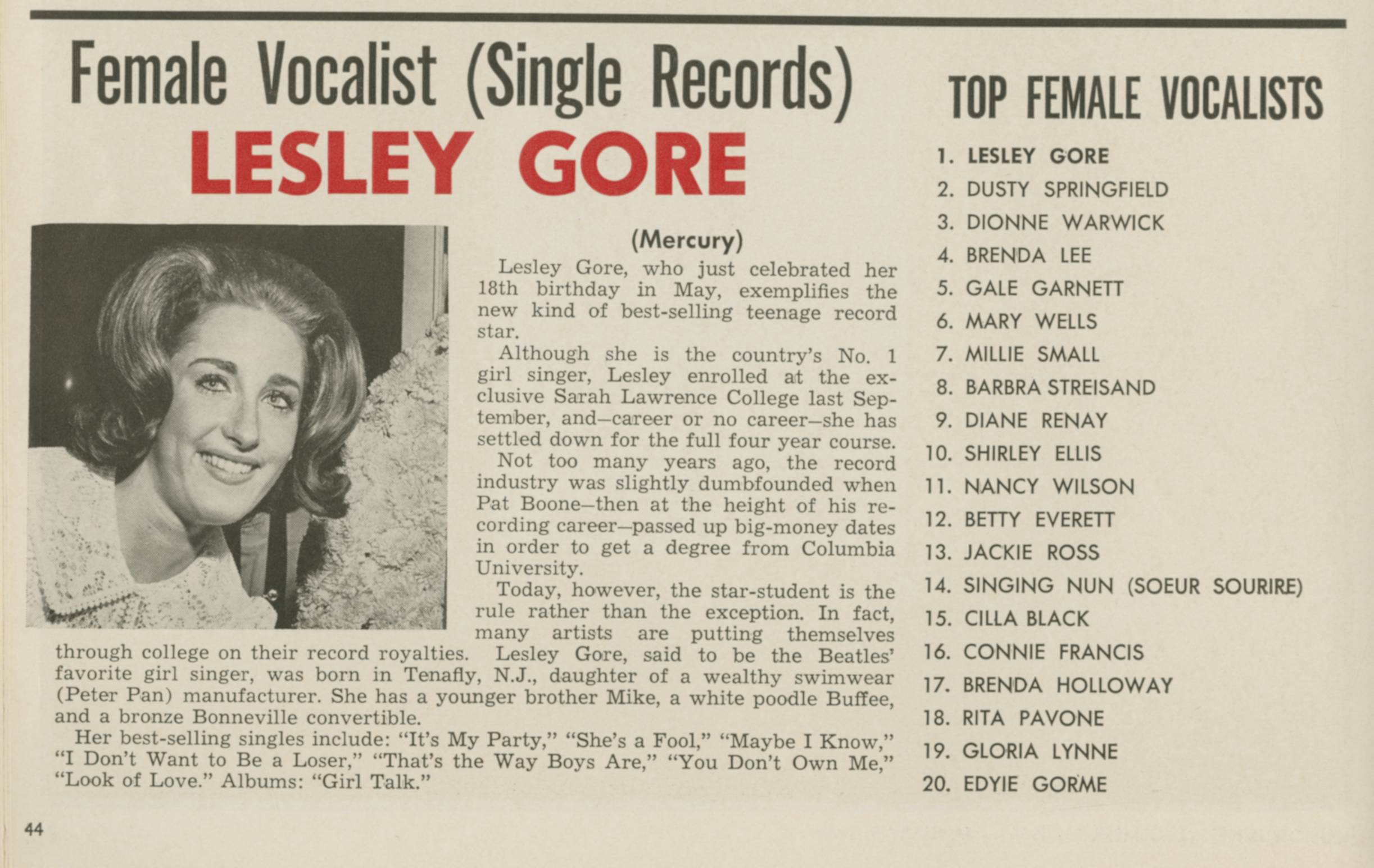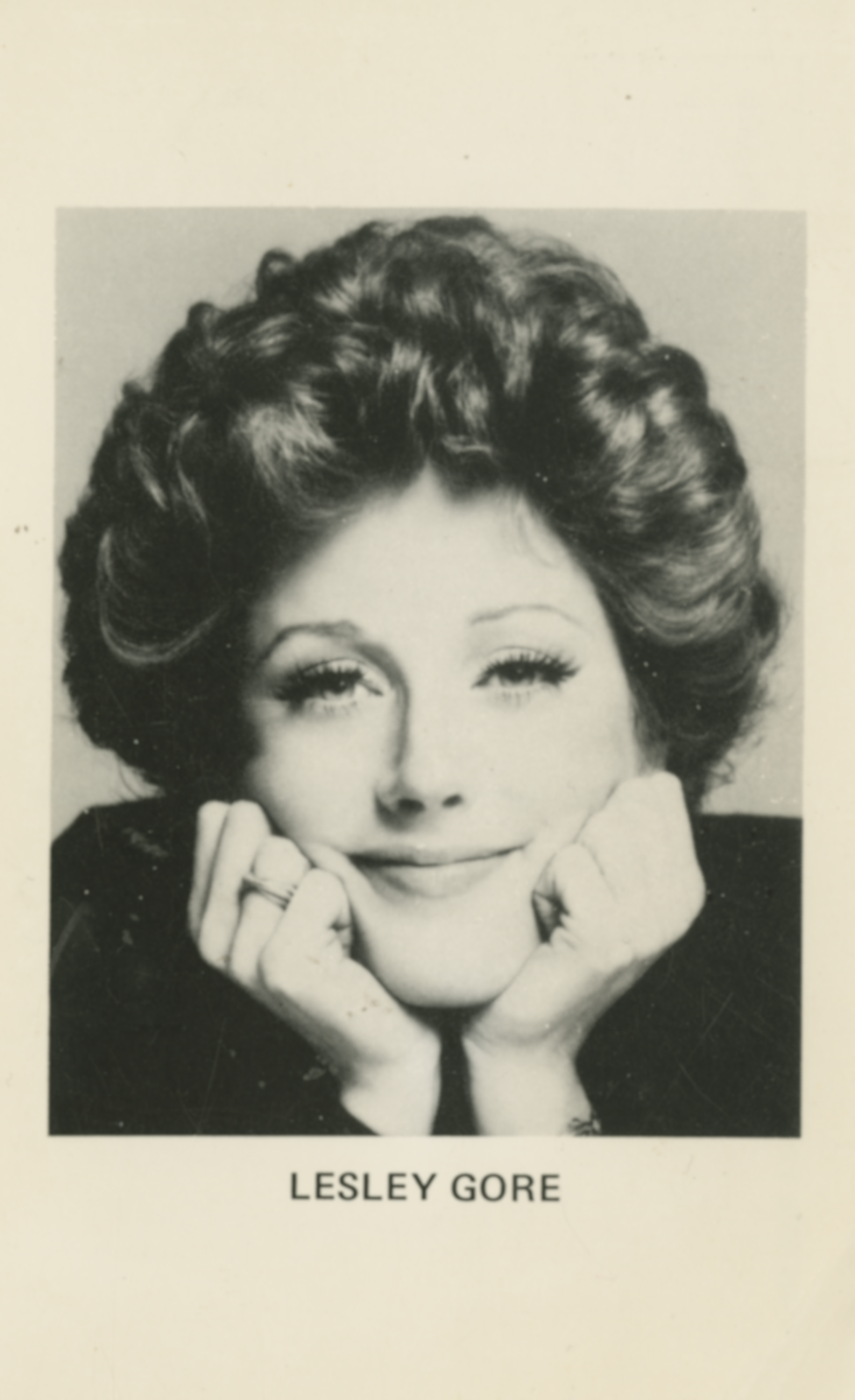 ![]() Lesley Gore Image by Bruno of Hollywood, via Wikimedia Commons. Licensed Public domain |