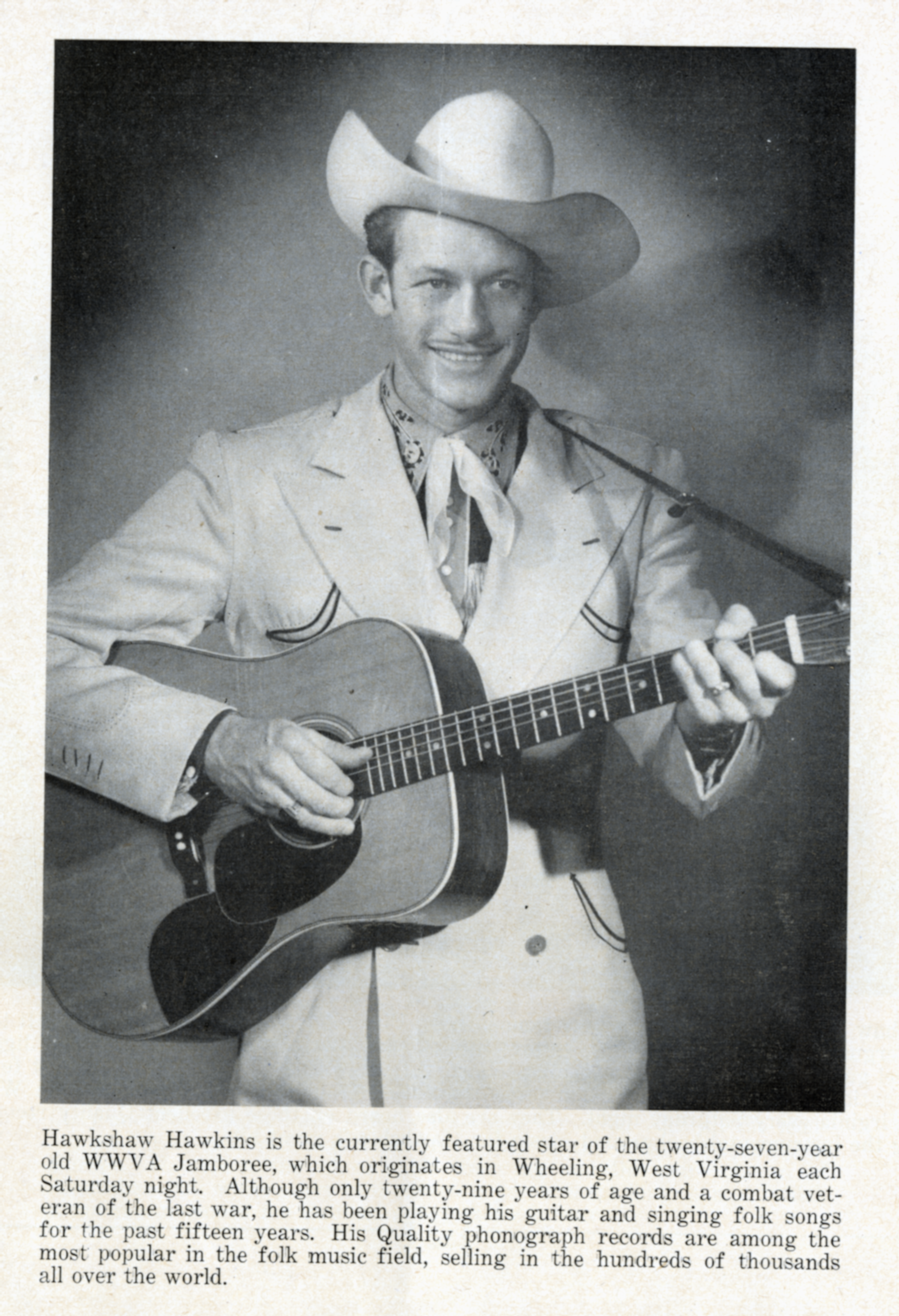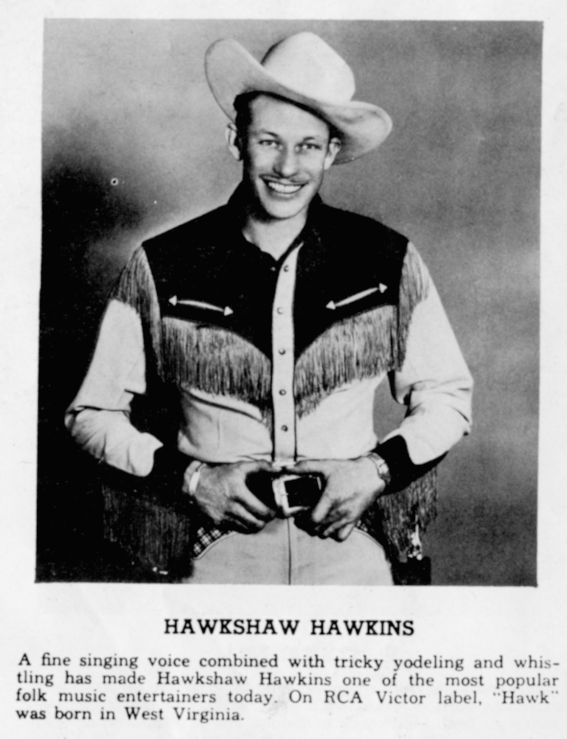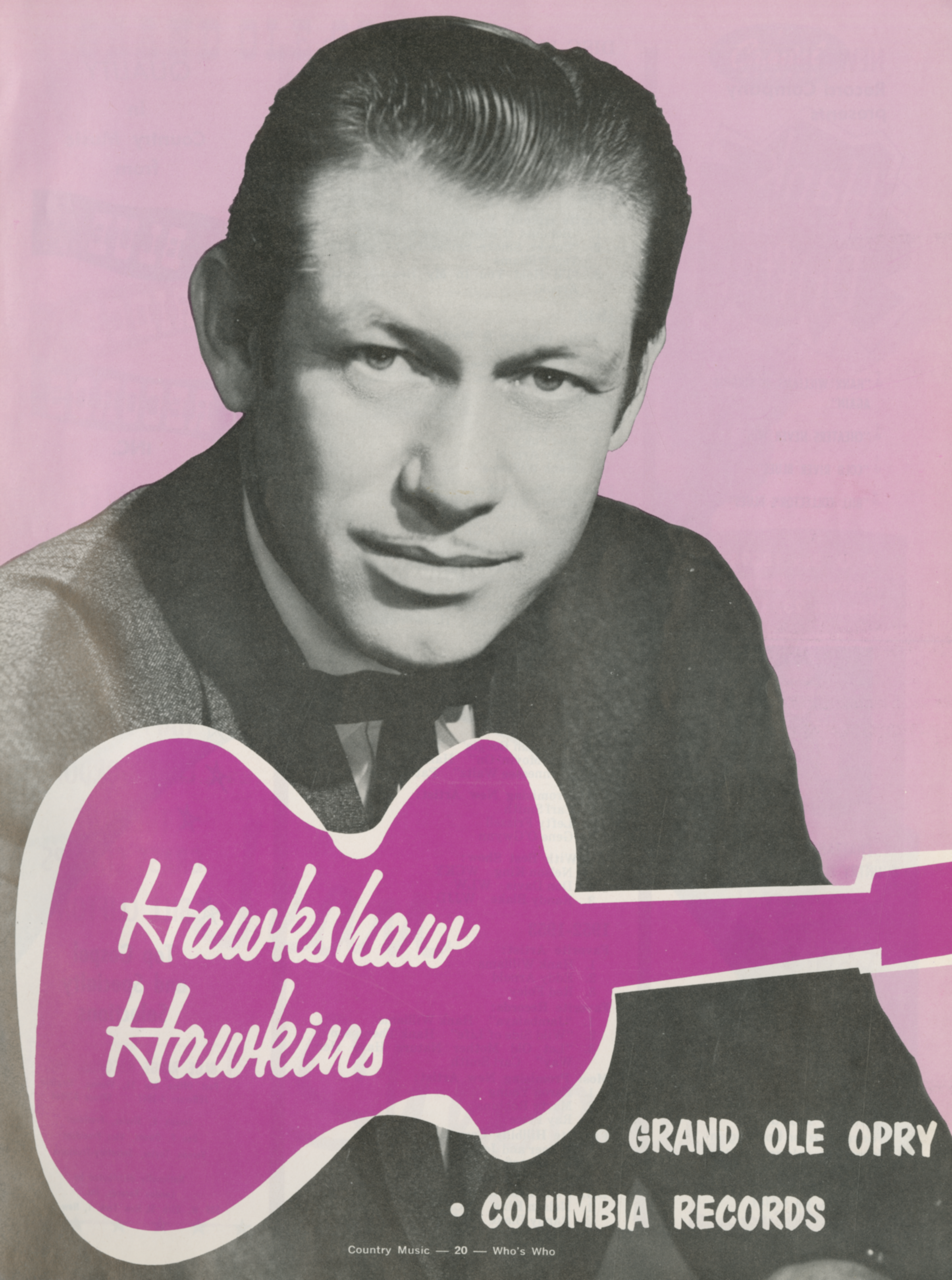 ![]() Hawkshaw Hawkins in Opry magazine, circa 1957. Image by unknown author, via Wikimedia Commons. Licensed Public domain |