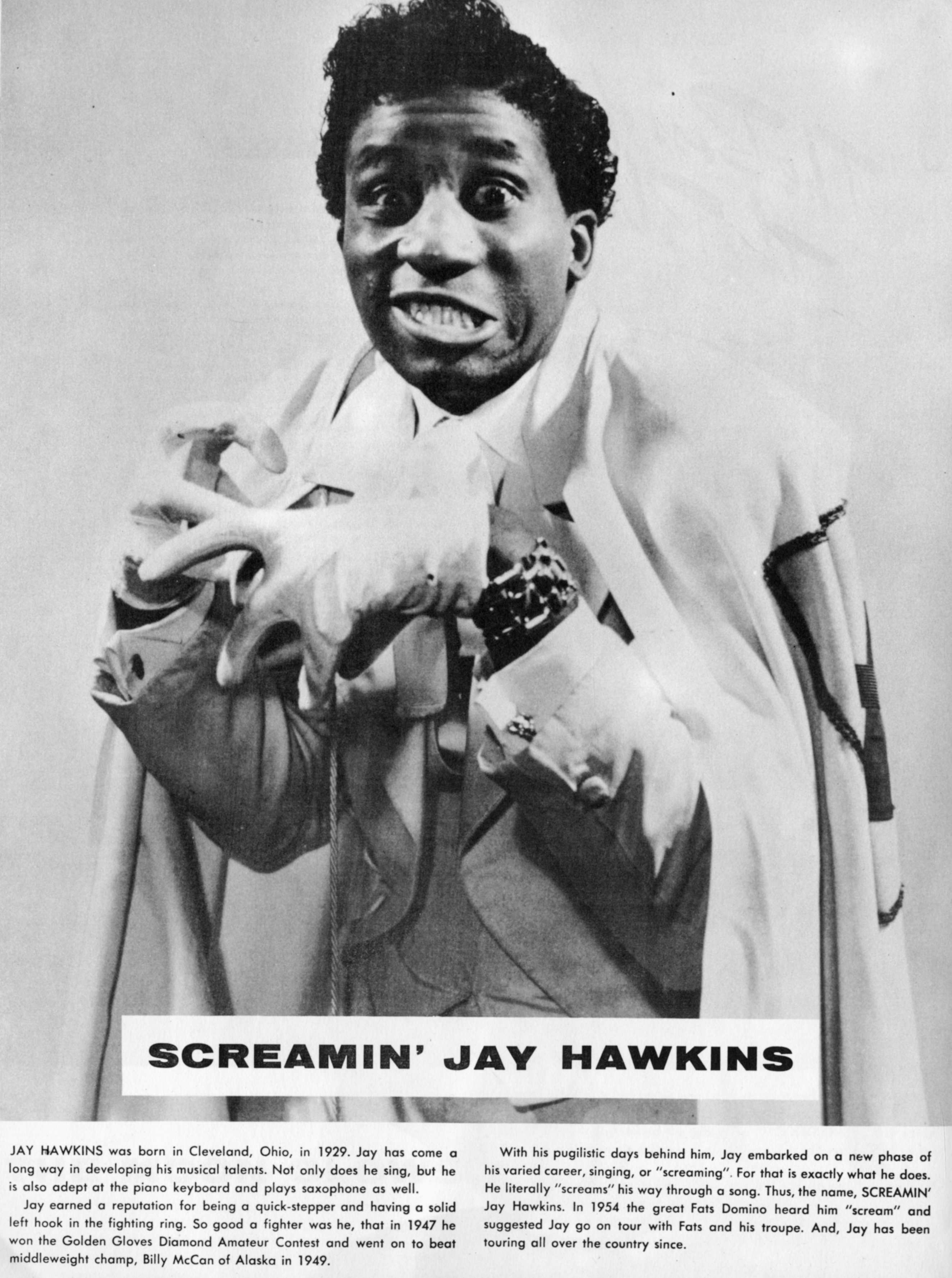Hawkins Screamin' JayScreamin' Jay Hawkins Screamin' Jay Hawkins American musician, actor, boxer (1929–2000) Jalacy J. "Screamin' Jay" Hawkins[8] (July 18, 1929 – February 12, 2000) was an American singer-songwriter, musician, actor, film producer, and boxer. Famed chiefly for his powerful, shouting vocal delivery and wildly theatrical performances of songs such as "I Put a Spell on You", he sometimes used macabre props onstage, making him an early pioneer of shock rock.[9] He received a nomination for the Independent Spirit Award for Best Supporting Male for his performance in the 1989 indie film Mystery Train.[citation needed][10] Quick facts Background information, Also known as ... Screamin' Jay Hawkins Hawkins in concert, 1995 Background information Also known as Jay Hawkins Born Jalacy J. Hawkins (1929-07-18)July… (Source: Wikipedia)