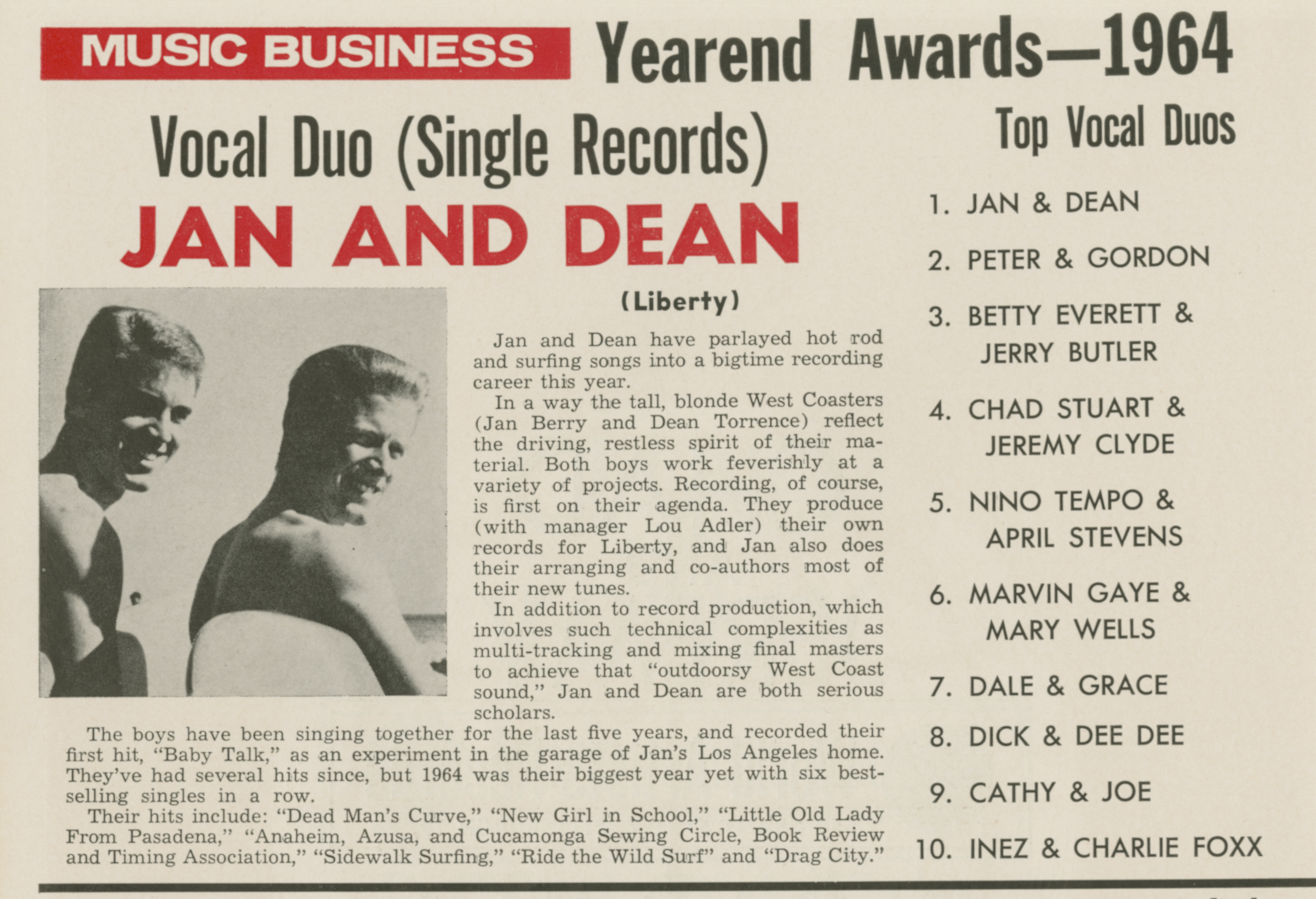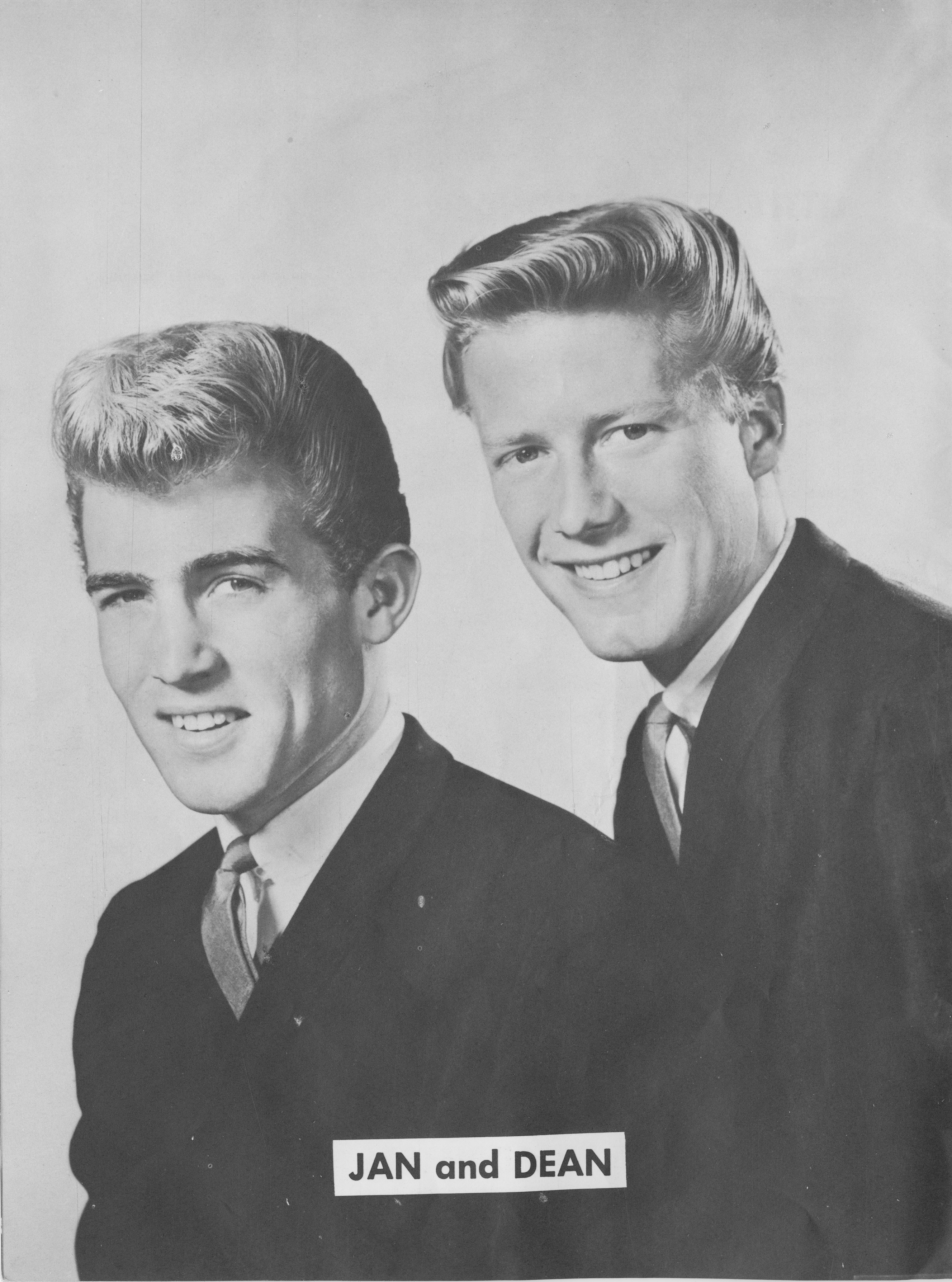 Jan & DeanJan and Dean Jan and Dean American musical duo Jan and Dean were an American rock duo consisting of William Jan Berry (April 3, 1941 – March 26, 2004)[1] and Dean Ormsby Torrence (born March 10, 1940). In the early 1960s, they were pioneers of the California Sound and vocal surf music styles later popularized by the Beach Boys. Quick facts Background information, Origin ... Jan and Dean Jan and Dean in 1964 Background information Origin Los Angeles, California, U.S. Genres Rock pop vocal surf California sound psychedelia Years active 1957–1968 1973 1976–2004 Labels Arwin Doré Ripple Challenge Liberty London J&D Jan & Dean Magic-Lamp Columbia Warner Bros. Brer Bird White Whale Sundazed Past members Jan Berry Dean Torrence Website… (Source: Wikipedia)