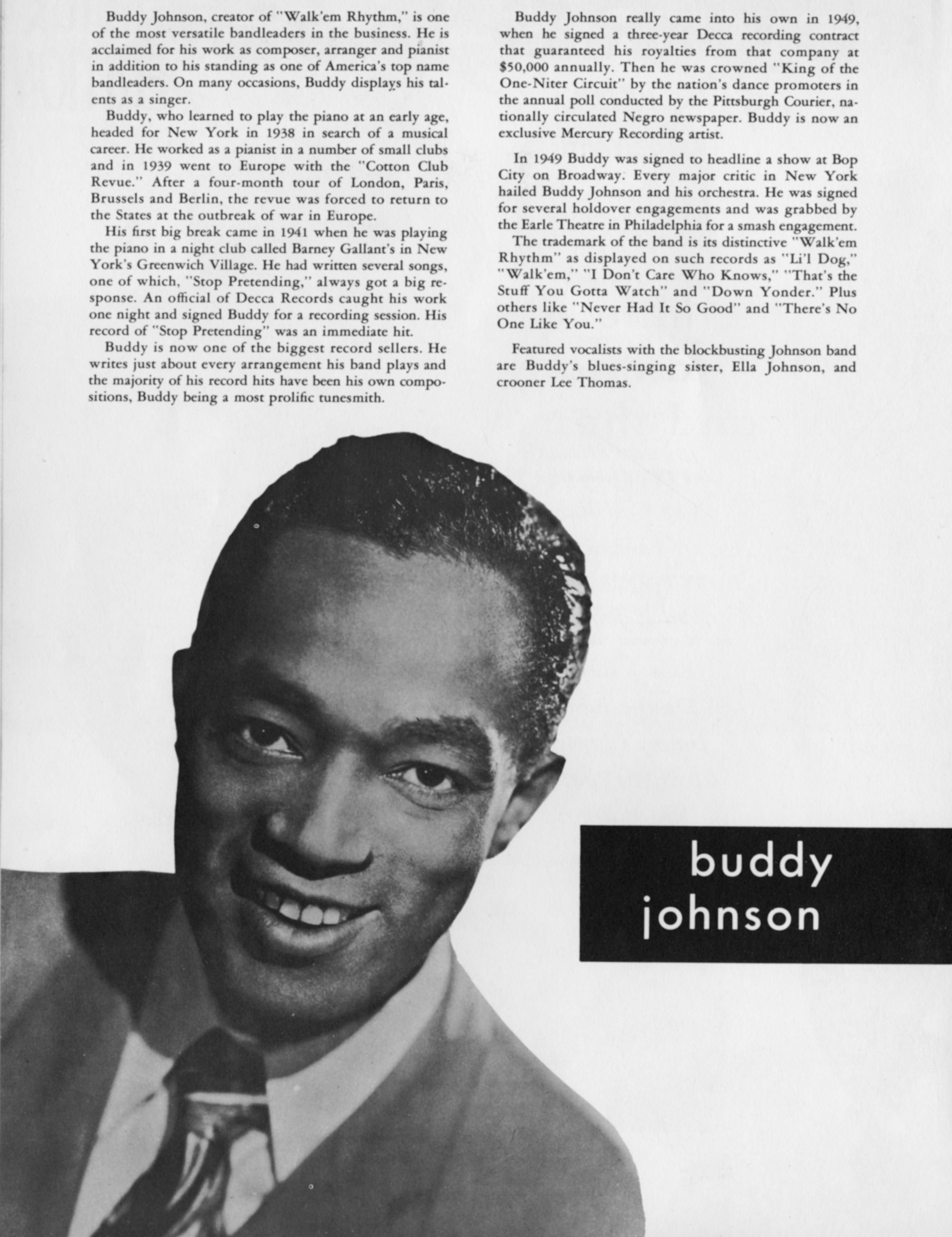 ![]() Buddy Johnson Image by Unknown authorUnknown author, via Wikimedia Commons. Licensed Public domain |