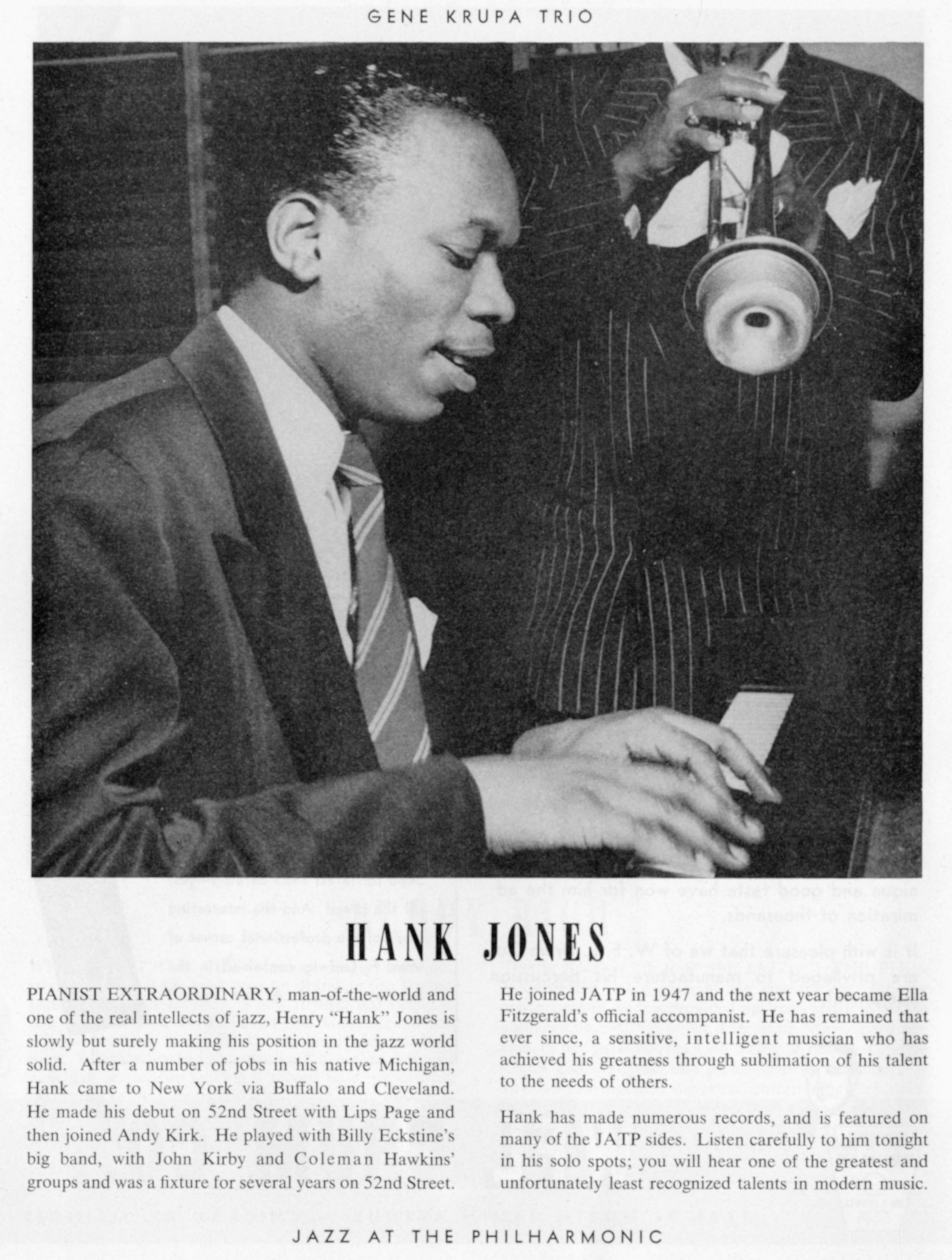 Hank JonesHank Jones Hank Jones American jazz pianist and bandleader (1918–2010) This article is about the American jazz pianist, bandleader, arranger, and composer. For other people, see Henry Jones. Henry Jones Jr. (July 31, 1918 – May 16, 2010)[1] was an American jazz pianist, bandleader, arranger, and composer. Critics and musicians have described Jones as eloquent, lyrical, and impeccable.[2] In 1989, The National Endowment for the Arts honored him with the NEA Jazz Masters Award.[3] He was also honored in 2003 with the American Society of Composers, Authors, and Publishers (ASCAP) Jazz Living Legend Award.[4] In 2008, he was awarded the National Medal of Arts. On April 13, 2009, the University of Hartford presented Jones with an honorary Doctorate of Music… (Source: Wikipedia)