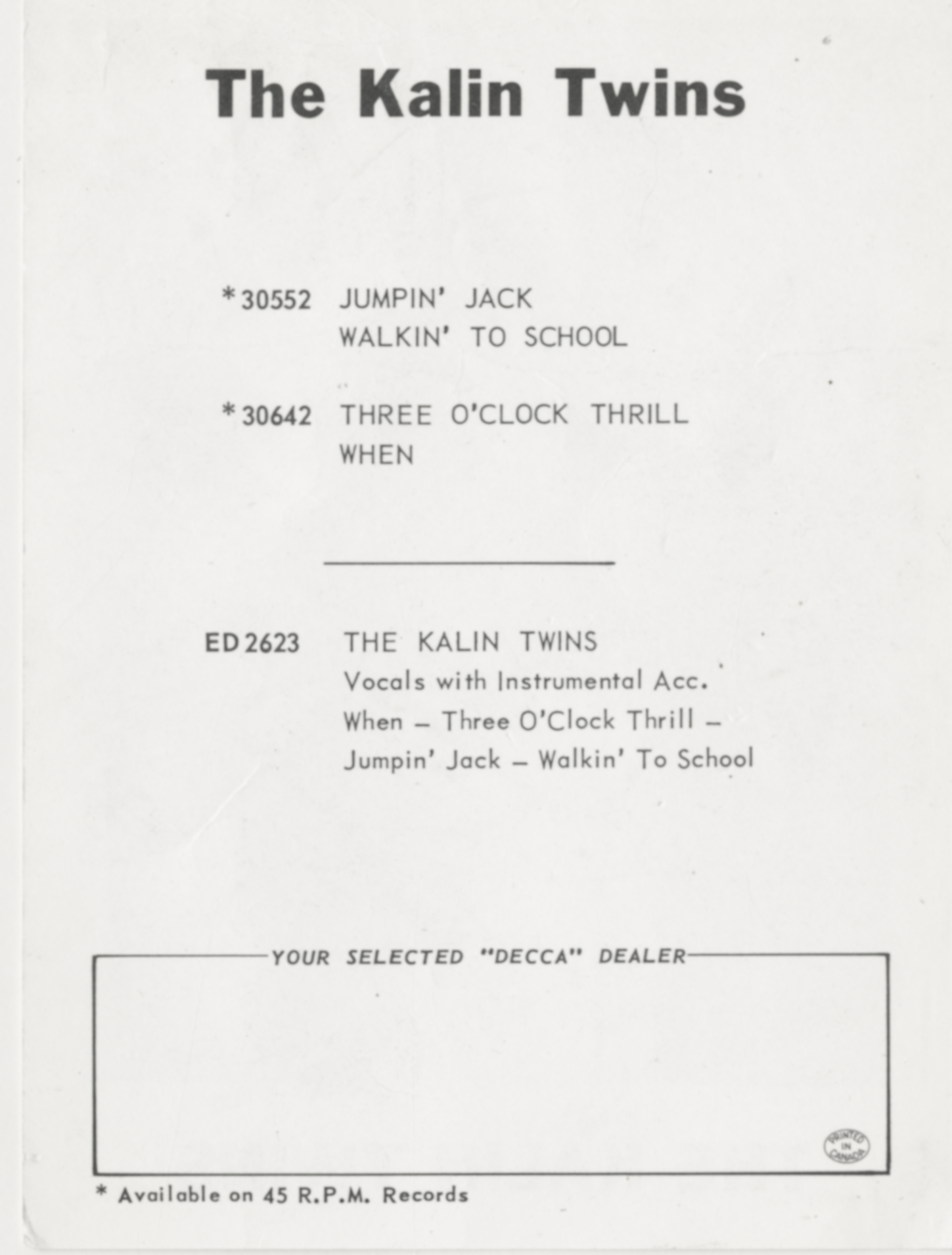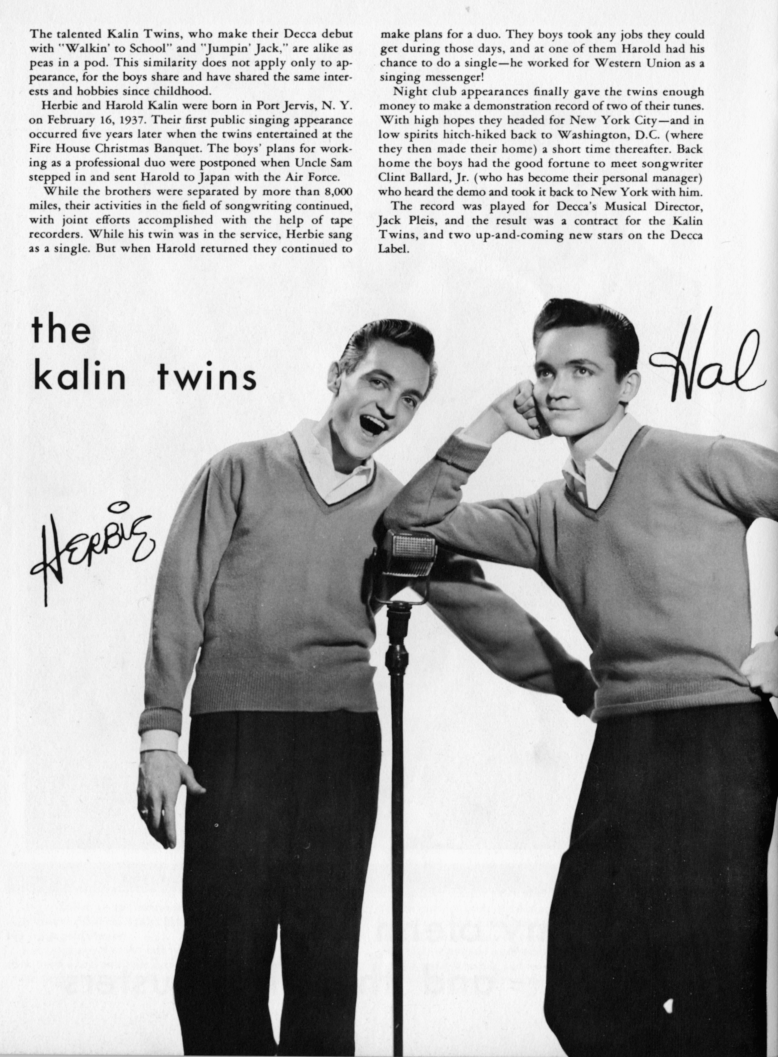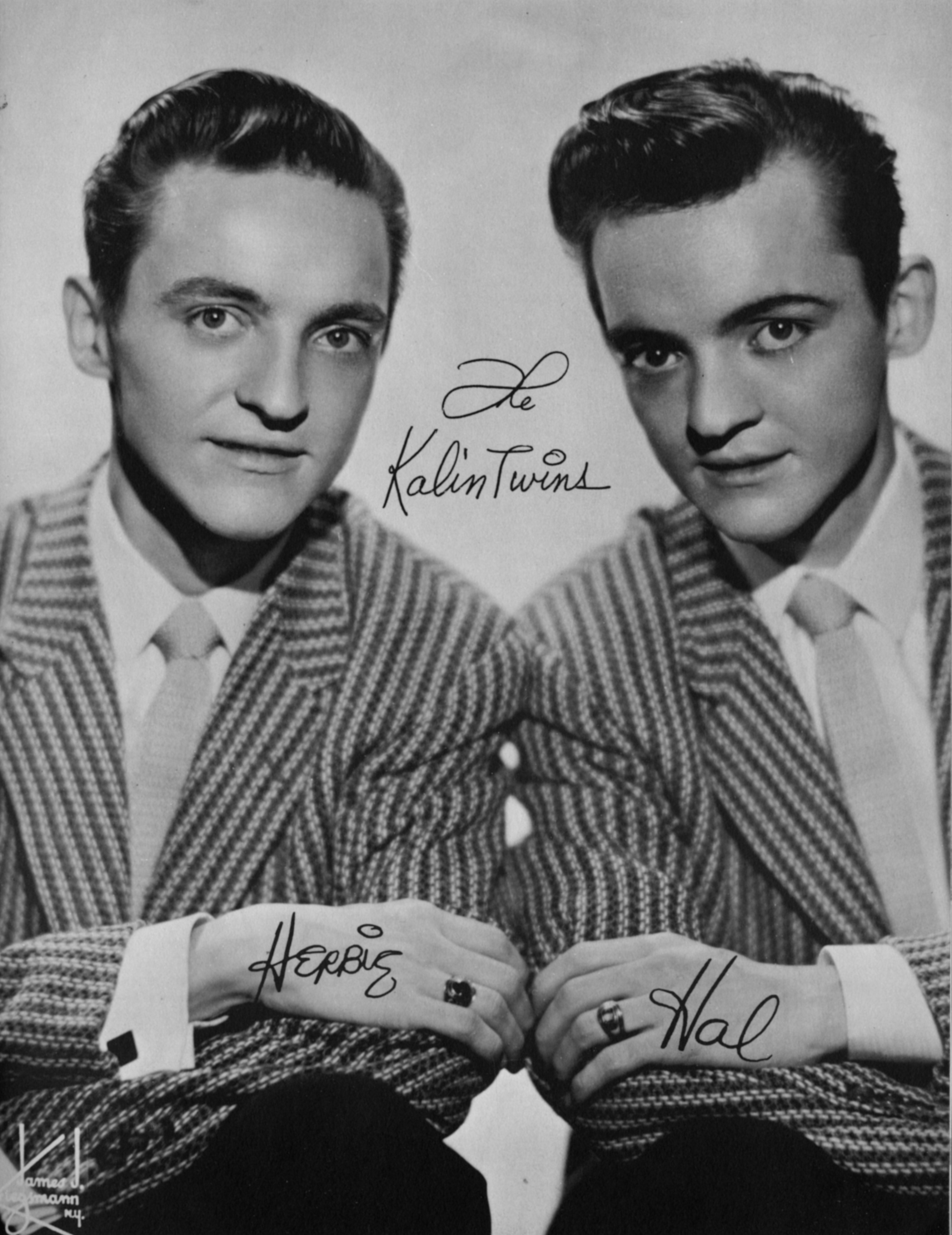 The Kalin TwinsKalin Twins Kalin Twins American pop duo The Kalin Twins (born February 16, 1934), also known as Hal and Herbie, were an American pop singing, songwriting and recording duo, formed in 1958 by twin brothers Harold Kalin and Herbert Kalin. The duo is best remembered for their number one 1958 hit "When".[2] Quick facts Also known as, Born ... Kalin Twins Also known as Hal and Herbie Born (1934-02-16)February 16, 1934 Port Jervis, New York, U.S. Died Harold: August 24, 2005 (aged 71) Herbert: July 21, 2006 (aged 72) Genres Pop Years active 1958–1962 Labels Decca Records[1] Past members Harold Kalin Herbert Kalin Close Career The twins were born in Port Jervis, New York,[3] but the family later moved to… (Source: Wikipedia)