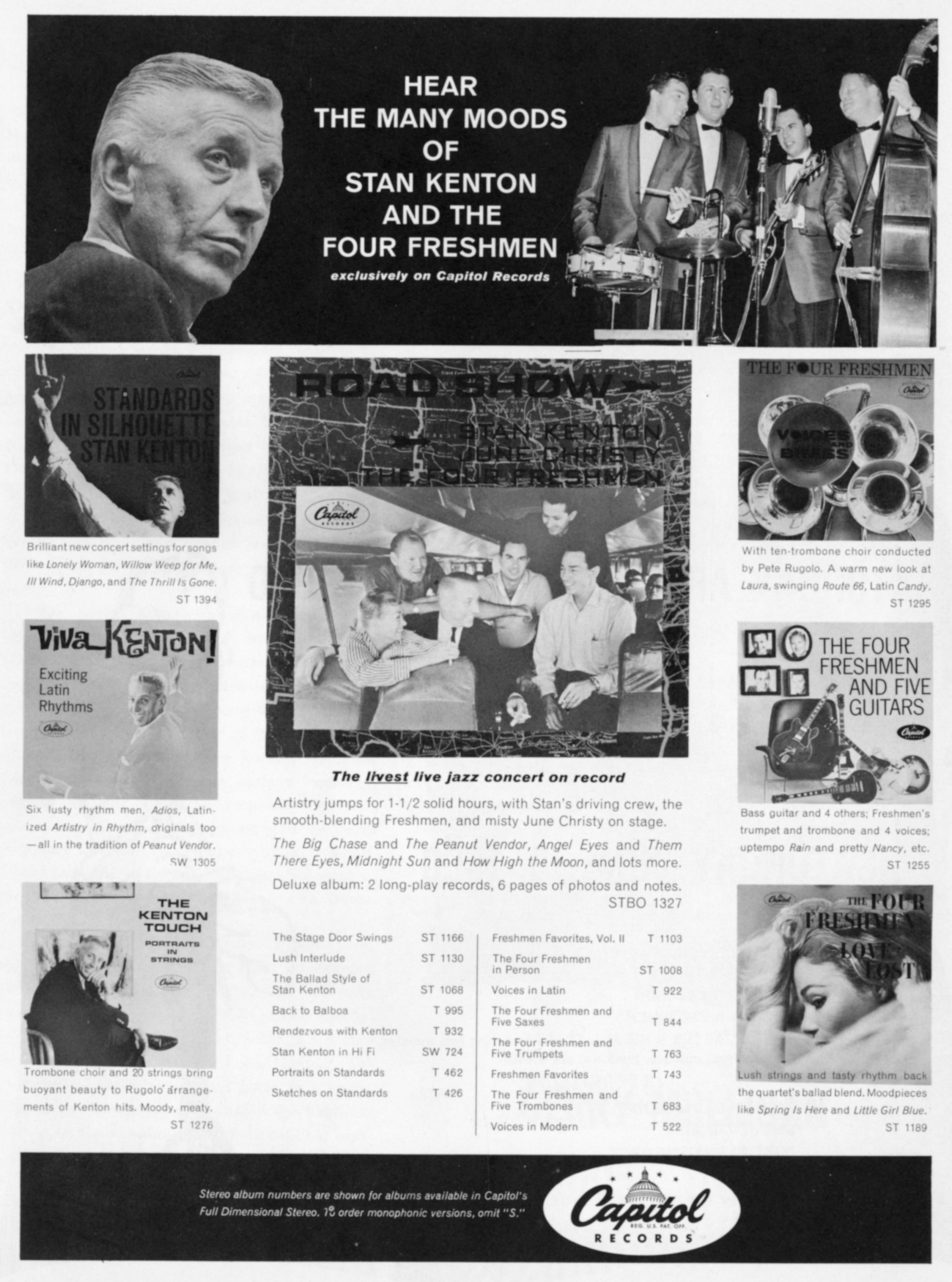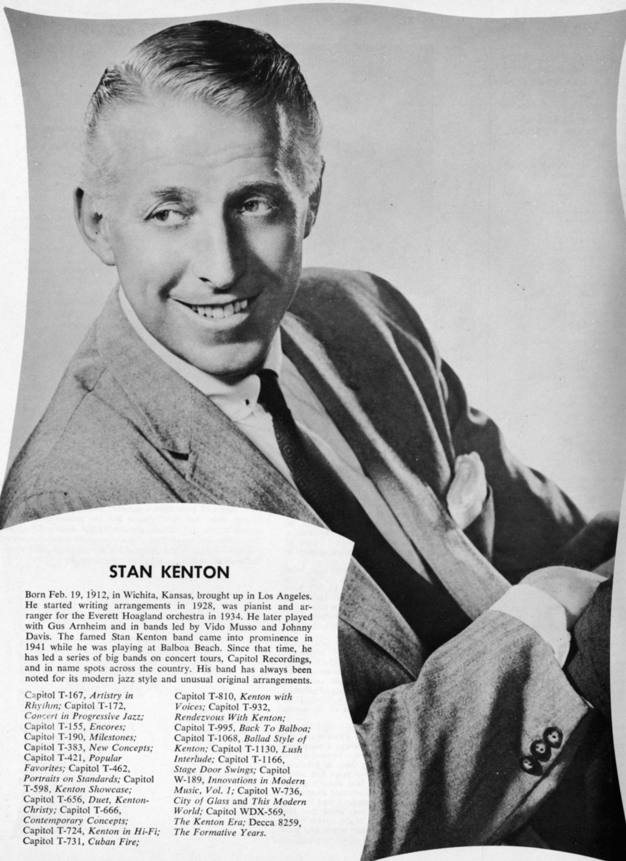 Stan KentonStan Kenton Stan Kenton American popular and jazz pianist (1911–1979) Stanley Newcomb Kenton (December 15, 1911 – August 25, 1979) was an American popular music and jazz artist. As a pianist, composer, arranger and band leader, he led an innovative and influential jazz orchestra for almost four decades. Though Kenton had several pop hits from the early 1940s into the 1960s, his music was always forward-looking. Kenton was also a pioneer in the field of jazz education, creating the Stan Kenton Jazz Camp in 1959 at Indiana University.[2] Quick facts Background information, Born ... Stan Kenton Kenton in January 1947 Background information Born Stanley Newcomb Kenton (1911-12-15)December 15, 1911 Wichita, Kansas, U.S. Died August 25, 1979(1979-08-25) (aged 67) Los Angeles,… (Source: Wikipedia)