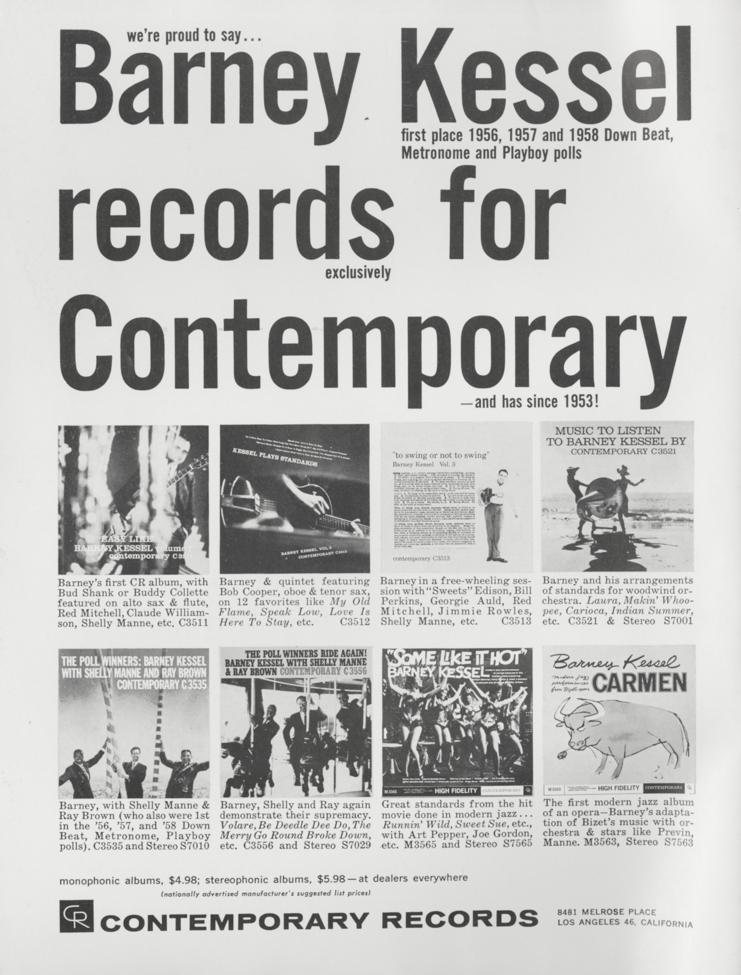 Barney KesselBarney Kessel Barney Kessel American jazz guitarist (1923–2004) Barney Kessel (October 17, 1923 – May 6, 2004) was an American jazz guitarist. Known in particular for his knowledge of chords and inversions and chord-based melodies, he was a member of many prominent jazz groups as well as a "first call" guitarist for studio, film, and television recording sessions. Kessel was a member of the group of session musicians informally known as the Wrecking Crew. Quick facts Background information, Born ... Barney Kessel Background information Born (1923-10-17)October 17, 1923 Muskogee, Oklahoma, U.S. Died May 6, 2004(2004-05-06) (aged 80) San Diego, California, U.S. Genres Jazz, bebop,[1] West coast jazz, cool jazz Occupations Musician, composer Instrument Guitar Years active 1940s–1992 Labels Contemporary, Reprise,… (Source: Wikipedia)