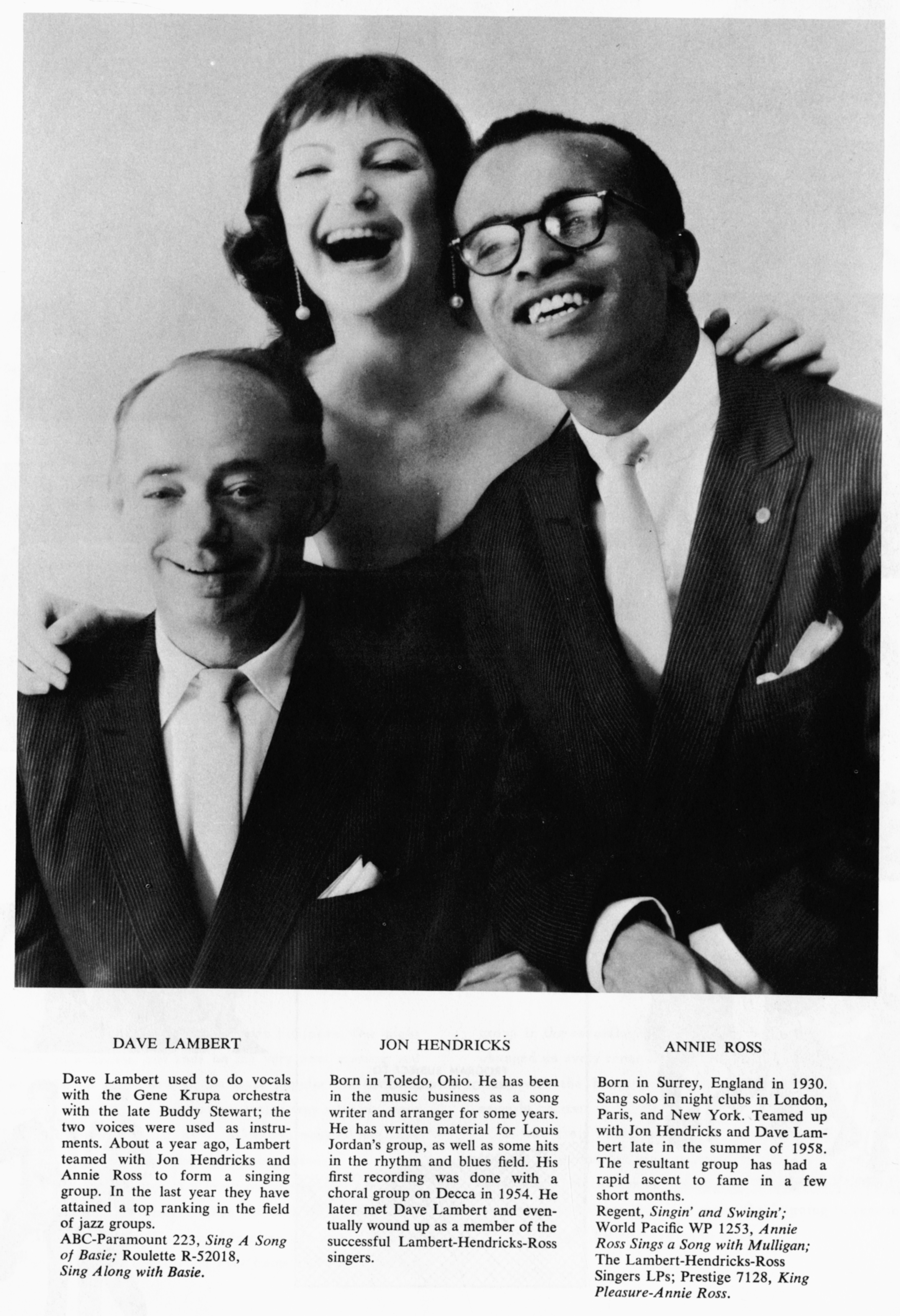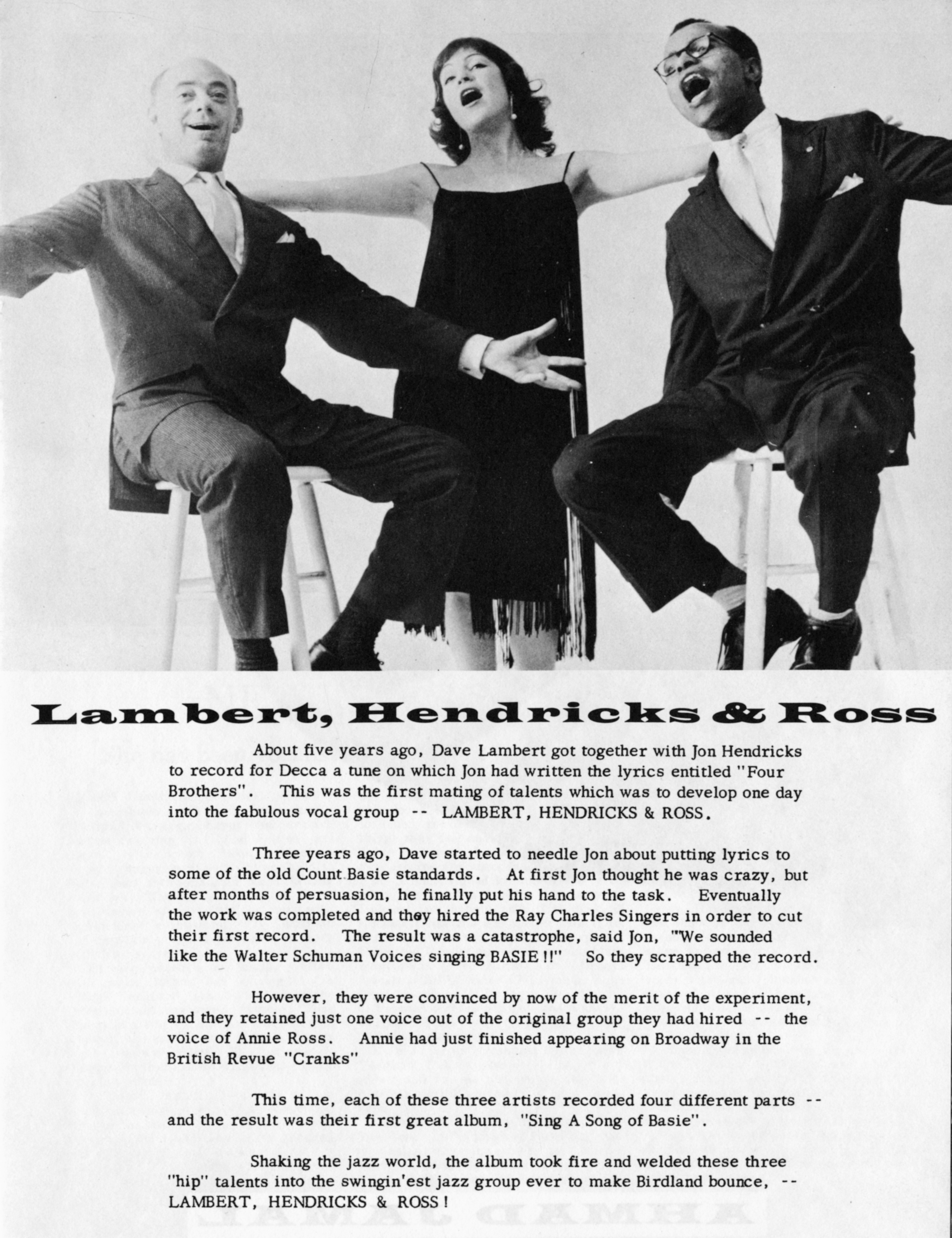Lambert Hendricks & RossLambert, Hendricks & Ross Lambert, Hendricks & Ross American vocalese trio Lambert, Hendricks & Ross were an American vocalese trio formed by jazz vocalists Dave Lambert, Jon Hendricks and Annie Ross. From 1962 to 1964, Ross was replaced by vocalist Yolande Bavan.[1] Quick facts Origin, Genres ... Lambert, Hendricks & Ross Origin New York City, US Genres Jazz, vocalese, vocal jazz Years active 1957–1964 Labels ABC-Paramount, Roulette, Columbia Past members Dave Lambert Jon Hendricks Annie Ross Yolande Bavan Carol Sloane Anne Marie Moss Close History The group formed in 1957 and recorded their first album Sing a Song of Basie (1958) for ABC-Paramount Records. The album featured versions of Count Basie standards and was successful enough that the Count Basie… (Source: Wikipedia)
