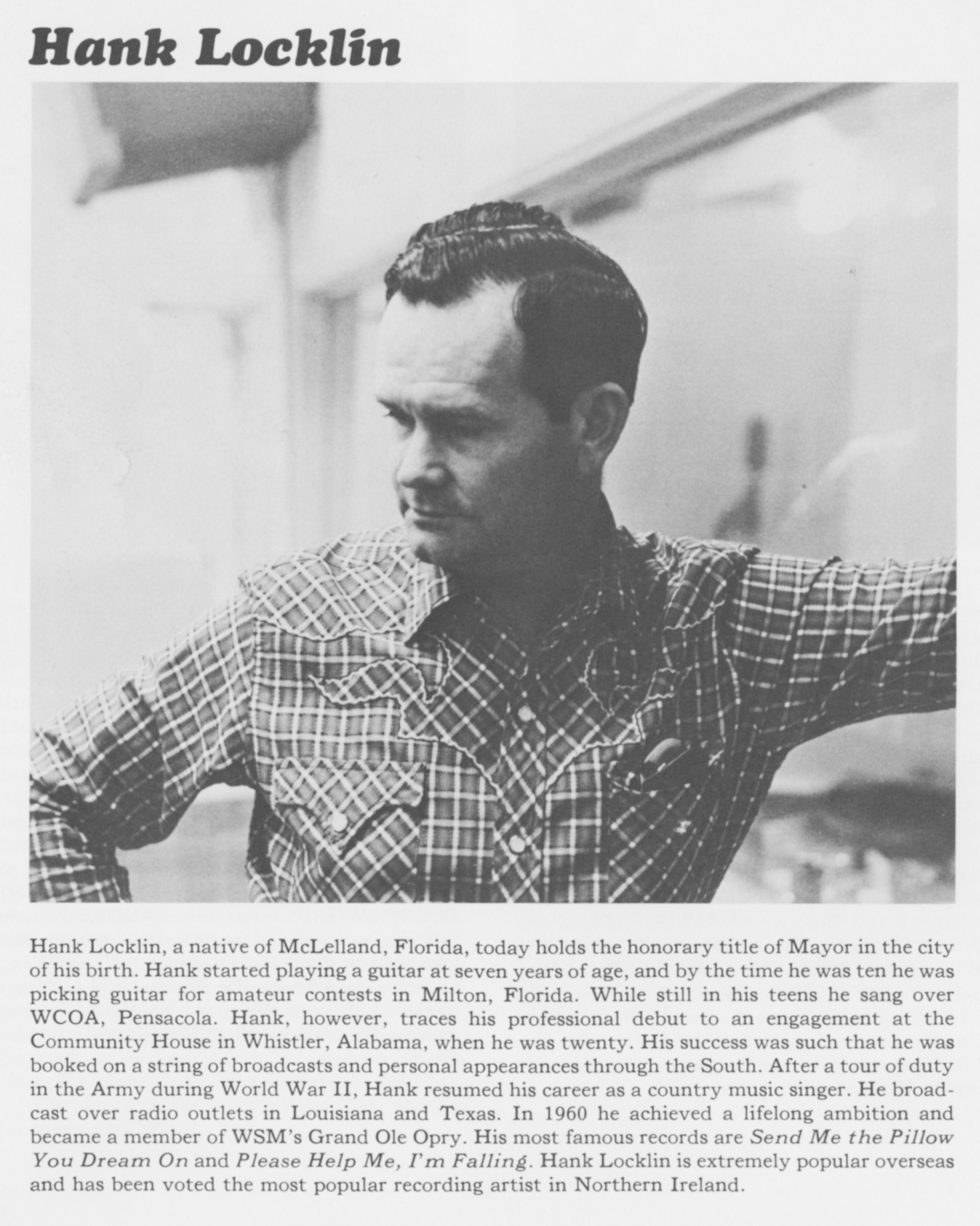 ![]() Hank Locklin photograph taken for the Grand Ole Opry magazine, circa 1966. Image by Les Leverett, Beverly LeCroy and Marvin Cartwright, via Wikimedia Commons. Licensed Public domain |