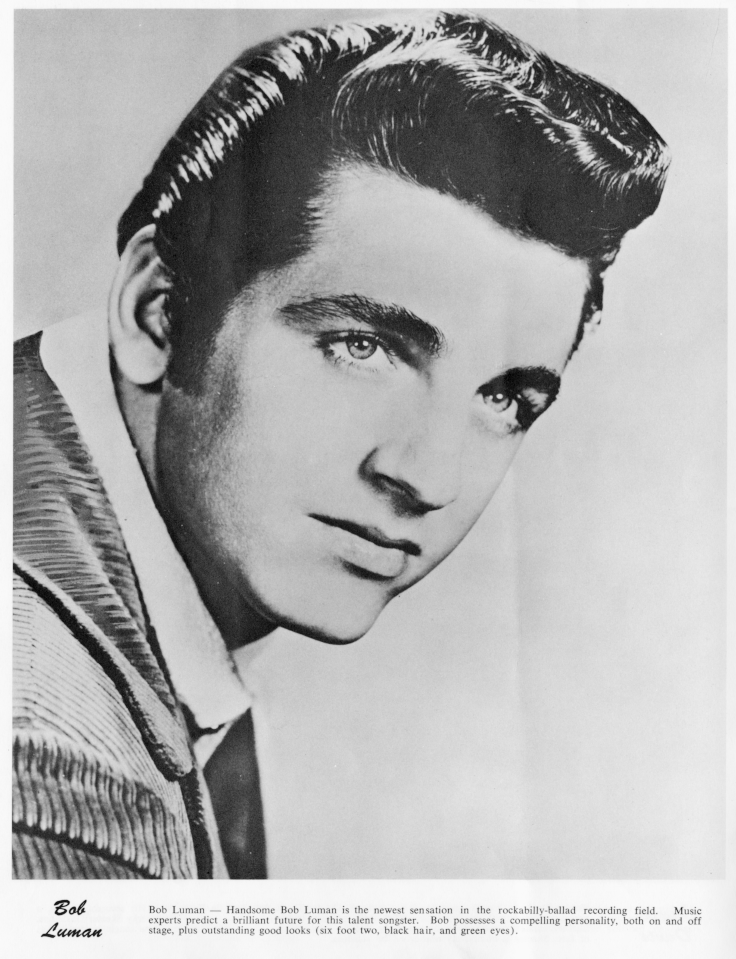 Bob LumanBob Luman Bob Luman American country and rockabilly singer (1937–1978) Robert Glynn Luman (April 15, 1937 – December 27, 1978)[1] was an American country and rockabilly singer. Quick facts Born, Origin ... Bob Luman Born Robert Glynn Luman (1937-04-15)April 15, 1937 Blackjack, Texas, U.S. Origin Nacogdoches, Texas Died December 27, 1978(1978-12-27) (aged 41) Nashville, Tennessee, U.S. Genres Country, rockabilly Occupation Singer Instruments Vocals, guitar Years active 1956–1978 Close Early life and career Luman was born in Blackjack, Texas, United States,[1] and raised in Nacogdoches, Texas. His early interest in music was influenced by his father, an amateur fiddle, guitar, and harmonica player.[1] Bob Luman received his first guitar when he was 13 years of age.[2] He attended high school in… (Source: Wikipedia)