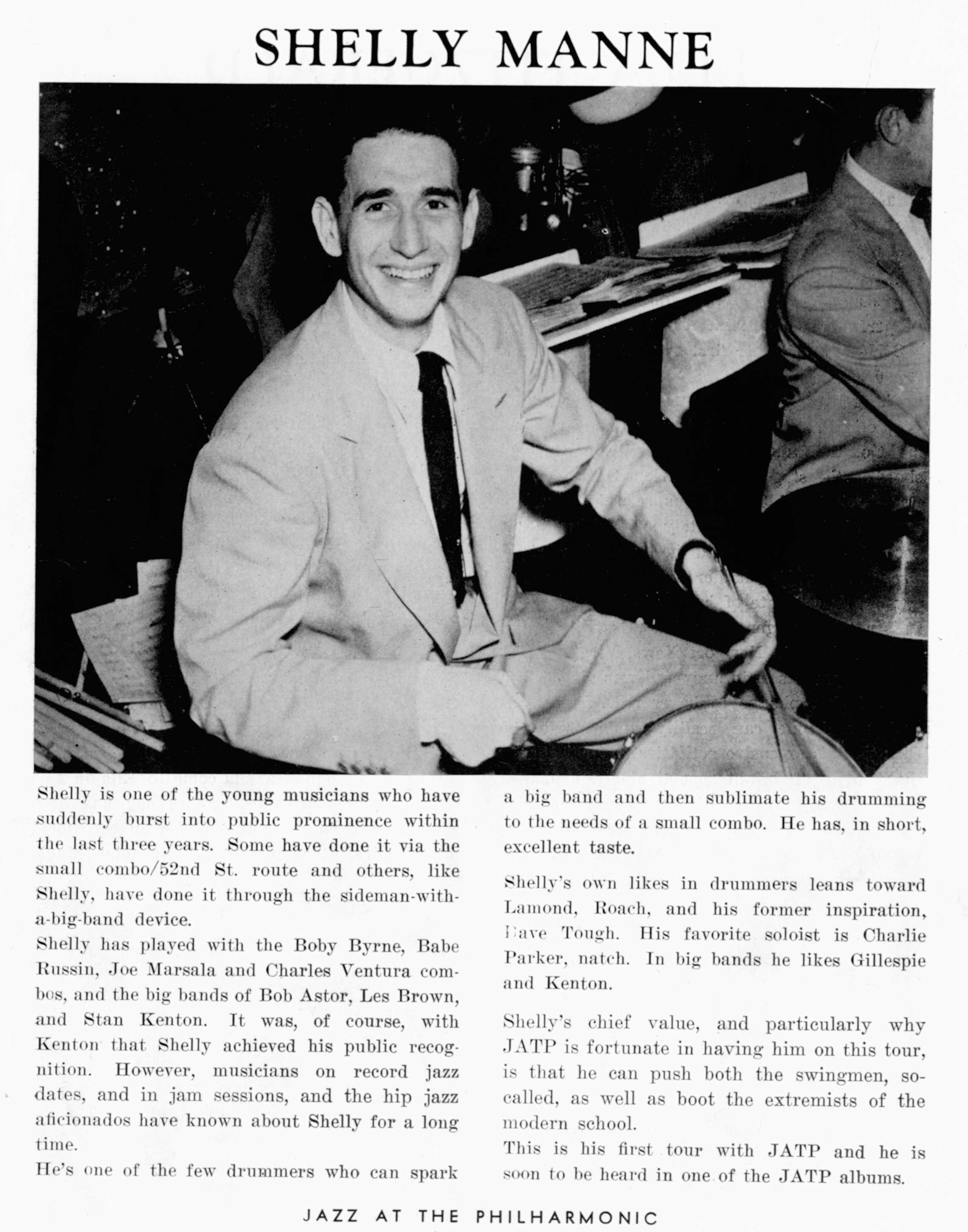 ![]() Shelly Manne December 1946. Photography by William P. Gottlieb Image by William P. Gottlieb, via Wikimedia Commons. Licensed Public domain |