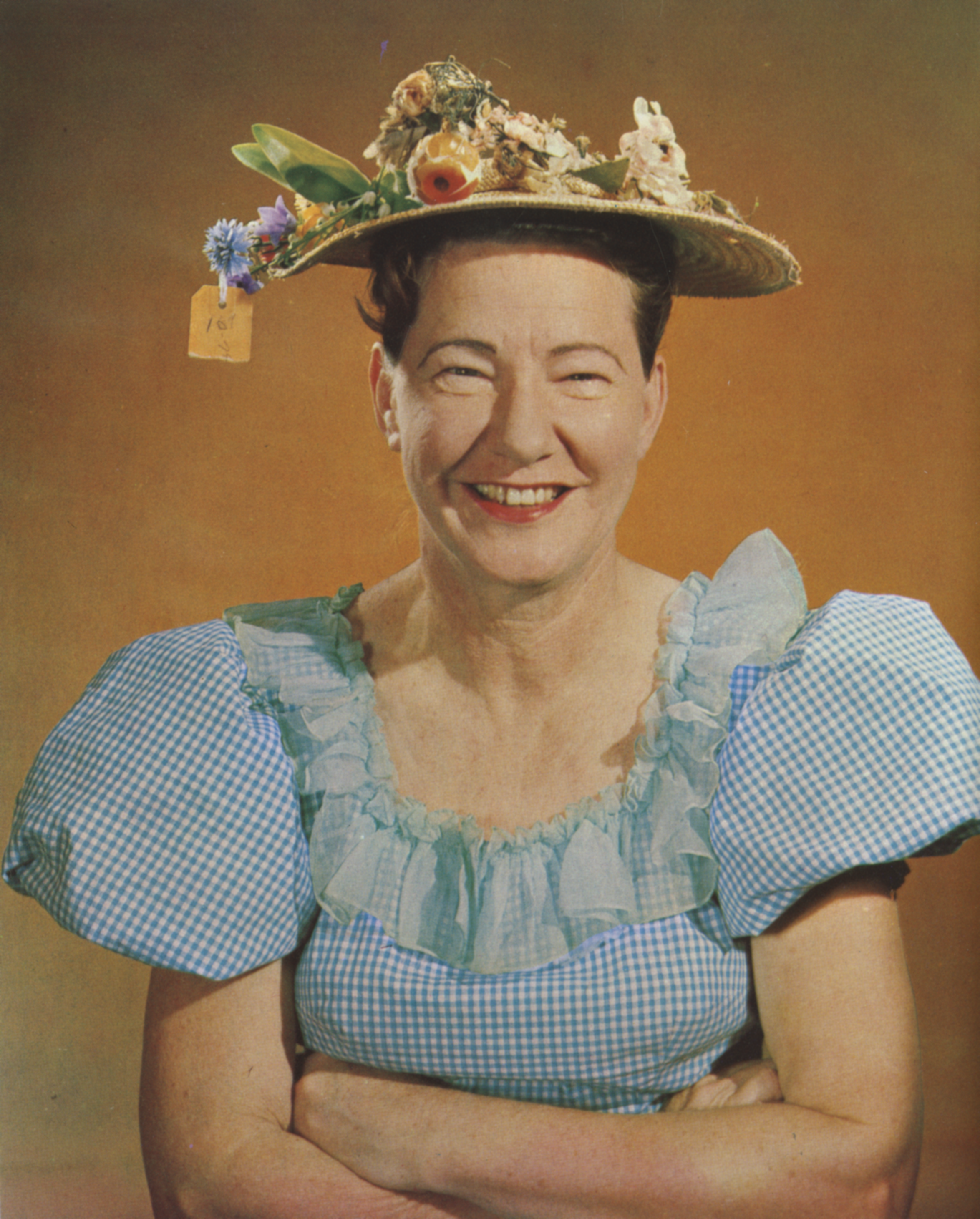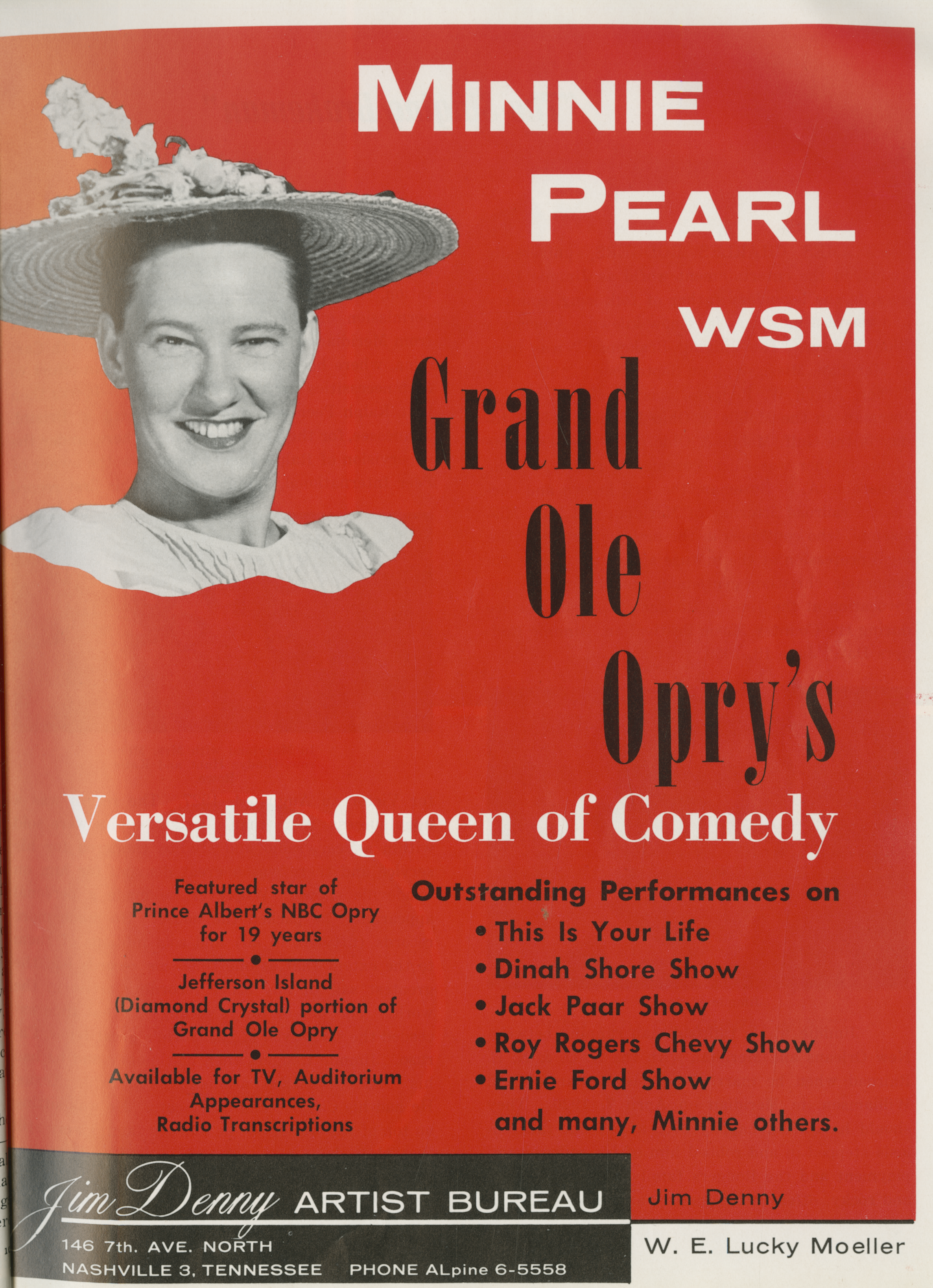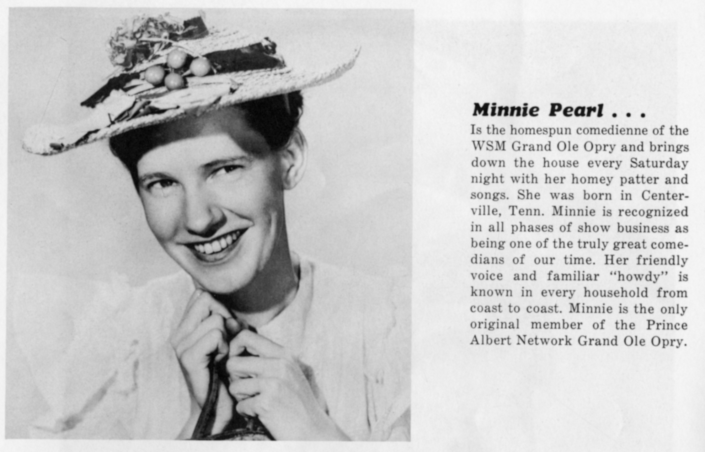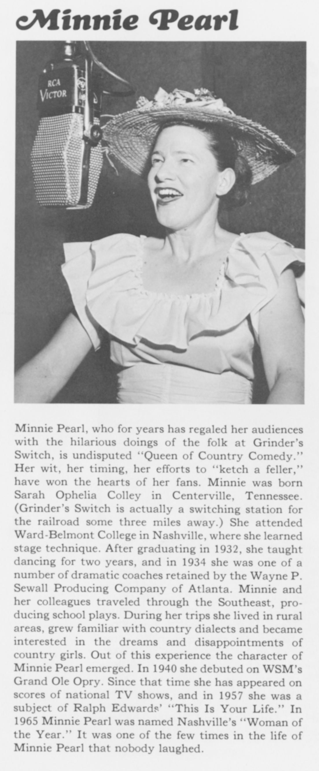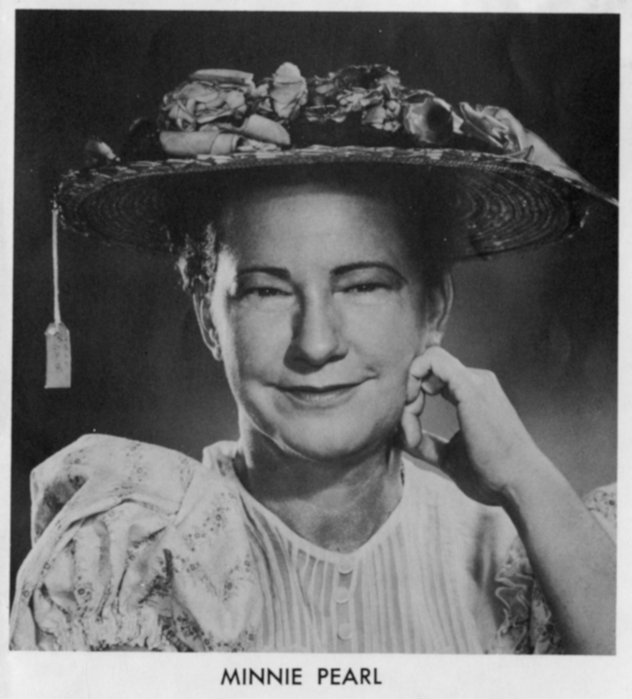 Publicity photo of comedienne Minnie Pearl for appearances made at Chicago's Civic Opera House. Image by Denny-Moeller Talent, Inc. (management company), via Wikimedia Commons. Licensed Public domain |