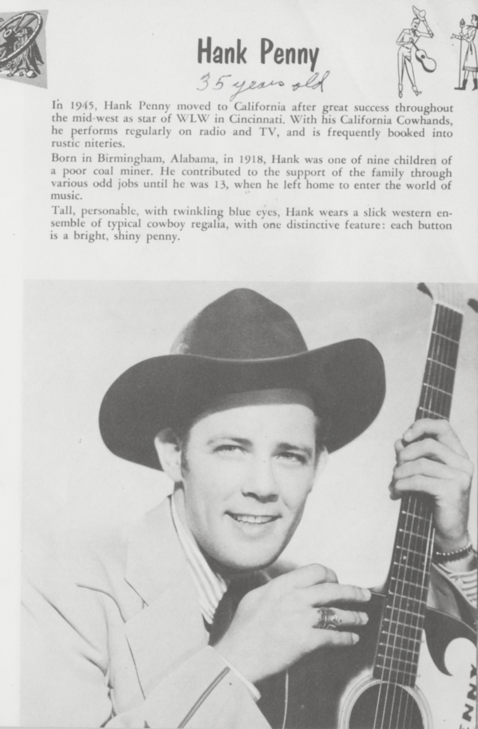 Hank PennyHank Penny Hank Penny American country singer-songwriter (1918–1992) Herbert Clayton Penny (September 18, 1918 – April 17, 1992) was an American musician who sang and played banjo mainly in the Western swing subgenre of country music.[1] He blended country and western music with dixieland, swing, and most notably bebop jazz styles, earning the nickname “the king of hillbilly bebop”. He also worked as a comedian best known for his backwoods character "That Plain Ol' Country Boy" on TV with Spade Cooley. He was married to country singer Sue Thompson from 1953–63. This article needs additional citations for verification. (November 2006) Quick facts Background information, Born ... Hank Penny Background information Born Herbert Clayton Penny (1918-09-18)September 18, 1918 Birmingham, Alabama, U.S.… (Source: Wikipedia)