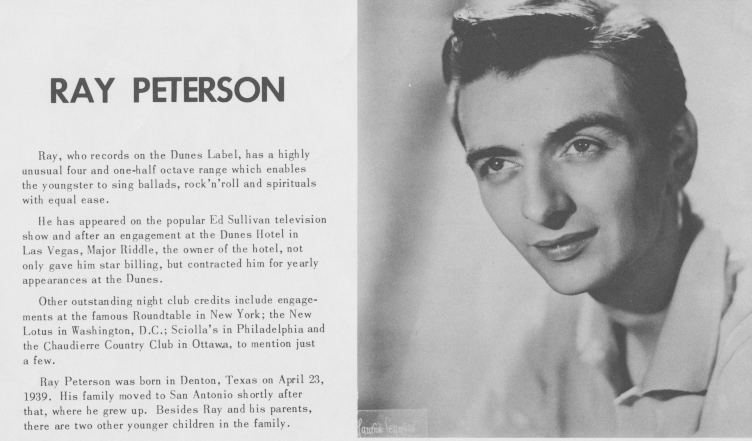 Ray PetersonRay Peterson Ray Peterson American singer (1935–2005) For the American football player, see Ray Peterson (American football). For the Wyoming politician, see R. Ray Peterson. Ray Peterson (April 23, 1935 – January 25, 2005)[1] was an American pop singer who is best remembered for singing "Tell Laura I Love Her". He also scored numerous other hits, including "Corrine, Corrina" and "The Wonder of You".[2] Quick facts Background information, Born ... Ray Peterson Peterson in 1998 Background information Born Ray T. Peterson[1] (1935-04-23)April 23, 1935 Denton, Texas, U.S. Died January 25, 2005(2005-01-25) (aged 69) Smyrna, Tennessee, U.S. Genres Traditional pop, country, rock and roll, rockabilly Occupation Singer Instrument Vocals Years active 1958–2004 Labels RCA Victor, Dunes Records Close Life and career… (Source: Wikipedia)
