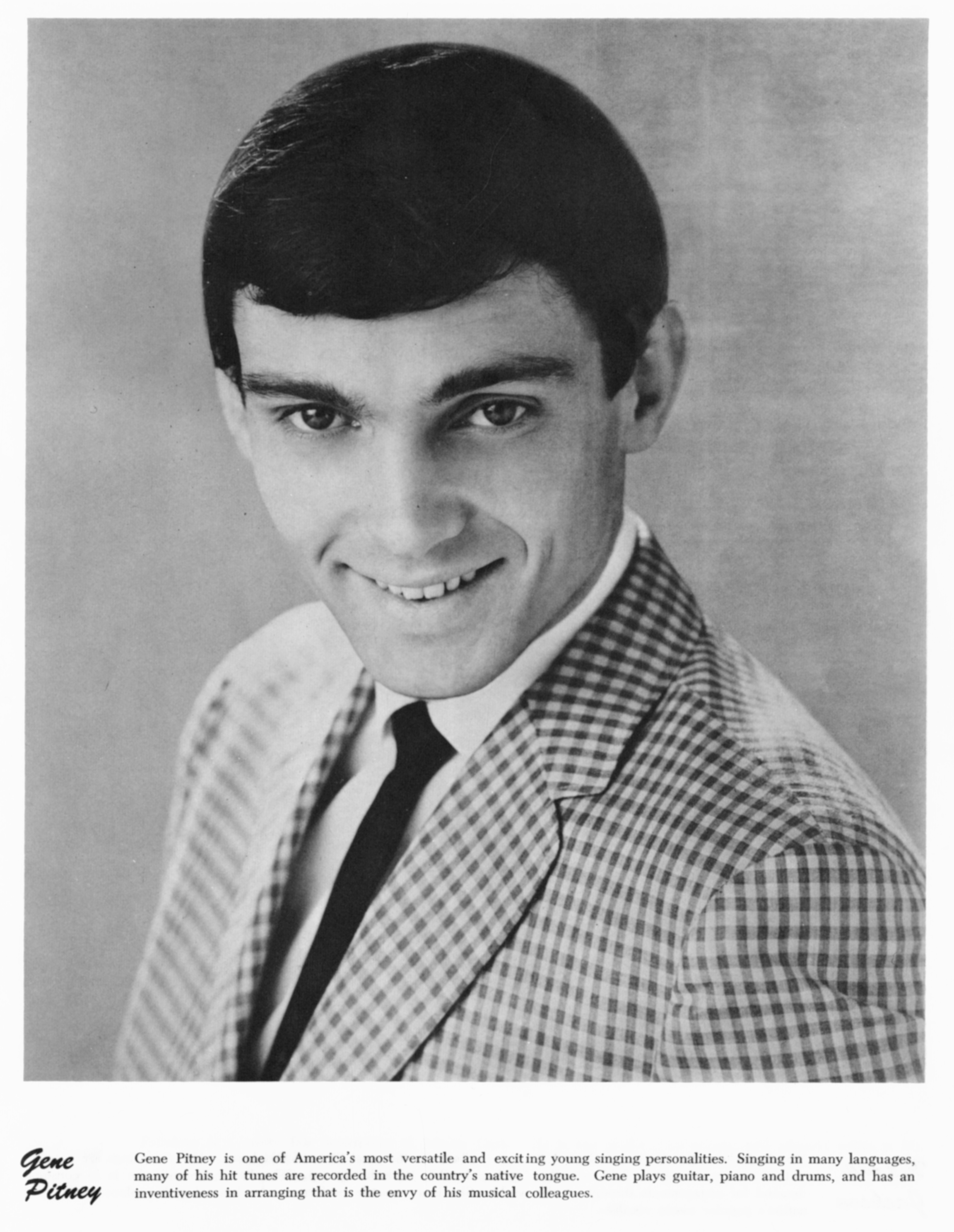 Gene PitneyGene Pitney Gene Pitney American singer and songwriter (1940–2006) Gene Francis Alan Pitney (February 17, 1940 – April 5, 2006) was an American pop and country[1] singer, songwriter, and musician.[2] Quick facts Background information, Also known as ... Gene Pitney Pitney in 1967 Background information Also known as Billy Bryan Born Gene Francis Alan Pitney (1940-02-17)February 17, 1940 Hartford, Connecticut, U.S. Origin Rockville, Connecticut, U.S. Died April 5, 2006(2006-04-05) (aged 66) Cardiff, Wales Genres Pop country Occupations Singer songwriter musician Instruments Vocals guitar piano drums Years active 1958–2006 Labels Musicor Epic Columbia His Master's Voice Close Pitney charted 16 top-40 hits in the United States, four in the top ten. In the United Kingdom, he had 22 top-40 hit singles,… (Source: Wikipedia)