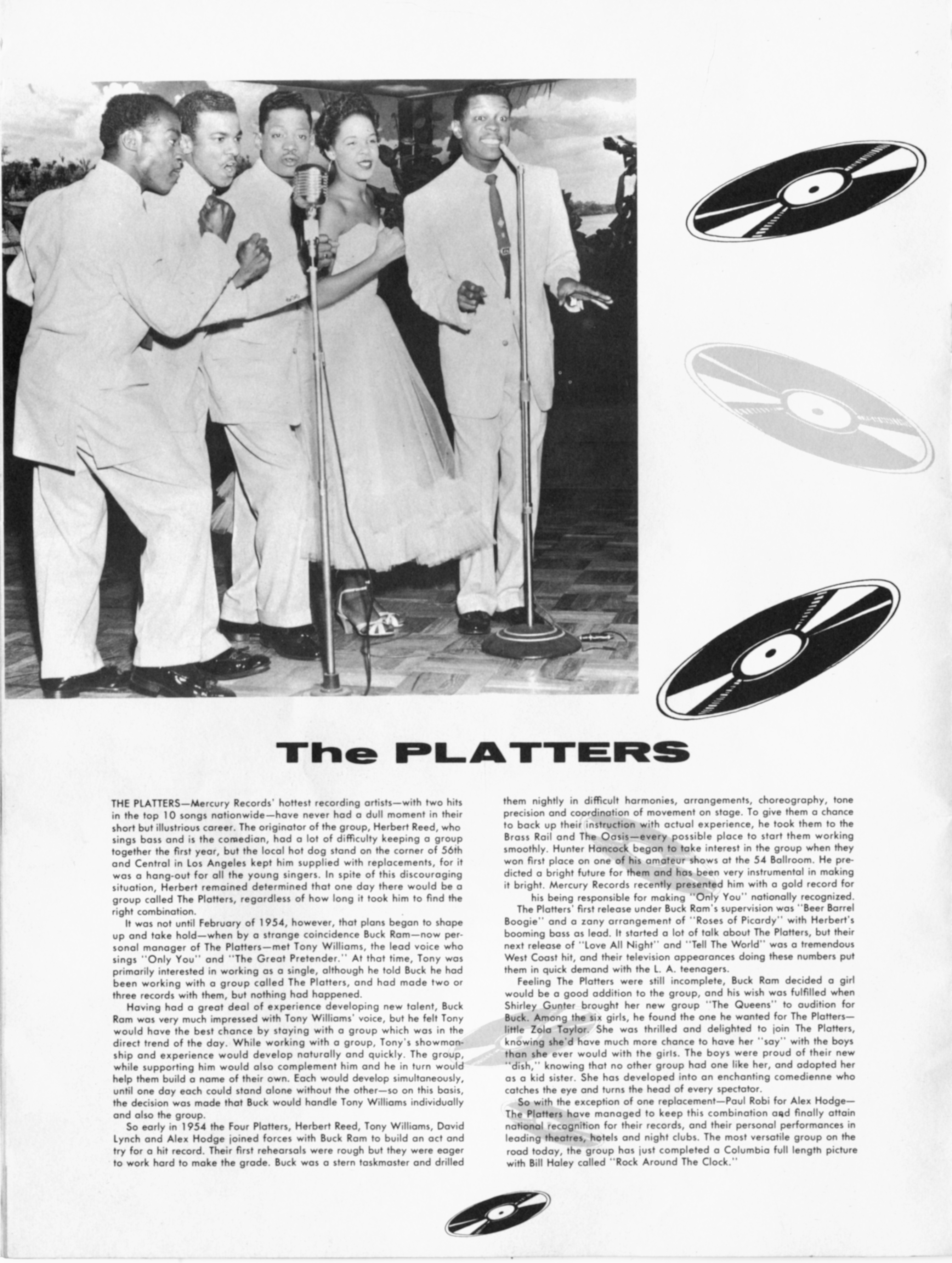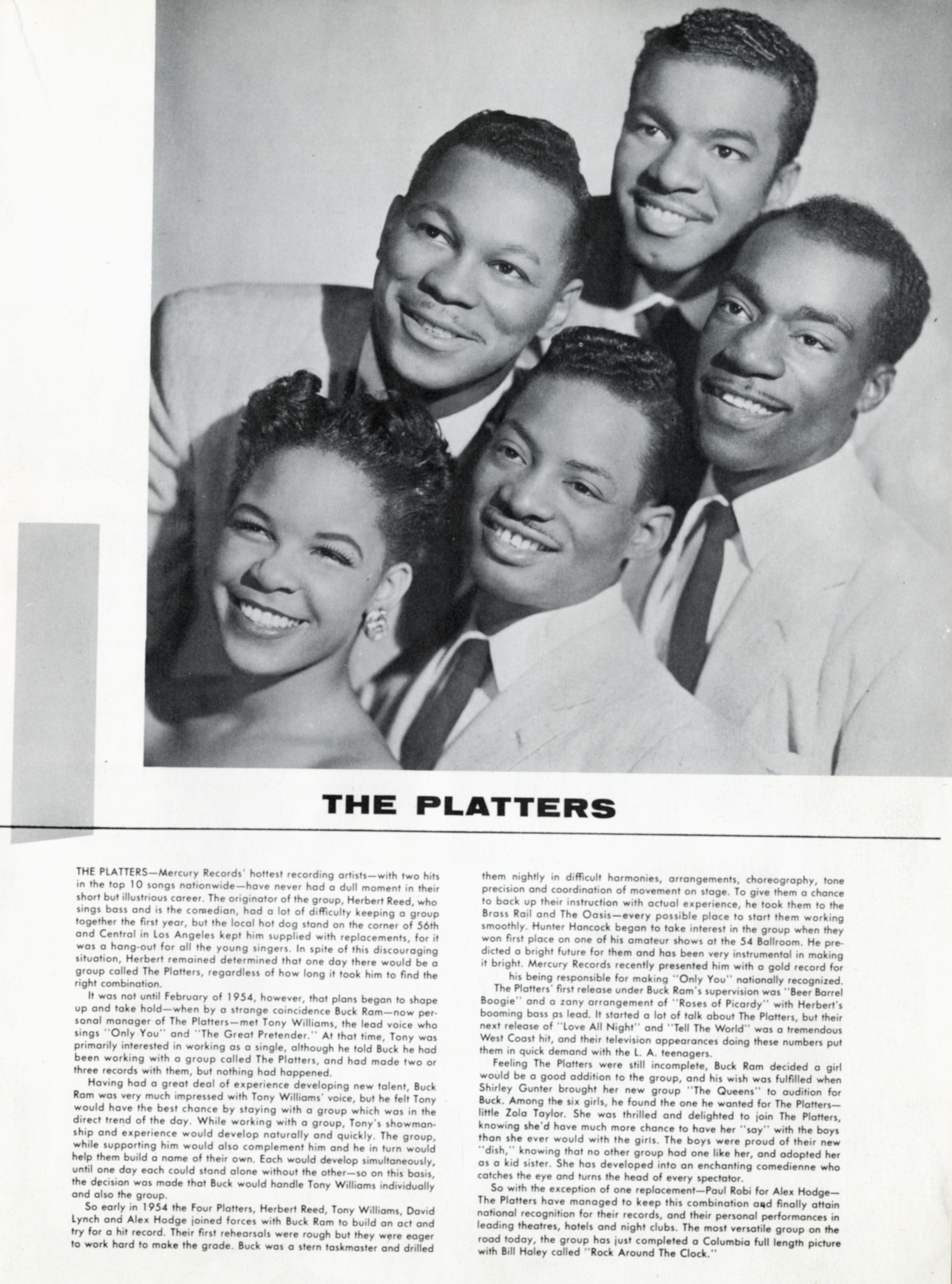 The PlattersThe Platters The Platters American music group The Platters are an American rhythm and blues vocal group formed in 1952. They are one of the most successful vocal bands of the early rock and roll era. Their distinctive sound bridges the pre-rock Tin Pan Alley tradition and the new burgeoning genre. The act has gone through multiple line-ups over the years, earning it the branding tag "Many Voices One Name", with the most successful incarnation comprising lead tenor Tony Williams, David Lynch, Paul Robi, naming member Herb Reed, and Zola Taylor. The Platters had 40 charting singles on the Billboard Hot 100 between 1955 and 1967, including four number-one hits. In 1990, the band was inducted into the Rock and… (Source: Wikipedia)