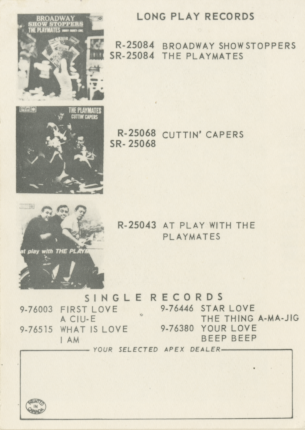 The PlaymatesThe Playmates The Playmates American late 50s vocal group This article is about the novelty singing vocal group. For the children's song by Saxie Dowell, see Playmates (song). The Playmates were an American late 1950s vocal group led by the pianist Chic Hetti (born Carl Cicchetti, 26 February 1930), drummer Donny Conn (born Donald Claps, 29 March 1930 – September 2, 2015), and Morey Carr (31 July 1932 – 1987), all from Waterbury, Connecticut, United States.[1] The "Beep Beep" record cover Career The Playmates—Donald Claps (a.k.a. Donny Conn), drummer and lyricist; Carl Cicchetti (a.k.a. Chic Hetti), pianist music composer; and Morey Cohen (a.k.a. Morey Carr), lead vocalist—were an instrumental and vocal trio, from Waterbury, Connecticut, and, in the early 1950s,… (Source: Wikipedia)