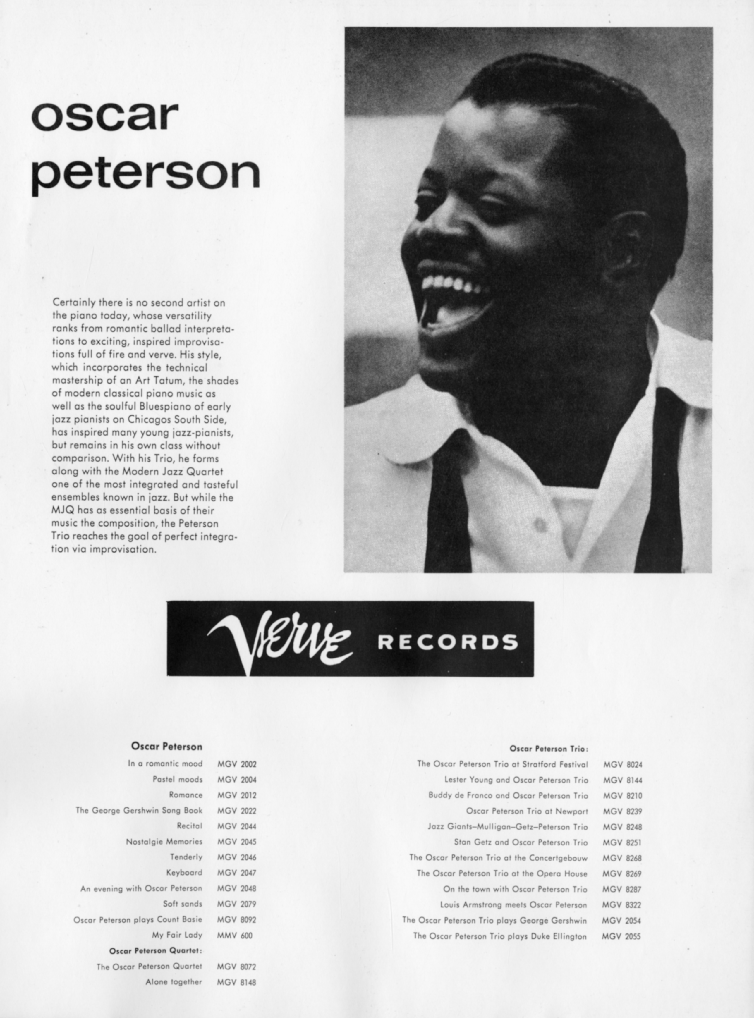 Oscar PetersonOscar Peterson Oscar Peterson Canadian jazz pianist (1925–2007) For the U.S. Navy sailor and Medal of Honor recipient, see Oscar V. Peterson. For the American carver of fish decoys, see Oscar W. Peterson. Oscar Emmanuel Peterson CC CQ OOnt (August 15, 1925 – December 23, 2007)[1] was a Canadian jazz pianist and composer. As a virtuoso who is considered to be one of the greatest jazz pianists of all time, Peterson released more than 200 recordings, won eight Grammy Awards, as well as a lifetime achievement award from the Recording Academy, and received numerous other awards and honours. He played thousands of concerts worldwide in a career lasting more than 60 years. He was called the "Maharaja of the keyboard"… (Source: Wikipedia)