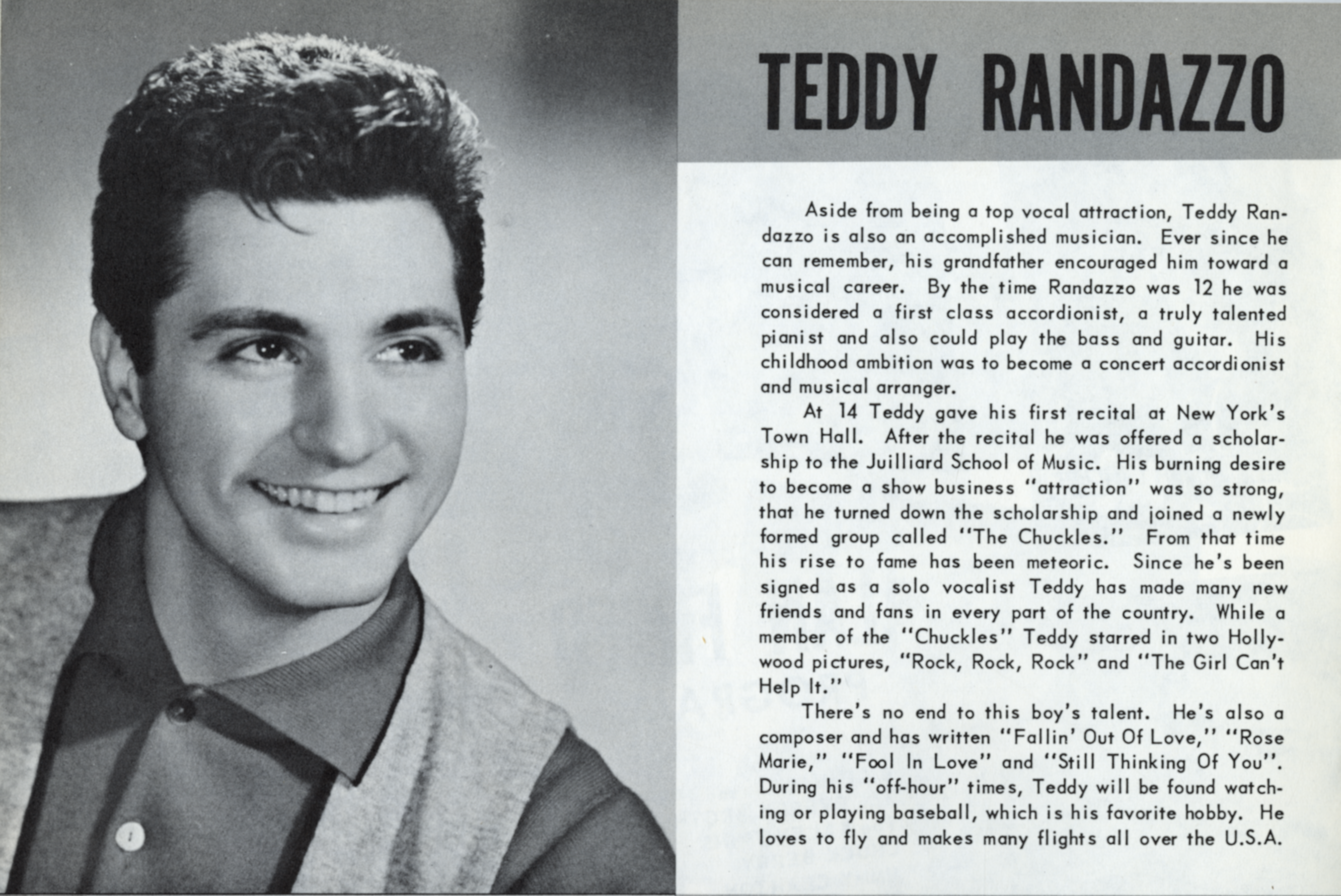 Teddy RandazzoTeddy Randazzo Teddy Randazzo American pop singer-songwriter (1935–2003) Alessandro Carmelo "Teddy" Randazzo (May 13, 1935[1] – November 21, 2003)[2] was an American pop songwriter, singer, arranger, and producer who composed hit songs such as "Goin' Out of My Head", "It's Gonna Take a Miracle", "Pretty Blue Eyes", and "Hurt So Bad" in the 1960s. This article needs additional citations for verification. (April 2013) Quick facts Background information, Born ... Teddy Randazzo Randazzo in 1957 Background information Born Alessandro Carmelo Randazzo (1935-05-13)May 13, 1935 Brooklyn, New York, U.S. Died November 21, 2003(2003-11-21) (aged 68) Orlando, Florida, U.S. Genres Pop Occupations Songwriter, singer, arranger, record producer Years active 1954–1980s Close Early years He was born in Brooklyn.[1] In the early years of… (Source: Wikipedia)