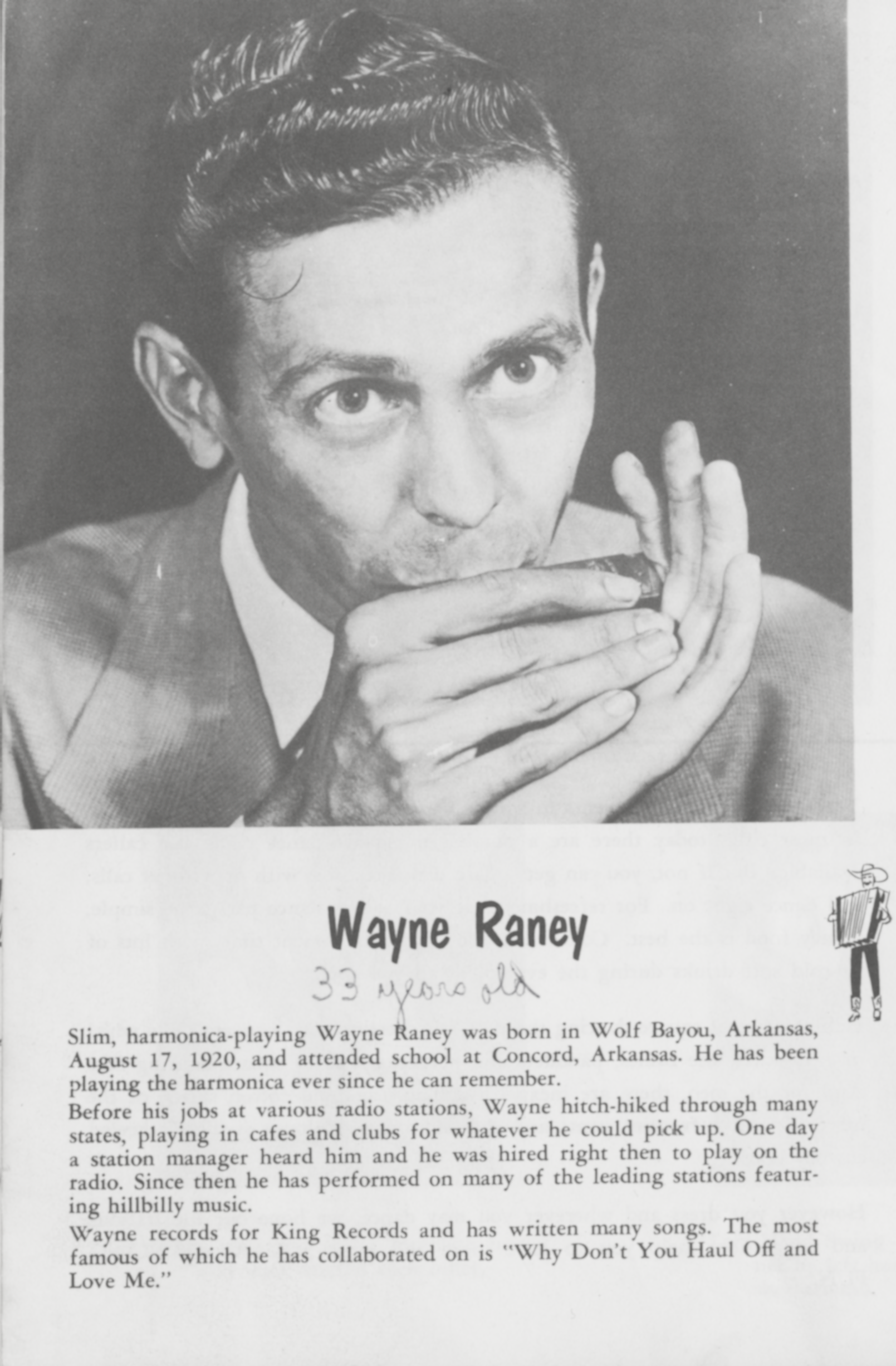 Wayne RaneyWayne Raney Wayne Raney American singer For the motorcycle racer, see Wayne Rainey. Wayne Raney (August 17, 1921[1] – January 23, 1993)[2] was an American country singer and harmonica player. Quick facts Background information, Born ... Wayne Raney Wayne Raney, Schaeffer Studio, Hollywood, California, 1950 Background information Born (1921-08-17)August 17, 1921 Wolf Bayou, Arkansas, United States Died January 23, 1993(1993-01-23) (aged 71) Arkansas, United States Genres Country Occupations musician, singer Instrument Harmonica Years active 1934–1980s Close Biography Raney was born on a farm near Wolf Bayou, Cleburne County, Arkansas, United States,[1] the youngest of five children of William Franklin (Frank) Raney and Bonnie Davis Raney. Born with a foot deformity, he could not do heavy labor.[3] After learning to play… (Source: Wikipedia)