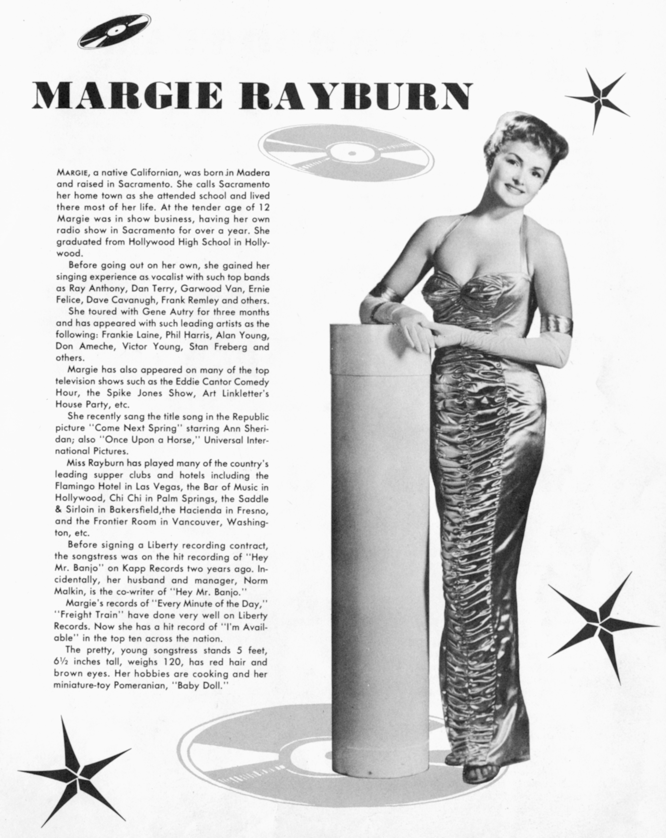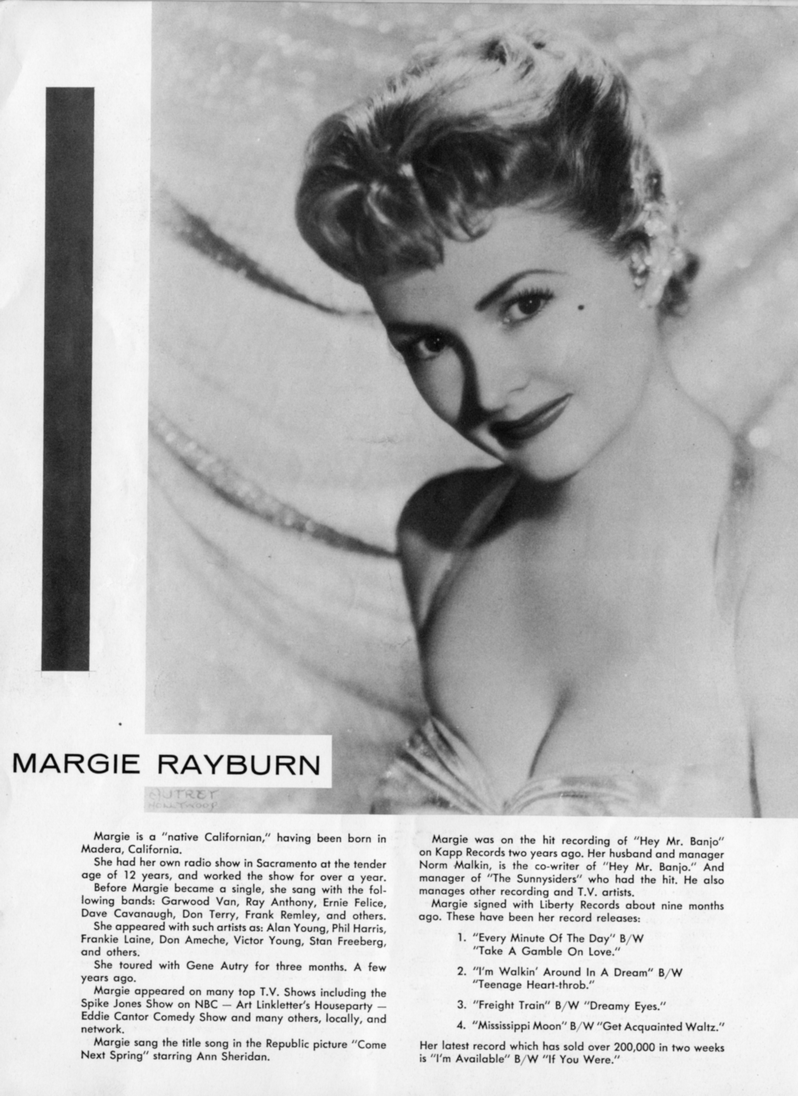 Margie RayburnMargie Rayburn Margie Rayburn American singer Marjorie Helen Orwig (June 3, 1924 – June 14, 2000),[1] better known as Margie Rayburn, was an American traditional pop singer.[2] Rayburn was born in Madera, California, United States,[2] and sang as a member of The Sunnysiders, who had a Top 40 hit in the United States in 1955 with the song "Hey! Mr. Banjo".[3] Rayburn married Norman Malkin, also a member of the Sunnysiders.[3] She also had a Top Ten hit of her own in 1957 with the song "I'm Available", which was written by Dave Burgess.[2] The single, released on Liberty Records, reached No. 9 on the Billboard Hot 100 in November 1957.[2] As a songwriter she co-wrote with Malkin the 1963… (Source: Wikipedia)