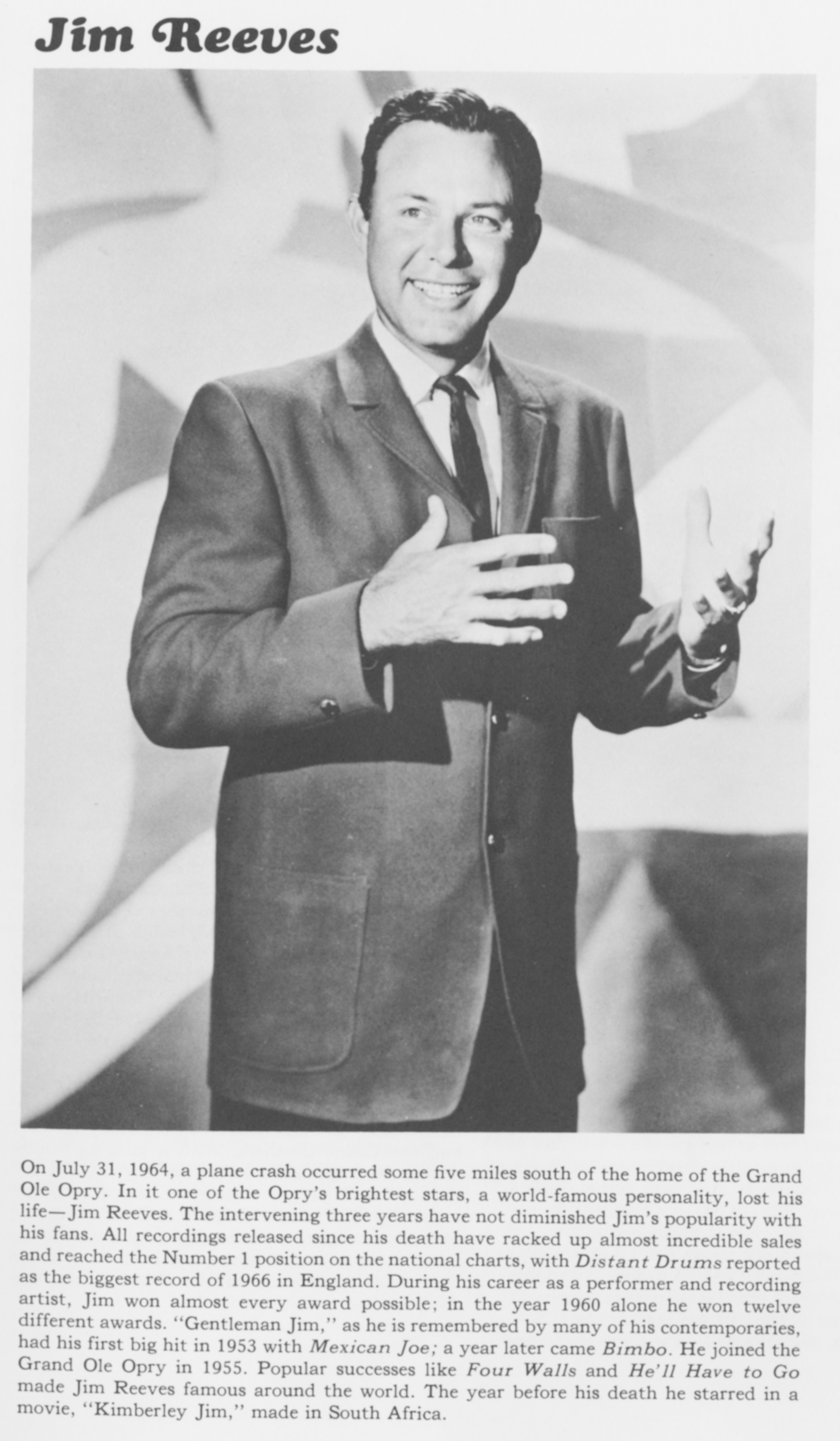 Jim ReevesJim Reeves Jim Reeves American singer (1923–1964) James Travis Reeves (August 20, 1923 – July 31, 1964) was an American singer, songwriter, and musician. One of the earliest pioneers and practitioners of the Nashville sound, he played a central role in the sonic development of country music in the 1960s. Known as "Gentleman Jim", his songs continued to chart for years after his death in a plane crash. He is a member of both the Country Music and Texas Country Music Halls of Fame. Quick facts Background information, Also known as ... Jim Reeves Reeves in 1963 Background information Also known as Gentleman Jim Born James Travis Reeves (1923-08-20)August 20, 1923 Galloway, Texas, U.S. Died July 31, 1964(1964-07-31) (aged 40)… (Source: Wikipedia)