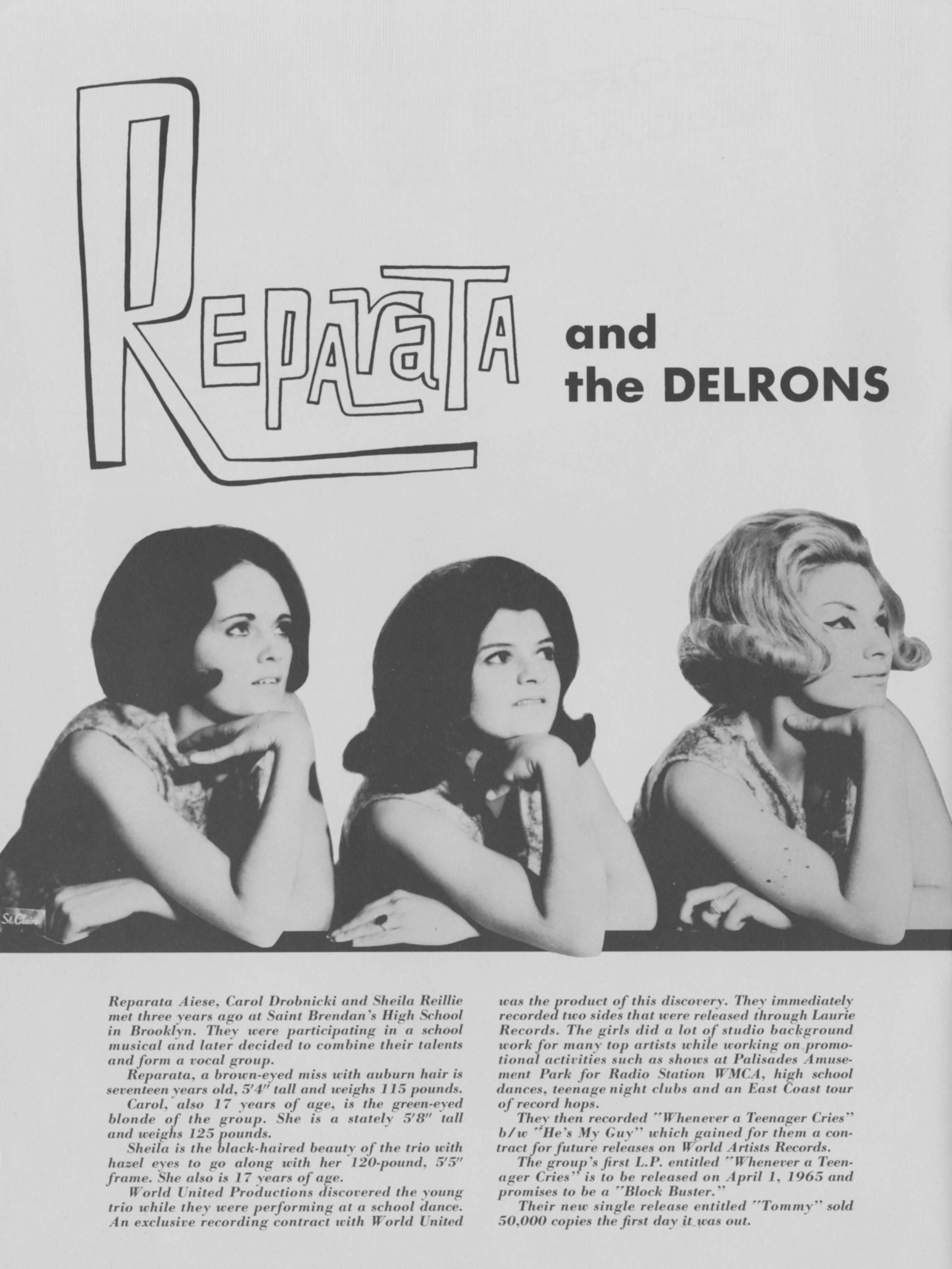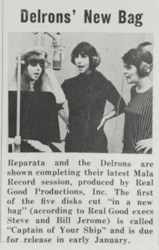 Reparata & The DelronsReparata and the Delrons Reparata and the Delrons American girl group (1962–2000) Reparata and the Delrons were an American girl group. They are best known for their 1965 recordings "Whenever a Teenager Cries" and "Tommy", for the 1968 European hit "Captain of Your Ship" and for Reparata's 1975 solo hit "Shoes". Quick facts Background information, Origin ... Reparata and the Delrons Classic line-up, 1965–1969: (l-r) Lorraine Mazzola, Nanette Licari, Mary "Reparata" Aiese Background information Origin New York City, United States Genres Pop Years active 1962–2000 Labels Laurie World Artists Stateside RCA Mala Bell Kapp Avco Embassy Big Tree Dart North American Music Industries Polydor Perfection Sound Mo-Banana Ace Past members Reparata (Mary Aiese O'Leary) Nanette Licari Regina Gallagher Anne Fitzgerald… (Source: Wikipedia)